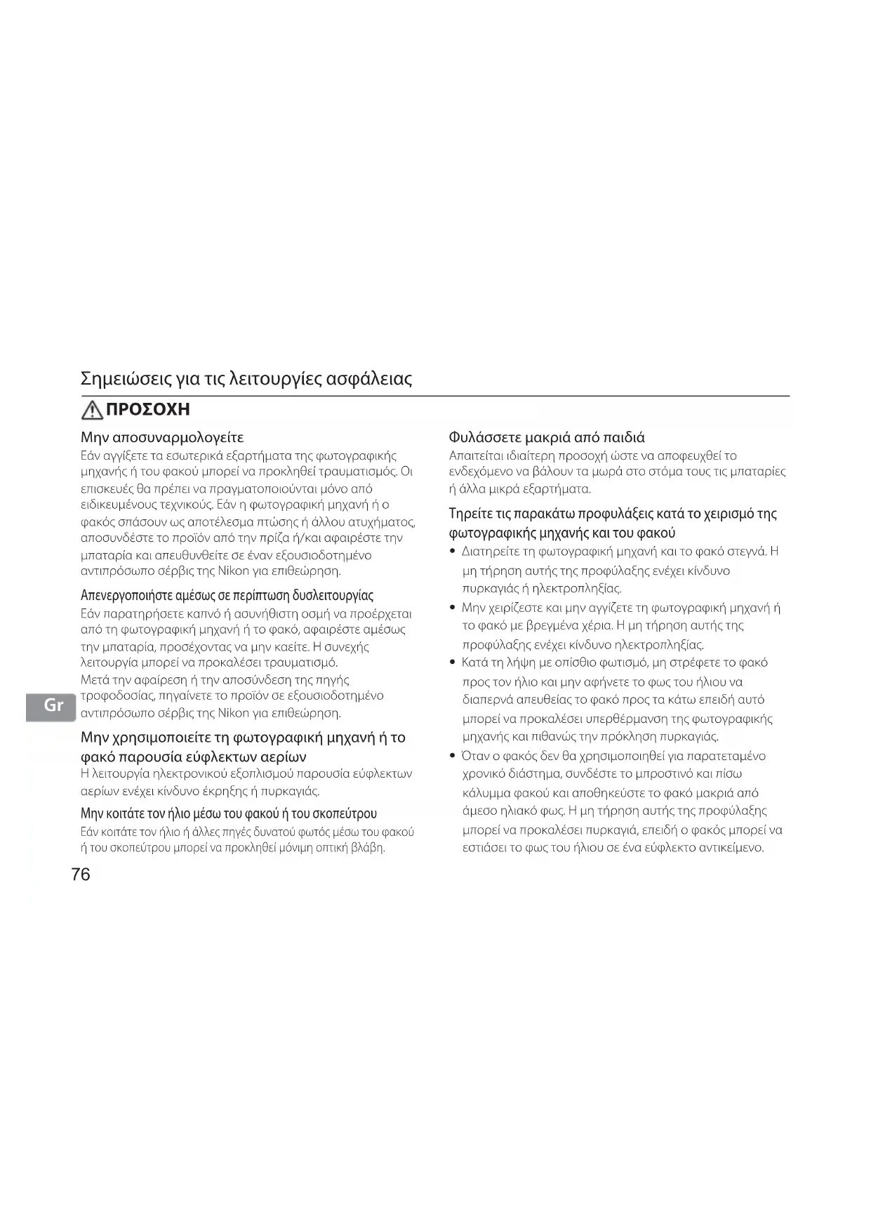 Μην αποσυναρμολογείτε Εάν αγγίξετε τα εσωτερικά εξαρτήματα της φωτογραφικής μηχανής ή του φακού μπορεί να προκληθεί τραυματισμός. Οι επισκευές θα πρέπει να πραγματοποιούνται μόνο από ειδικευμένους τεχνικούς. Εάν η φωτογραφική μηχανή ή ο φακός σπάσουν ως αποτέλεσμα πτώσης ή άλλου ατυχήματος, αποσυνδέστε το προϊόν από την πρίζα ή/και αφαιρέστε την μπαταρία και απευθυνθείτε σε έναν εξουσιοδοτημένο αντιπρόσωπο σέρβις της Nikon για επιθεώρηση. Απενεργοποιήστε αμέσως σε περίπτωση δυσλειτουργίας Εάν παρατηρήσετε καπνό ή ασυνήθιστη οσμή να προέρχεται από τη φωτογραφική μηχανή ή το φακό, αφαιρέστε αμέσως την μπαταρία, προσέχοντας να μην καείτε. Η συνεχής λειτουργία μπορεί να προκαλέσει τραυματισμό. Μετά την αφαίρεση ή την αποσύνδεση της πηγής τροφοδοσίας, πηγαίνετε το προϊόν σε εξουσιοδοτημένο αντιπρόσωπο σέρβις της Nikon για επιθεώρηση. Μην χρησιμοποιείτε τη φωτογραφική μηχανή ή το φακό παρουσία εύφλεκτων αερίων Η λειτουργία ηλεκτρονικού εξοπλισμού παρουσία εύφλεκτων αερίων ενέχει κίνδυνο έκρηξης ή πυρκαγιάς. Μην κοιτάτε τον ήλιο μέσω του φακού ή του σκοπεύτρου Εάν κοιτάτε τον ήλιο ή άλλες πηγές δυνατού φωτός μέσω του φακού ή του σκοπεύτρου μπορεί να προκληθεί μόνιμη οπτική βλάβη. Φυλάσσετε μακριά από παιδιά Απαιτείται ιδιαίτερη προσοχή ώστε να αποφευχθεί το ενδεχόμενο να βάλουν τα μωρά στο στόμα τους τις μπαταρίες ή άλλα μικρά εξαρτήματα. Τηρείτε τις παρακάτω προφυλάξεις κατά το χειρισμό της φωτογραφικής μηχανής και του φακού
