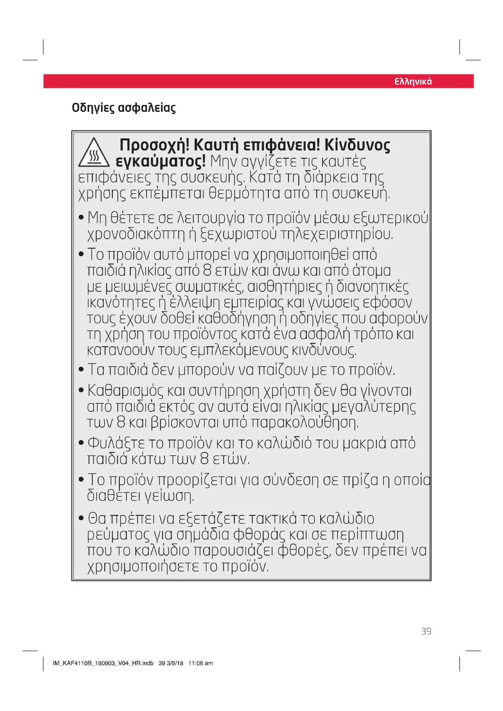 - Για να μειωθεί ο κίνδυνος πυρκαγιάς και ηλεκτροπληξίας, μην εκθέτετε το προϊόν σε φωτιά (τζάκι, σχάρα, κεριά, τσιγάρα κ.ο.κ) ή σε νερό (σταγόνες νερού, πιτσιλιές νερού, βάζα, μπανιέρες, δεξαμενές κ.ο.κ.). IM_KAF4110B_180803_V04_HR.indb 41 3/8/18 11:06 amSize - A5