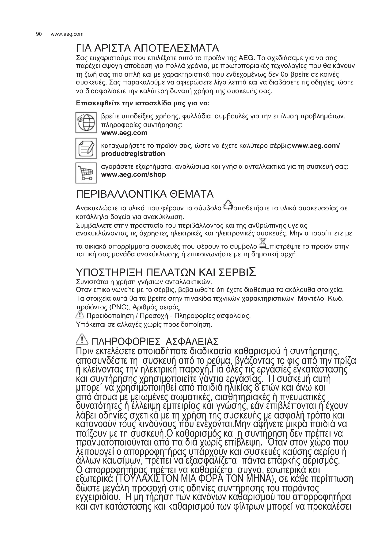 ΓΙΑ ΑΡΙΣΤΑ ΑΠΟΤΕΛΕΣΜΑΤΑ Σας ευχαριστούμε που επιλέξατε αυτό το προϊόν της AEG. Το σχεδιάσαμε για να σας παρέχει άψογη απόδοση για πολλά χρόνια, με πρωτοποριακές τεχνολογίες που θα κάνουν τη ζωή σας πιο απλή και με χαρακτηριστικά που ενδεχομένως δεν θα βρείτε σε κοινές συσκευές. Σας παρακαλούμε να αφιερώσετε λίγα λεπτά και να διαβάσετε τις οδηγίες, ώστε να διασφαλίσετε την καλύτερη δυνατή χρήση της συσκευής σας. Επισκεφθείτε την ιστοσελίδα μας για να: βρείτε υποδείξεις χρήσης, φυλλάδια, συμβουλές για την επίλυση προβλημάτων, πληροφορίες συντήρησης: www.aeg.com καταχωρήσετε το προϊόν σας, ώστε να έχετε καλύτερο σέρβις:www.aeg.com/ productregistration αγοράσετε εξαρτήματα, αναλώσιμα και γνήσια ανταλλακτικά για τη συσκευή σας: www.aeg.com/shop ΠΕΡΙΒΑΛΛΟΝΤΙΚΑ ΘΕΜΑΤΑ Ανακυκλώστε τα υλικά που φέρουν το σύμβολο . Τοποθετήστε τα υλικά συσκευασίας σε κατάλληλα δοχεία για ανακύκλωση. Συμβάλλετε στην προστασία του περιβάλλοντος και της ανθρώπινης υγείας ανακυκλώνοντας τις άχρηστες ηλεκτρικές και ηλεκτρονικές συσκευές. Μην απορρίπτετε με τα οικιακά απορρίμματα συσκευές που φέρουν το σύμβολο . Επιστρέψτε το προϊόν στην τοπική σας μονάδα ανακύκλωσης ή επικοινωνήστε με τη δημοτική αρχή. ΥΠΟΣΤΗΡΙΞΗ ΠΕΛΑΤΩΝ ΚΑΙ ΣΕΡΒΙΣ Συνιστάται η χρήση γνήσιων ανταλλακτικών. Όταν επικοινωνείτε με το σέρβις, βεβαιωθείτε ότι έχετε διαθέσιμα τα ακόλουθα στοιχεία. Τα στοιχεία αυτά θα τα βρείτε στην πινακίδα τεχνικών χαρακτηριστικών. Μοντέλο, Κωδ. προϊόντος (PNC), Αριθμός σειράς. Προειδοποίηση / Προσοχή - Πληροφορίες ασφαλείας. Υπόκειται σε αλλαγές χωρίς προειδοποίηση. ΠΛΗΡΟΦΟΡΙΕΣ ΑΣΦΑΛΕΙΑΣ Πριν εκτελέσετε οποιαδήποτε διαδικασία καθαρισμού ή συντήρησης, αποσυνδέστε τη συσκευή από το ρεύμα, βγάζοντας το φις από την πρίζα ή κλείνοντας την ηλεκτρική παροχή.Για όλες τις εργασίες εγκατάστασης και συντήρησης χρησιμοποιείτε γάντια εργασίας. Η συσκευή αυτή μπορεί να χρησιμοποιηθεί από παιδιά ηλικίας 8 ετών και άνω και από άτομα με μειωμένες σωματικές, αισθητηριακές ή πνευματικές δυνατότητες ή έλλειψη εμπειρίας και γνώσης, εάν επιβλέπονται ή έχουν λάβει οδηγίες σχετικά με τη χρήση της συσκευής με ασφαλή τρόπο και κατανοούν τους κινδύνους που ενέχονται.Μην αφήνετε μικρά παιδιά να παίζουν με τη συσκευή.Ο καθαρισμός και η συντήρηση δεν πρέπει να πραγματοποιούνται από παιδιά χωρίς επίβλεψη. Όταν στον χώρο που λειτουργεί ο απορροφητήρας υπάρχουν και συσκευές καύσης αερίου ή άλλων καυσίμων, πρέπει να εξασφαλίζεται πάντα επαρκής αερισμός. Ο απορροφητήρας πρέπει να καθαρίζεται συχνά, εσωτερικά και εξωτερικά (ΤΟΥΛΑΧΙΣΤΟΝ ΜΙΑ ΦΟΡΑ ΤΟΝ ΜΗΝΑ), σε κάθε περίπτωση δώστε μεγάλη προσοχή στις οδηγίες συντήρησης του παρόντος εγχειριδίου. Η μη τήρηση των κανόνων καθαρισμού του απορροφητήρα και αντικατάστασης και καθαρισμού των φίλτρων μπορεί να προκαλέσει EL ΟΔΗΓΊΕΣ ΧΡΉΣΗΣ91