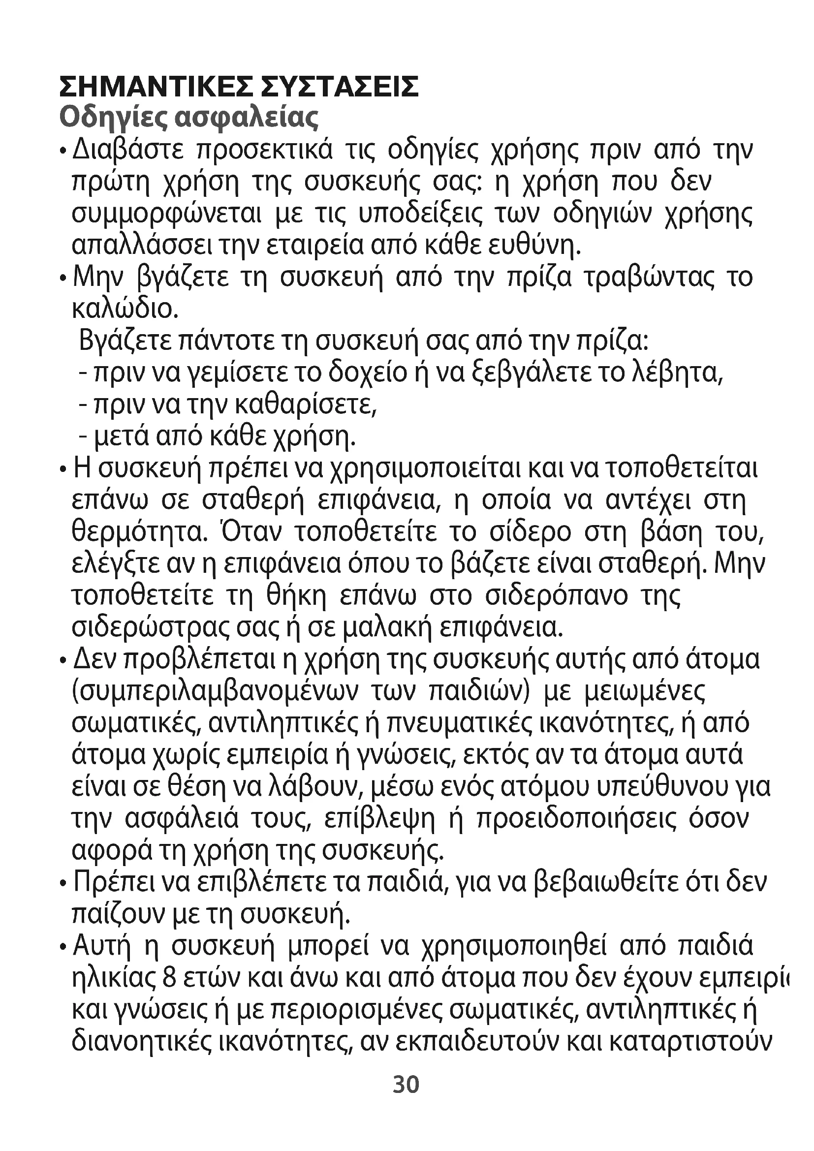 - Αυτή η συσκευή μπορεί να χρησιμοποιηθεί από παιδιά ηλικίας 8 ετών και άνω και από άτομα που δεν έχουν εμπειρία και γνώσεις ή με περιορισμένες σωματικές, αντιληπτικές ή διανοητικές ικανότητες, αν εκπαιδευτούν και καταρτιστούν 1800128430_01 _GV5010E0_110x154 30/11/12 11:54 Page3031 στη χρήση της συσκευής με ασφαλή τρόπο και γνωρίζουν τους κινδύνους που διατρέχουν. Τα παιδιά δεν πρέπει να παίζουν με τη συσκευή. Ο καθαρισμός και η συντήρηση από το χρήστη δεν πρέπει να πραγματοποιείται από παιδιά, παρά μόνο αν έχουν ηλικία από 8 ετών και άνω και επιβλέπονται. Διατηρείτε τη συσκευή και το καλώδιό της σε μέρος που να μην τη φτάνουν παιδιά μικρότερα από 8 ετών.