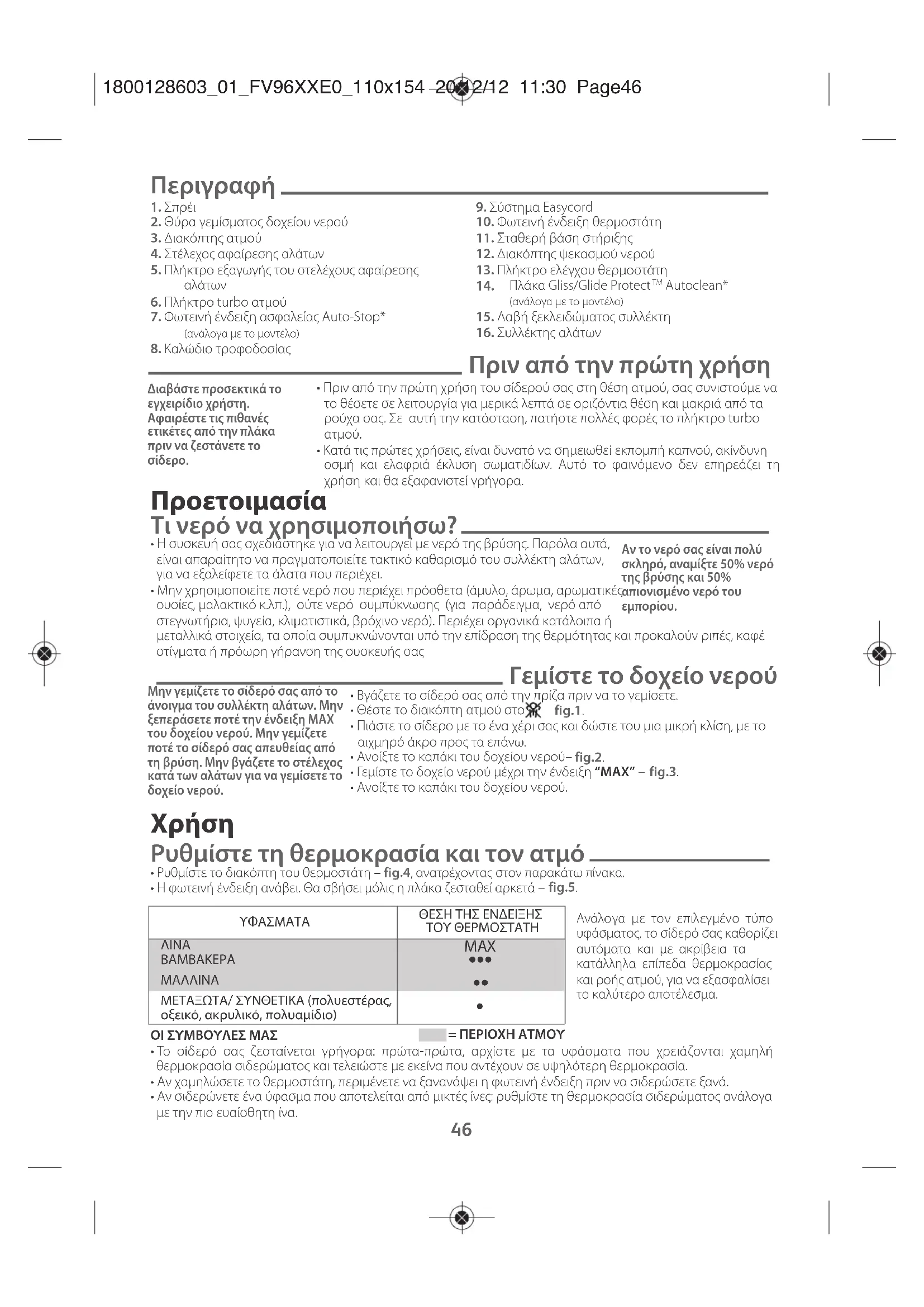 Το σίδερο δεν μπορεί να λειτουργήσει χωρίς το συλλέκτη αλάτων. Μην χρησιμοποιείτε ποτέ επιθετικά ή διαβρωτικά προϊόντα. 1800128603_01_FV96XXE0_110x154 20/12/12 11:30 Page48ΠΡΟΒΛΗΜΑ ΠΙΘΑΝΑ ΑΙΤΙΑ ΛΥΣΕΙΣ Τρέχει νερό από τις οπές της