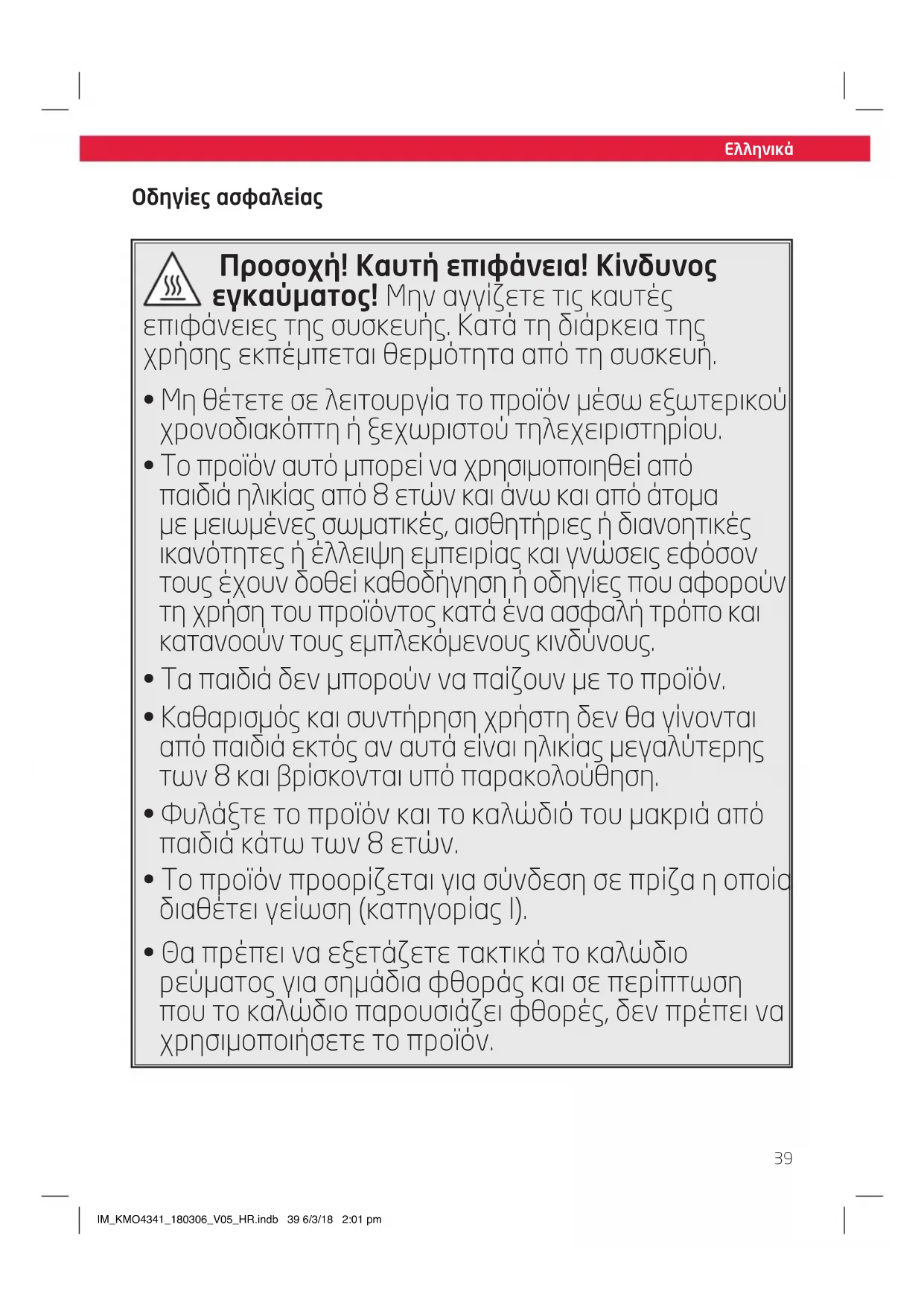 - Θα πρέπει να εξετάζετε τακτικά το καλώδιο ρεύματος για σημάδια φθοράς και σε περίπτωση που το καλώδιο παρουσιάζει φθορές, δεν πρέπει να χρησιμοποιήσετε το προϊόν. IM_KMO4341_180306_V05_HR.indb 39 6/3/18 2:01 pmSize - A5