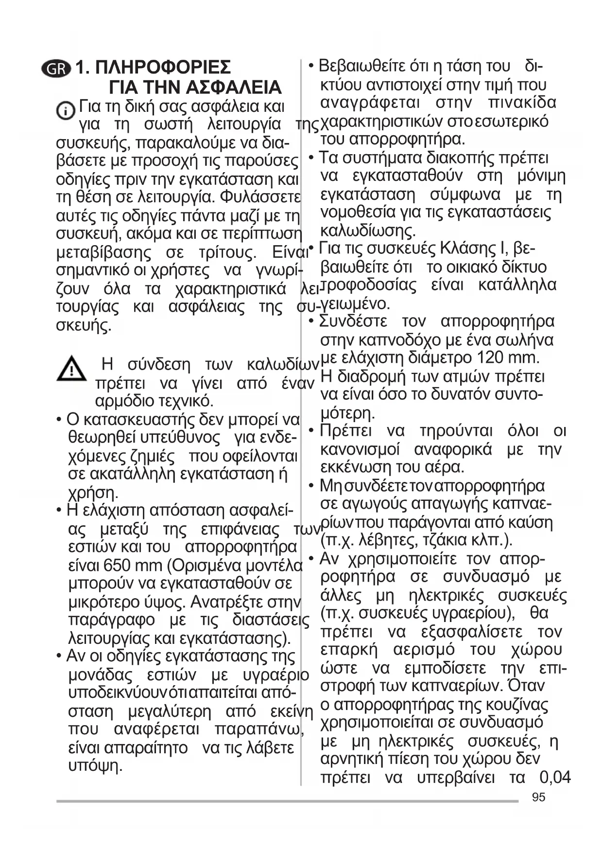 - Αν χρησιμοποιείτε τον απορ- ροφητήρα σε συνδυασμό με άλλες μη ηλεκτρικές συσκευές (π.χ.συσκευέςυγραερίου), θα πρέπει να εξασφαλίσετε τον επαρκή αερισμό του χώρου ώστε να εμποδίσετε την επι- στροφήτωνκαπναερίων.Όταν οαπορροφητήραςτηςκουζίνας χρησιμοποιείταισεσυνδυασμό με μη ηλεκτρικές συσκευές, η αρνητικήπίεσητουχώρουδεν πρέπει να υπερβαίνει τα 0,04 GR96 mbarέτσιώστενααποφεύγεται η επιστροφή των καπναερίων στο χώρο και η αναρρόφησή τουςαπότοναπορροφητήρα.