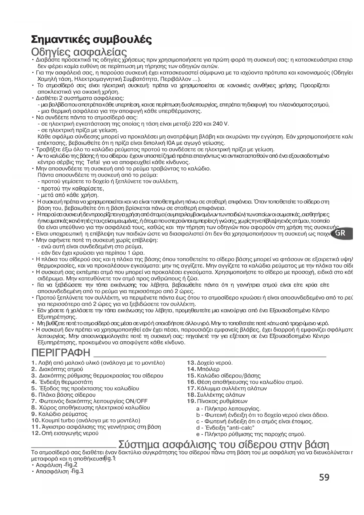 ΣΣηηµµααννττιικκFFAA σσυυµµββοουυλλFFAA ΟΟδδηηγγεε αασσφφααλλεεαα ∆ιαβστε προσεκτικ τι οδηγε χρσεω πριν χρησιµοποισετε για πρτη φορ τη συσκευ σα: η κατασκευστρια εταιρεα εν φρει καµα ευθνη σε περπτωση µη τρηση των οδηγιν αυτν. Για την ασφλει σα, η παροσα συσκευ χει κατασκευαστε σµφωνα µε τα ισχοντα πρτυπα και κανονισµο (Οδηγε για αµηλ τση, Ηλεκτροµαγνητικ Συµβαττητα, Περιβλλον ...). To ατµοσδερ σα εναι ηλεκτρικ συσκευ: πρπει να χρησιµοποιεται σε κανονικ συνθκε χρση. Προορζεται αποκλειστικ για οικιακ χρση. ∆ιαθτει 2 συστµατα ασφλεια: µια βαλβδα που αποτρπει κθε υπερπεση, και σε περπτωση δυσλειτουργα, επιτρπει τη διαφυγ του πλεονσµατο ατµο, µια θερµικ ασφλεια για την αποφυγ κθε υπερθρµανση. Να συνδετε πντα το ατµοσδερ σα: σε ηλεκτρικ εγκατσταση τη οποα η τση εναι µεταξ 220 και 240 V. σε ηλεκτρικ πρζα µε γεωση. θε σφλµα σνδεση µπορε να προκαλσει µη ανατρψιµη βλβη και ακυρνει την εγγηση. Εν χρησιµοποισετε καλδιοεπκταση, βεβαιωθετε τι η πρζα εναι διπολικ I0A µε αγωγ γεωση. Tραβξτε ξω λο το καλδιο ρεµατο προτο το συνδσετε σε ηλεκτρικ πρζα µε γεωση. Αν το καλδιο τη βση του σδερου χουν υποστε ζηµι πρπει επειγντω να αντικατασταθον απ να εξουσιοδοτηµνο κντρο σρβι τη Tefal για να αποφευχθε κθε κνδυνο. Μην αποσυνδετε τη συσκευ απ το ρεµα τραβντα το καλδιο.Πντα αποσυνδετε τη συσκευ απ το ρεµα: προτο γεµσετε το δοχεο ξεπλνετε τον συλλκτη,- ÚÔÙÔ‡ ÙËÓ Î·ı·Ú›ÛÂÙÂ,- ÌÂÙ¿ ·fi οı ¯Ú‹ÛË. Η συσκευ πρπει να χρησιµοποιεται και να εναι τοποθετηµνη πνω σε σταθερ επιφνεια. ταν τοποθετετε το σδερο στη βση του, βεβαιωθετε τι η βση βρσκεται πνω σε σταθερ επιφνεια. Η παροσα συσκευ δεν προορζεται για χρση απ τοµα (συµπεριλαµβανοµνων των παιδιν) των οποων οι σωµατικ, αισθητριε πνευµατικ ικαντητ του εναι µειωµνε, τοµα που στερονται εµπειρα γνση, χωρ την επβλεψη εν ατµου, το οποο θα εναι υπεθυνο για την ασφλει του, καθ και την τρηση των οδηγιν που αφορον στη χρση τη συσκευ. Εναι υποχρεωτικ η επβλεψη των παιδιν στε να διασφαλιστε τι δεν θα χρησιµοποισουν τη συσκευ ω παιχνδι. Μην αφνετε ποτ τη συσκευ χωρ επβλεψη: εν αυτ εναι συνδεδεµνη στο ρεµα, εν δεν χει κρυσει για περπου 1 ρα. Η πλκα του σδερο σα και η πλκα τη βση που τοποθετετε το σδερο βση µπορε να φτσουν σε εξαιρετικ υψηλθερµοκρασε, και να προκαλσουν εγκαµατα: µην τι αγγζετε. Μην αγγζετε τα καλδια ρεµατο µε την πλκα του σδερου. Η συσκευ σα εκπµπει ατµ που µπορε να προκαλσει εγκαµατα. Χρησιµοποιστε το σδερο µε προσοχ, ειδικ στο κθετοσιδρωµα. Μην κατευθνετε τον ατµ προ ανθρπου ζα. Για να ξεβιδσετε την τπα εκκνωση του λβητα, βεβαιωθετε πντα τι η γενντρια ατµο εναι ετε κρα ετε αποσυνδεδεµνη απ το ρεµα για περισστερο απ 2 ρε. Προτο ξεπλνετε τον συλλκτη, να περιµνετε πντα ω του το ατµοσδερο κρυσει εναι αποσυνδεδεµνο απ το ρεµαγια περισστερο απ 2 ρε για να ξεβιδσετε τον συλλκτη. Εν χσετε χαλσετε την τπα εκκνωση του λβητα, προµηθευτετε µια καινοργια απ να Εξουσιοδοτηµνο Κντρο Εξυπηρτηση. Μη βυθζετε ποτ το ατµοσδερ σα µσα σε νερ οποιοδποτε λλο υγρ. Μην το τοποθετετε ποτ κτω απ τρεχοµενο νερ. Η συσκευ δεν πρπει να χρησιµοποιηθε εν χει πσει, παρουσιζει εµφανε βλβε, χει διαρρο εµφανζει σφλµατα λειτουργα. Μην αποσυναρµολογετε ποτ τη συσκευ σα: πηγανετ την για εξταση σε να Εξουσιοδοτηµνο Κντρο Εξυπηρτηση, προκειµνου να αποφγετε κθε κνδυνο.1. Λαβ απ µαλακ υλικ (ανλογα µε το µοντλο)2. ∆ιακπτη ατµο3. ∆ιακπτη ρθµιση θερµοκρασα του σδερου4. νδειξη θερµοσττη5. ξοδο τ