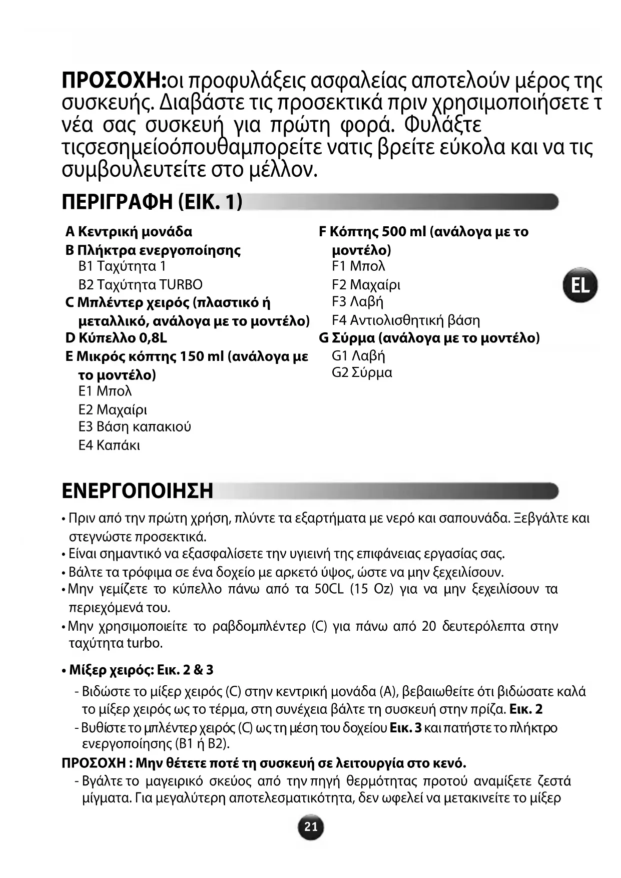 - Μικρός κόπτης 150 ml (ανάλογα με το μοντέλο): Εικ. E & 4 - Βάλτε το αχαίρι (E2) στον άξονα του πολ (E1). - Βάλτε τα τρόφια έσα στο πολ (E1), κατόπιν τοποθετήστε τη βάση του καπακιού (E3) και τέλο το καπάκι (E4). -Τοποθετήστε την κεντρική ονάδα (A) επάνω στο καπάκι (E4). - Βάλτε στην πρίζα το ίξερ χειρό (A) και πατήστε το κουπί ενεργοποίηση (B1 ή B2). - Βγάλτε την κεντρική ονάδα (A), κατόπιν το καπάκι (E4), τέλο τη βάση του καπακιού (Ε3). - Βγάλτε το αχαίρι (E2) πιάνοντά το από το πλαστικό έρο του. - Μετά τη χρήση, βγάλτε το ίγα. - Μην θέτετε ποτέ τη συσκευή σε λειτουργία στο κενό.