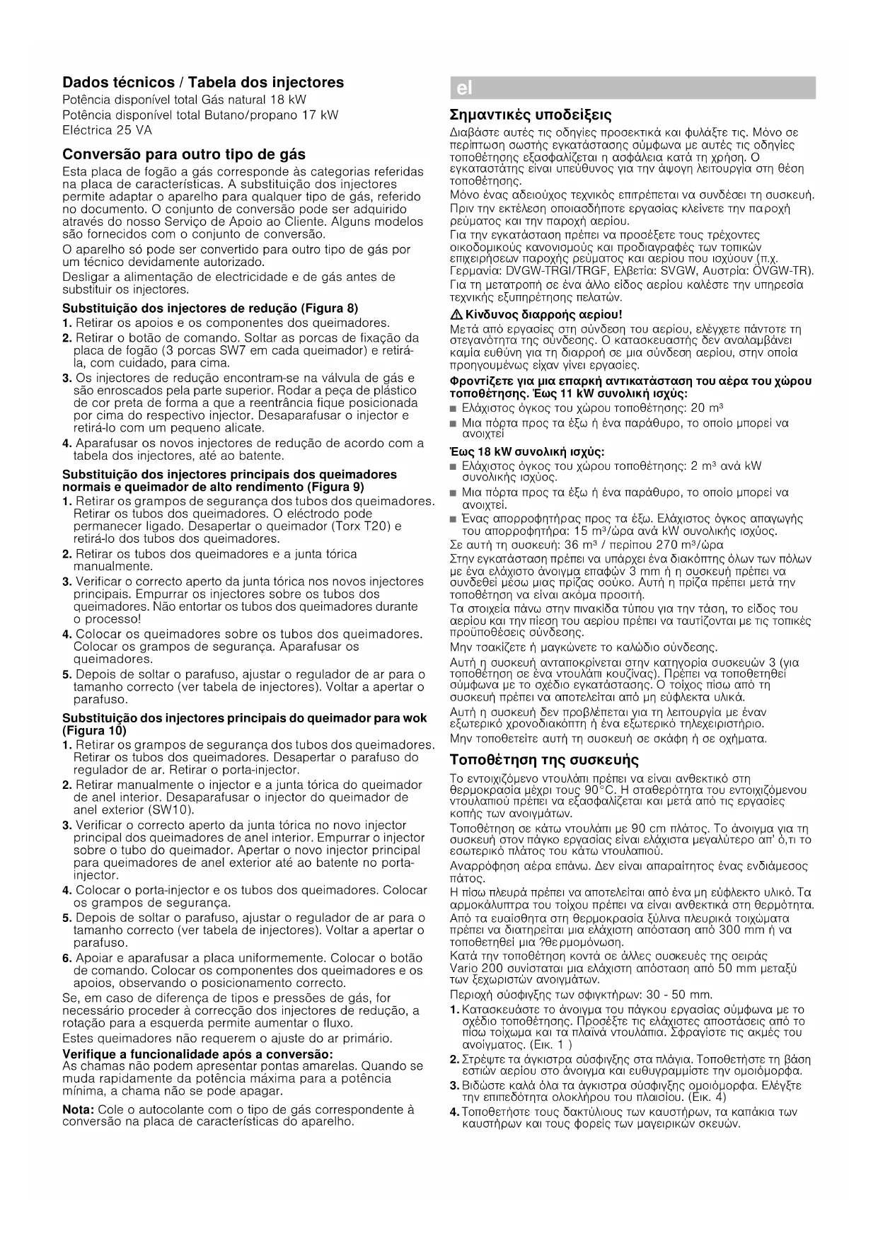 απενεργοποιείται και η ένδειξη λειτουργίας αναβοσβήνει, μπορεί να βρίσκεται αέρας στο σωλήνα παροχής αερίου. Γυρίστε όλα τα κουμπιά χειρισμού στο 0 και αν άψτε ξανά τους καυστήρες. Υπόδειξη: Στερεώστε τη βάση εστιών με όλα τα συνημμένα άγκιστρα σύσφιγξης στον πάγκο εργασίας. Μόνο έτσι εξασφαλίζεται μια άψογη τοποθέτηση. Σύνδεση του αερίου Η σύνδεση του αερίου πρέπει να τοποθετηθεί έτσι, ώστε η βάνα φραγής να είναι προσιτή. Συνδέστε τη συσκευή με μια από τις συνημμένες γωνίες σύνδεσης R½'' (από την πλευρά της συσκευής) με την αντίστοιχη στεγανοποίηση σε ένα σταθερό αγωγό σύνδεσης ή σε έναν εύκαμπτο σωλήνα ασφαλείας αερίου. Όταν ο εύκαμπτος σωλήνας ασφαλείας αε ρίου δεν αποτελείται καθόλου ή μόνο μερικώς από μέταλλο, δεν επιτρέπεται η θερμοκρασία περιβάλλοντος να υπερβεί τους 70°K. Σε περίπτωση ενός εύκαμπτου σωλήνα ασφαλείας αερίου, ο οποίος αποτελείται εντελώς από μέταλλο, η επιτρεπτή θερμοκρασίες περιβάλλοντος είναι 115°K. Τοποθετήστε τον εύκαμπτο σωλήνα ασφαλείας αερίου έτσι, ώστε να μην έρχεται σε επαφή με κινητά μέ ρη του εντοιχισμένου ντουλαπιού (π.χ. συρτάρι). Ηλεκτρική σύνδεση Ελέγξτε, εάν η τάση και η συχνότητα της συσκευής ταυτίζεται με την ηλεκτρική εγκατάσταση. Η βάση εστιών παραδίδεται, ανάλογα το μοντέλο, με καλώδιο σύνδεσης στο δίκτυο με ή χωρίς φις. Συνδέστε τη συσκευή μόνο σε εγκατεστημένη και γειωμένη σύμφωνα με τους κανονισμούς πρίζα. Η συσκευή ανταποκρίνεται στον τύπο Y: Το καλώδιο σύνδεσης επιτρέπεται να αντικατασταθεί μόνο από την υπηρεσία τεχνικής εξυπηρέτησης πελατών. Προσέξτε τον τύπο του καλωδίου και την ελάχιστη διατομή. Τεχνικά στοιχεία / Κατάλογος μπεκ Συνολική συνδεδεμένη ισχύς φυσικού αερίου 18 kW Συνολική συνδεδεμένη ισχύς βουτανίου/προπανίου 17 kW Ηλεκτρική εγκατάσταση 25 VA Ρύθμιση σε ένα άλλο είδος αερίου Αυτή η βάση εστιών αερίου αντιστοιχεί στις κατηγορίες, που αναφέρονται πάνω στην πινακίδα τύπου. Με την αλλαγή των μπεκ είναι δυνατή η ρύθμιση της συσκευής σε κάθε αέριο που αναφέρεται εκεί. Το σετ μετατροπής μπορείτε να το προμηθευτείτε μέσω της υπηρεσίας τεχνικής εξυπηρέτησης πελατών της εταιρείας μας. Σε μερικά μοντέλα το σε τ μετατροπής περιλαμβάνεται στα υλικά παράδοσης. Μόνο ένας αδειούχος εξειδικευμένος τεχνικός επιτρέπεται να ρυθμίσει τη συσκευή σε ένα άλλο είδος αερίου. Πριν την αλλαγή των μπεκ διακόπτετε την παροχή ρεύματος και την παροχή αερίου. Αντικατάσταση των μπεκ χαμηλής βαθμίδας (Εικ.8)
