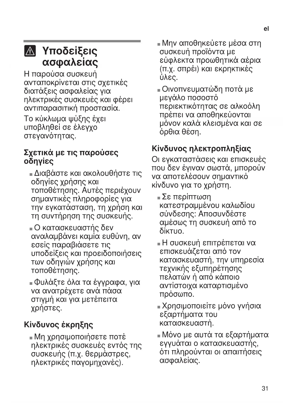 Κίνδυνος έκρηξης ■ Μη χρησιμοποιήσετε ποτέ ηλεκτρικές συσκευές εντός της συσκευής (π.χ. θερμάστρες, ηλεκτρικές παγομηχανές). ■ Μην αποθηκεύετε μέσα στη συσκευή προϊόντα με εύφλεκτα προωθητικά αέρια (π.χ. σπρέι) και εκρηκτικές