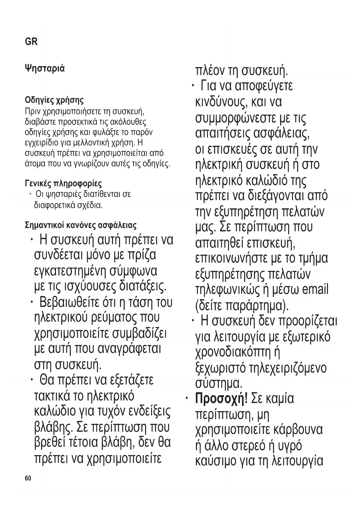 Οδηγίες χρήσης Πριν χρησιμοποιήσετε τη συσκευή, διαβάστε προσεκτικά τις ακόλουθες οδηγίες χρήσης και φυλάξτε το παρόν εγχειρίδιο για μελλοντική χρήση. Η συσκευή πρέπει να χρησιμοποιείται από άτομα που να γνωρίζουν αυτές τις οδηγίες. Γενικές πληροφορίες ∙ Οι ψησταριές διατίθενται σε διαφορετικά σχέδια. Σημαντικοί κανόνες ασφάλειας ∙ Η συσκευή αυτή πρέπει να συνδέεται μόνο με πρίζα εγκατεστημένη σύμφωνα με τις ισχύουσες διατάξεις. ∙ Βεβαιωθείτε ότι η τάση του ηλεκτρικού ρεύματος που χρησιμοποιείτε συμβαδίζει με αυτή που αναγράφεται στη συσκευή. ∙ Θα πρέπει να εξετάζετε τακτικά το ηλεκτρικό καλώδιο για τυχόν ενδείξεις βλάβης. Σε περίπτωση που βρεθεί τέτοια βλάβη, δεν θα πρέπει να χρησιμοποιείτε πλέον τη συσκευή. ∙ Για να αποφεύγετε κινδύνους, και να συμμορφώνεστε με τις απαιτήσεις ασφάλειας, οι επισκευές σε αυτή την ηλεκτρική συσκευή ή στο ηλεκτρικό καλώδιό της πρέπει να διεξάγονται από την εξυπηρέτηση πελατών μας. Σε περίπτωση που απαιτηθεί επισκευή, επικοινωνήστε με το τμήμα εξυπηρέτησης πελατών τηλεφωνικώς ή μέσω email (δείτε παράρτημα). ∙ Η συσκευή δεν προορίζεται για λειτουργία με εξωτερικό χρονοδιακόπτη ή ξεχωριστό τηλεχειριζόμενο