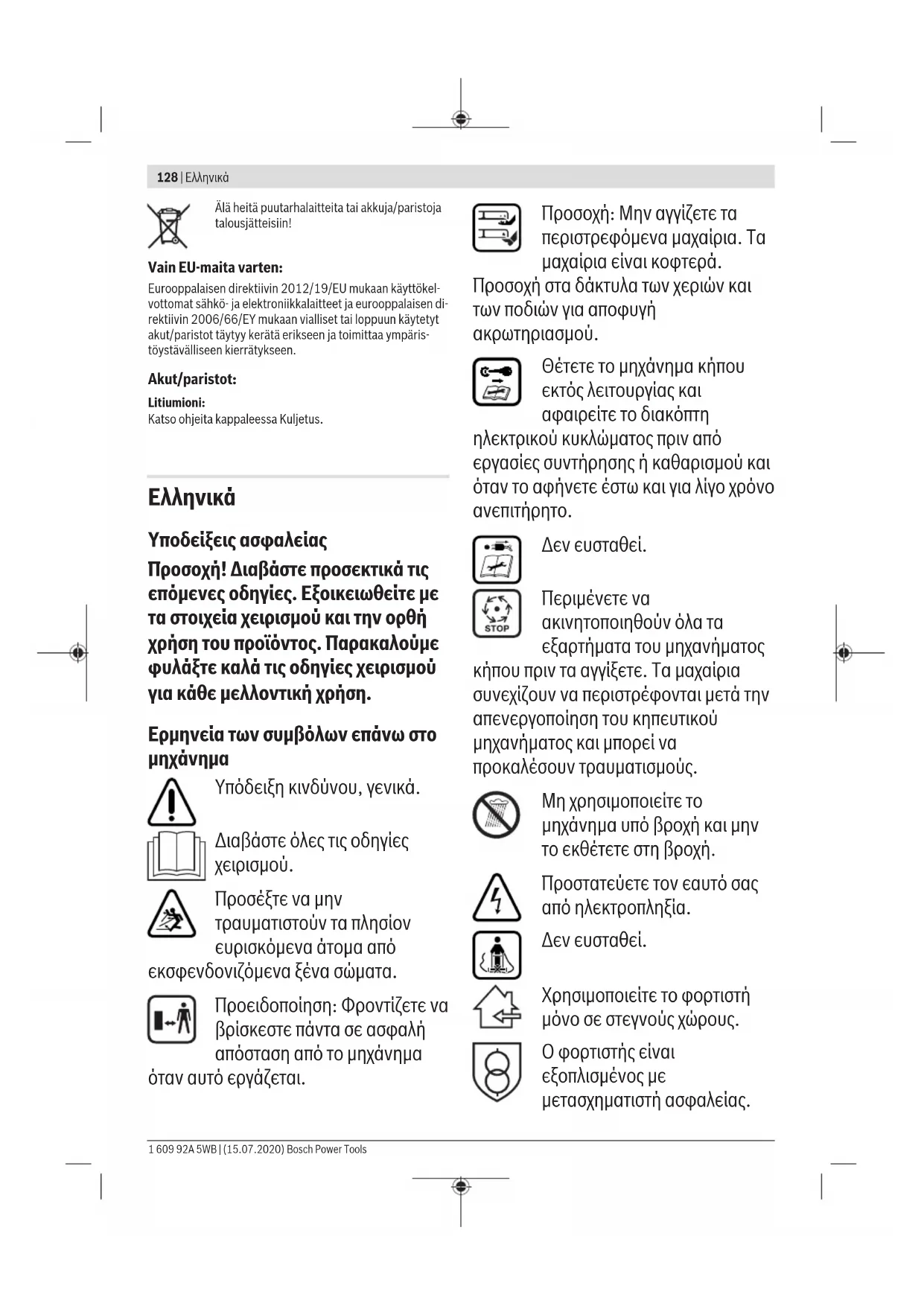 Προσέξτε να μην τραυματιστούν τα πλησίον ευρισκόμενα άτομα από εκσφενδονιζόμενα ξένα σώματα. Προειδοποίηση: Φροντίζετε να βρίσκεστε πάντα σε ασφαλή απόσταση από το μηχάνημα όταν αυτό εργάζεται. Προσοχή: Μην αγγίζετε τα περιστρεφόμενα μαχαίρια. Τα μαχαίρια είναι κοφτερά. Προσοχή στα δάκτυλα των χεριών και των ποδιών για αποφυγή ακρωτηριασμού. Θέτετε το μηχάνημα κήπου εκτός λειτουργίας και αφαιρείτε το διακόπτη ηλεκτρικού κυκλώματος πριν από εργασίες συντήρησης ή καθαρισμού και όταν το αφήνετε έστω και για λίγο χρόνο ανεπιτήρητο. Δεν ευσταθεί. Περιμένετε να ακινητοποιηθούν όλα τα εξαρτήματα του μηχανήματος κήπου πριν τα αγγίξετε. Τα μαχαίρια συνεχίζουν να περιστρέφονται μετά την απενεργοποίηση του κηπευτικού μηχανήματος και μπορεί να προκαλέσουν τραυματισμούς. Μη χρησιμοποιείτε το μηχάνημα υπό βροχή και μην το εκθέτετε στη βροχή. Προστατεύετε τον εαυτό σας από ηλεκτροπληξία. Δεν ευσταθεί. Χρησιμοποιείτε το φορτιστή μόνο σε στεγνούς χώρους. Ο φορτιστής είναι εξοπλισμένος με μετασχηματιστή ασφαλείας. 1 609 92A 5WB | (15.07.2020) Bosch Power ToolsΕλληνικά | 129 Μην χρησιμοποιείτε πλυστικά υψηλής πίεσης ή λάστιχα ποτίσματος για να καθαρίζετε το μηχάνημα κήπου. Ελέγξτε προσεκτικά την περιοχή στην οποία θα χρησιμοποιήσετε το μηχάνημα, ώστε να μη βρίσκονται εκεί κατοικίδια ή άλλα ζώα. Τα ζώα ενδέχεται να τραυματιστούν κατά τη λειτουργία του μηχανήματος. Ελέγξτε πολύ προσεκτικά την περιοχή χρήσης του μηχανήματος και αφαιρέστε όλες τις πέτρες, τα ξύλα, τα σύρματα, τα κόκαλα και τα ξένα αντικείμενα. Προσέξτε κατά την χρήση του μηχανήματος μήπως κρύβονται στο πυκνό χορτάρι ζώα ή κούτσουρα.