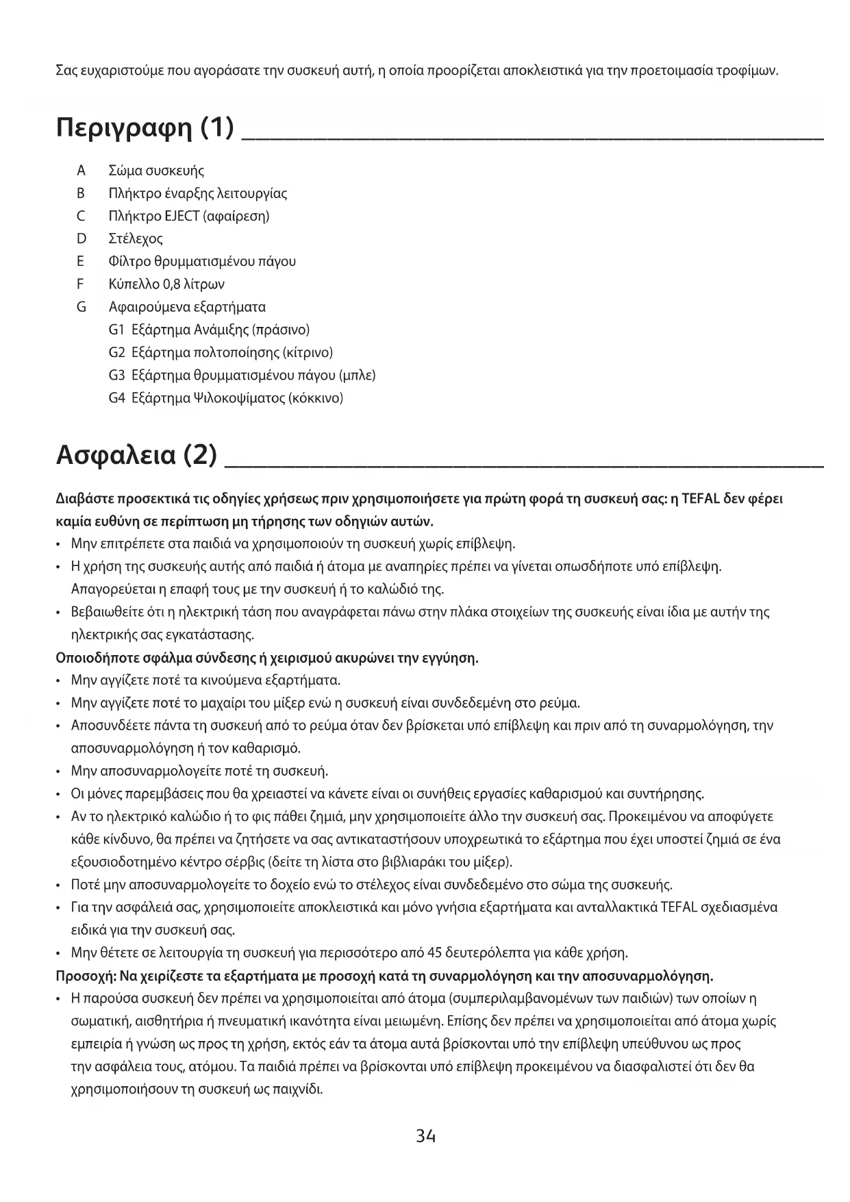 Φίλτρο θρυμματισμένου πάγου Κύπελλο 0,8 λίτρων Αφαιρούμενα εξαρτήματα G1 Εξάρτημα Ανάμιξης (πράσινο) G2 Εξάρτημα πολτοποίησης (κίτρινο) G3 Εξάρτημα θρυμματισμένου πάγου (μπλε) G4 Εξάρτημα Ψιλοκοψίματος (κόκκινο) Ασφαλεια (2) _________________________________________________ Διαβάστε προσεκτικά τις οδηγίες χρήσεως πριν χρησιμοποιήσετε για πρώτη φορά τη συσκευή σας: η TEFAL δεν φέρει καμία ευθύνη σε περίπτωση μη τήρησης των οδηγιών αυτών. Μην επιτρέπετε στα παιδιά να χρησιμοποιούν τη συσκευή χωρίς επίβλεψη. Η χρήση της συσκευής αυτής από παιδιά ή άτομα με αναπηρίες πρέπει να γίνεται οπωσδήποτε υπό επίβλεψη. Απαγορεύεται η επαφή τους με την συσκευή ή το καλώδιό της. Βεβαιωθείτε ότι η ηλεκτρική τάση που αναγράφεται πάνω στην πλάκα στοιχείων της συσκευής είναι ίδια με αυτήν της ηλεκτρικής σας εγκατάστασης. Οποιοδήποτε σφάλμα σύνδεσης ή χειρισμού ακυρώνει την εγγύηση. Μην αγγίζετε ποτέ τα κινούμενα εξαρτήματα. Μην αγγίζετε ποτέ το μαχαίρι του μίξερ ενώ η συσκευή είναι συνδεδεμένη στο ρεύμα. Αποσυνδέετε πάντα τη συσκευή από το ρεύμα όταν δεν βρίσκεται υπό επίβλεψη και πριν από τη συναρμολόγηση, την αποσυναρμολόγηση ή τον καθαρισμό. Μην αποσυναρμολογείτε ποτέ τη συσκευή. Οι μόνες παρεμβάσεις που θα χρειαστεί να κάνετε είναι οι συνήθεις εργασίες καθαρισμού και συντήρησης. Αν το ηλεκτρικό καλώδιο ή το φις πάθει ζημιά, μην χρησιμοποιείτε άλλο την συσκευή σας. Προκειμένου να αποφύγετε κάθε κίνδυνο, θα πρέπει να ζητήσετε να σας αντικαταστήσουν υποχρεωτικά το εξάρτημα που έχει υποστεί ζημιά σε ένα εξουσιοδοτημένο κέντρο σέρβις (δείτε τη λίστα στο βιβλιαράκι του μίξερ). Ποτέ μην αποσυναρμολογείτε το δοχείο ενώ το στέλεχος είναι συνδεδεμένο στο σώμα της συσκευής. Για την ασφάλειά σας, χρησιμοποιείτε αποκλειστικά και μόνο γνήσια εξαρτήματα και ανταλλακτικά TEFAL σχεδιασμένα ειδικά για την συσκευή σας. Μην θέτετε σε λειτουργία τη συσκευή για περισσότερο από 45 δευτερόλεπτα για κάθε χρήση. Προσοχή: Να χειρίζεστε τα εξαρτήματα με προσοχή κατά τη συναρμολόγηση και την αποσυναρμολόγηση. Η παρούσα συσκευή δεν πρέπει να χρησιμοποιείται από άτομα (συμπεριλαμβανομένων των παιδιών) των οποίων η σωματική, αισθητήρια ή πνευματική ικανότητα είναι μειωμένη. Επίσης δεν πρέπει να χρησιμοποιείται από άτομα χωρίς εμπειρία ή γνώση ως προς τη χρήση, εκτός εάν τα άτομα αυτά βρίσκονται υπό την επίβλεψη υπεύθυνου ως προς την ασφάλεια τους, ατόμου. Τα παιδιά πρέπει να βρίσκονται υπό επίβλεψη προκειμένου να διασφαλιστεί ότι δεν θα χρησιμοποιήσουν τη συσκευή ως παιχνίδι.
