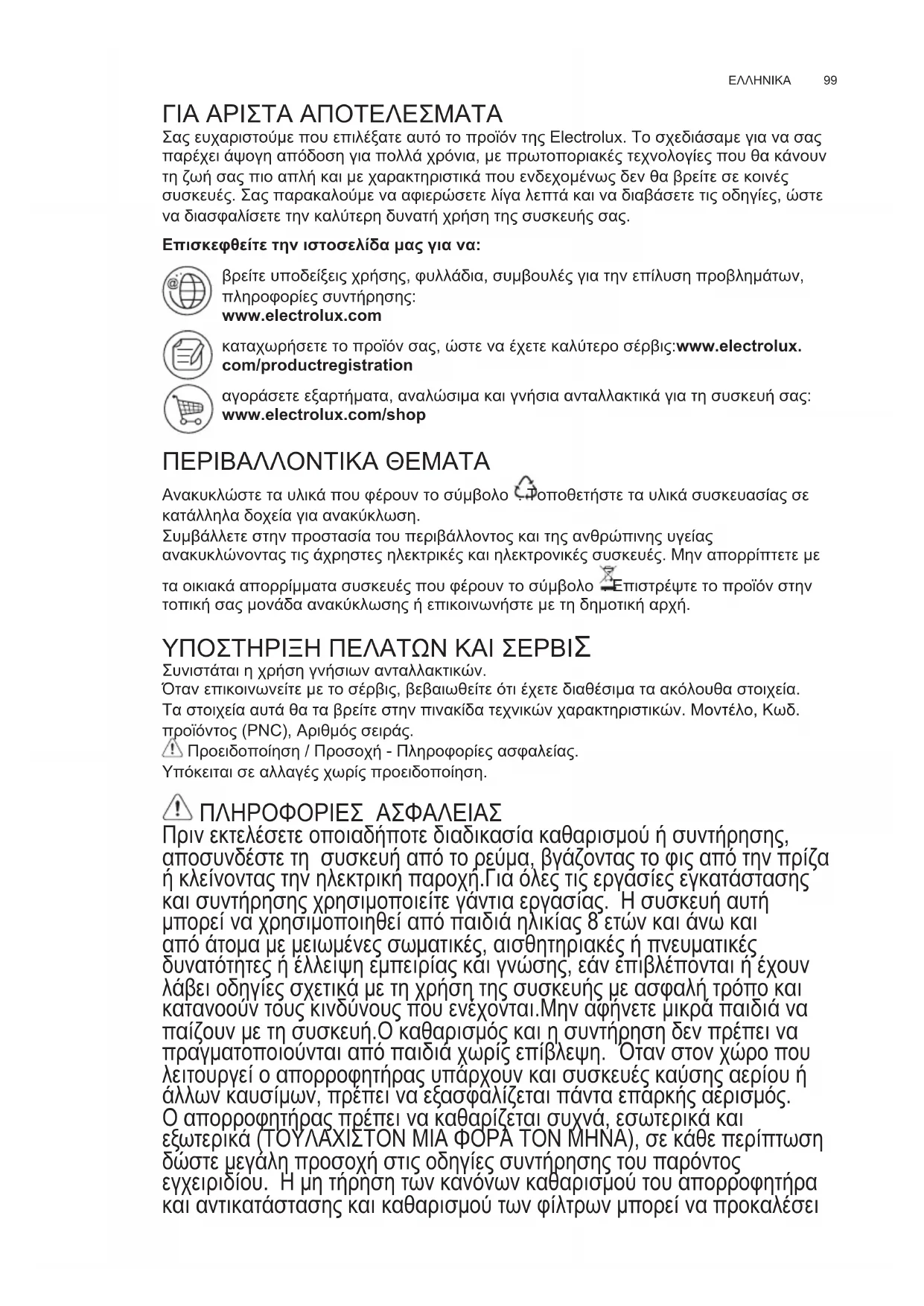 ΓΙΑ ΑΡΙΣΤΑ ΑΠΟΤΕΛΕΣΜΑΤΑ Σας ευχαριστούμε που επιλέξατε αυτό το προϊόν της Electrolux. Το σχεδιάσαμε για να σας παρέχει άψογη απόδοση για πολλά χρόνια, με πρωτοποριακές τεχνολογίες που θα κάνουν τη ζωή σας πιο απλή και με χαρακτηριστικά που ενδεχομένως δεν θα βρείτε σε κοινές συσκευές. Σας παρακαλούμε να αφιερώσετε λίγα λεπτά και να διαβάσετε τις οδηγίες, ώστε να διασφαλίσετε την καλύτερη δυνατή χρήση της συσκευής σας. Επισκεφθείτε την ιστοσελίδα μας για να: βρείτε υποδείξεις χρήσης, φυλλάδια, συμβουλές για την επίλυση προβλημάτων, πληροφορίες συντήρησης: www.electrolux.com καταχωρήσετε το προϊόν σας, ώστε να έχετε καλύτερο σέρβις:www.electrolux. com/productregistration αγοράσετε εξαρτήματα, αναλώσιμα και γνήσια ανταλλακτικά για τη συσκευή σας: www.electrolux.com/shop ΠΕΡΙΒΑΛΛΟΝΤΙΚΑ ΘΕΜΑΤΑ Ανακυκλώστε τα υλικά που φέρουν το σύμβολο . Τοποθετήστε τα υλικά συσκευασίας σε κατάλληλα δοχεία για ανακύκλωση. Συμβάλλετε στην προστασία του περιβάλλοντος και της ανθρώπινης υγείας ανακυκλώνοντας τις άχρηστες ηλεκτρικές και ηλεκτρονικές συσκευές. Μην απορρίπτετε με τα οικιακά απορρίμματα συσκευές που φέρουν το σύμβολο . Επιστρέψτε το προϊόν στην τοπική σας μονάδα ανακύκλωσης ή επικοινωνήστε με τη δημοτική αρχή. ΥΠΟΣΤΗΡΙΞΗ ΠΕΛΑΤΩΝ ΚΑΙ ΣΕΡΒΙΣ Συνιστάται η χρήση γνήσιων ανταλλακτικών. Όταν επικοινωνείτε με το σέρβις, βεβαιωθείτε ότι έχετε διαθέσιμα τα ακόλουθα στοιχεία. Τα στοιχεία αυτά θα τα βρείτε στην πινακίδα τεχνικών χαρακτηριστικών. Μοντέλο, Κωδ. προϊόντος (PNC), Αριθμός σειράς. Προειδοποίηση / Προσοχή - Πληροφορίες ασφαλείας. Υπόκειται σε αλλαγές χωρίς προειδοποίηση. ΠΛΗΡΟΦΟΡΙΕΣ ΑΣΦΑΛΕΙΑΣ Πριν εκτελέσετε οποιαδήποτε διαδικασία καθαρισμού ή συντήρησης, αποσυνδέστε τη συσκευή από το ρεύμα, βγάζοντας το φις από την πρίζα ή κλείνοντας την ηλεκτρική παροχή.Για όλες τις εργασίες εγκατάστασης και συντήρησης χρησιμοποιείτε γάντια εργασίας. Η συσκευή αυτή μπορεί να χρησιμοποιηθεί από παιδιά ηλικίας 8 ετών και άνω και από άτομα με μειωμένες σωματικές, αισθητηριακές ή πνευματικές δυνατότητες ή έλλειψη εμπειρίας και γνώσης, εάν επιβλέπονται ή έχουν λάβει οδηγίες σχετικά με τη χρήση της συσκευής με ασφαλή τρόπο και κατανοούν τους κινδύνους που ενέχονται.Μην αφήνετε μικρά παιδιά να παίζουν με τη συσκευή.Ο καθαρισμός και η συντήρηση δεν πρέπει να πραγματοποιούνται από παιδιά χωρίς επίβλεψη. Όταν στον χώρο που λειτουργεί ο απορροφητήρας υπάρχουν και συσκευές καύσης αερίου ή άλλων καυσίμων, πρέπει να εξασφαλίζεται πάντα επαρκής αερισμός. Ο απορροφητήρας πρέπει να καθαρίζεται συχνά, εσωτερικά και εξωτερικά (ΤΟΥΛΑΧΙΣΤΟΝ ΜΙΑ ΦΟΡΑ ΤΟΝ ΜΗΝΑ), σε κάθε περίπτωση δώστε μεγάλη προσοχή στις οδηγίες συντήρησης του παρόντος εγχειριδίου. Η μη τήρηση των κανόνων καθαρισμού του απορροφητήρα και αντικατάστασης και καθαρισμού των φίλτρων μπορεί να προκαλέσει EL ΟΔΗΓΊΕΣ ΧΡΉΣΗΣwww.electrolux.com