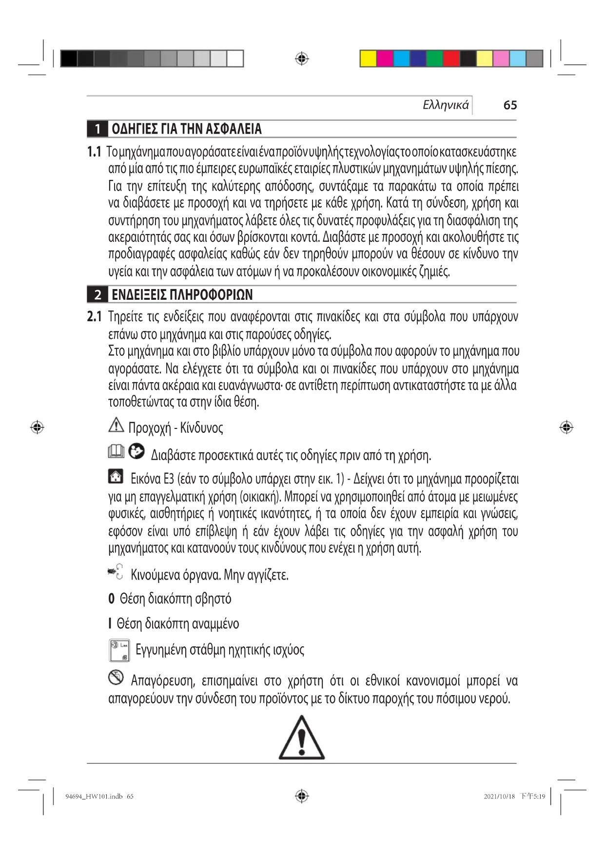 Τηρείτε τις ενδείξεις που αναφέρονται στις πινακίδες και στα σύμβολα που υπάρχουν επάνω στο μηχάνημα και στις παρούσες οδηγίες. Στο μηχάνημα και στο βιβλίο υπάρχουν μόνο τα σύμβολα που αφορούν το μηχάνημα που αγοράσατε. Να ελέγχετε ότι τα σύμβολα και οι πινακίδες που υπάρχουν στο μηχάνημα είναι πάντα ακέραια και ευανάγνωστα· σε αντίθετη περίπτωση αντικαταστήστε τα με άλλα τοποθετώντας τα στην ίδια θέση. Προχοχή - Κίνδυνος Διαβάστε προσεκτικά αυτές τις οδηγίες πριν από τη χρήση. Εικόνα E3 (εάν το σύμβολο υπάρχει στην εικ. 1) - Δείχνει ότι το μηχάνημα προορίζεται για μη επαγγελματική χρήση (οικιακή). Μπορεί να χρησιμοποιηθεί από άτομα με μειωμένες φυσικές, αισθητήριες ή νοητικές ικανότητες, ή τα οποία δεν έχουν εμπειρία και γνώσεις, εφόσον είναι υπό επίβλεψη ή εάν έχουν λάβει τις οδηγίες για την ασφαλή χρήση του μηχανήματος και κατανοούν τους κινδύνους που ενέχει η χρήση αυτή. Κινούμενα όργανα. Μην αγγίζετε. 0 Θέση διακόπτη σβηστό I Θέση διακόπτη αναμμένο Εγγυημένη στάθμη ηχητικής ισχύος Απαγόρευση, επισημαίνει στο χρήστη ότι οι εθνικοί κανονισμοί μπορεί να απαγορεύουν την σύνδεση του προϊόντος με το δίκτυο παροχής του πόσιμου νερού. 94694_HW101.indb 6594694_HW101.indb 65 2021/10/18 下午5:192021/10/18 下午5:1966