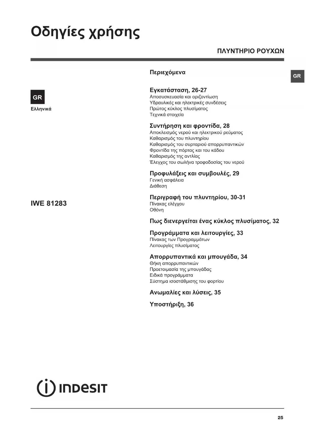 Περιεχόμενα Εγκατάσταση, 26-27 Αποσυσκευασία και οριζοντίωσηΥδραυλικές και ηλεκτρικές συνδέσειςΠρώτος κύκλος πλυσίματοςΤεχνικά στοιχεία Συντήρηση και φροντίδα, 28 Αποκλεισμός νερού και ηλεκτρικού ρεύματοςΚαθαρισμός του πλυντηρίουΚαθαρισμός του συρταριού απορρυπαντικώνΦροντίδα της πόρτας και του κάδουΚαθαρισμός της αντλίαςΈλεγχος του σωλήνα τροφοδοσίας του νερού Προφυλάξεις και συμβουλές, 29 Γενική ασφάλειαΔιάθεση Περιγραφή του πλυντηρίου, 30-31 Πίνακας ελέγχουΟθόνη Πως διενεργείται ένας κύκλος πλυσίματος, 32 Προγράμματα και λειτουργίες, 33 Πίνακας των ΠρογραμμάτωνΛειτουργίες πλυσίματος Απορρυπαντικά και μπουγάδα, 34 Θήκη απορρυπαντικώνΠροετοιμασία της μπουγάδαςΕιδικά προγράμματαΣύστημα ισοστάθμισης του φορτίου Ανωμαλίες και λύσεις, 35 Υποστήριξη, 36 IWE 81283 Οδηγίες χρήσης ΠΛΥΝΤΗΡΙΟ ΡΟΥΧΩΝ GRGR