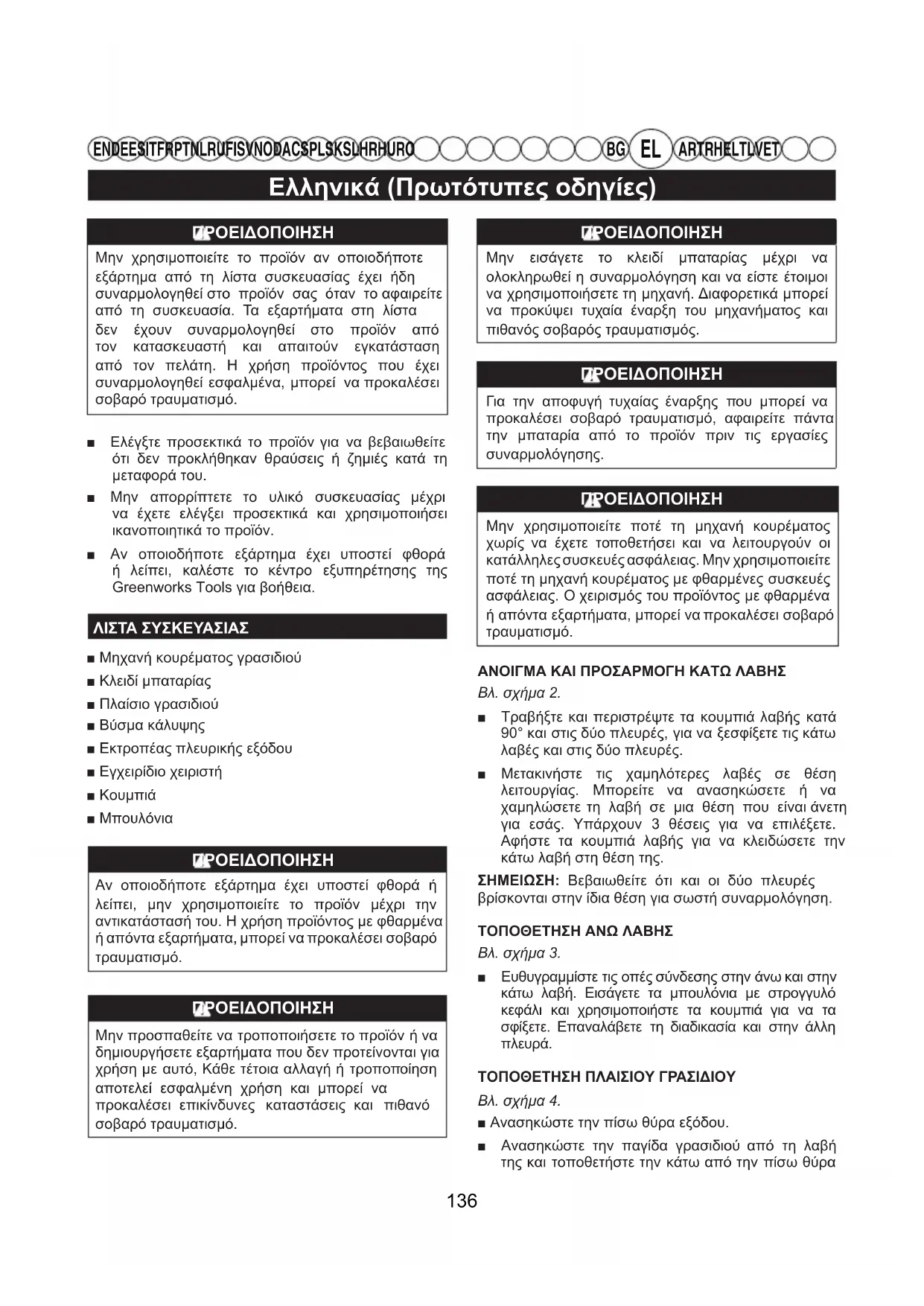 AR TR HE LT LV ET ΠΡΟΕΙΔΟΠΟΙΗΣΗ Μην χρησιμοποιείτε το προϊόν αν οποιοδήποτε εξάρτημα από τη λίστα συσκευασίας έχει ήδη συναρμολογηθεί στο προϊόν σας όταν το αφαιρείτε από τη συσκευασία. Τα εξαρτήματα στη λίστα δεν έχουν συναρμολογηθεί στο προϊόν από τον κατασκευαστή και απαιτούν εγκατάσταση από τον πελάτη. Η χρήση προϊόντος που έχει συναρμολογηθεί εσφαλμένα, μπορεί να προκαλέσει σοβαρό τραυματισμό. ■ Έλέγξτε προσεκτικά το προϊόν για να βεβαιωθείτε ότι δεν προκλήθηκαν θραύσεις ή ζημιές κατά τη μεταφορά του. ■ Μην απορρίπτετε το υλικό συσκευασίας μέχρι να έχετε ελέγξει προσεκτικά και χρησιμοποιήσει ικανοποιητικά το προϊόν. ■ Αν οποιοδήποτε εξάρτημα έχει υποστεί φθορά ή λείπει, καλέστε το κέντρο εξυπηρέτησης της Greenworks Tools για βοήθεια.ΛΙΣΤΑ ΣΥΣΚΕΥΑΣΙΑΣ ■ Μηχανή κουρέματος γρασιδιού ■ Κλειδί μπαταρίας ■ Πλαίσιο γρασιδιού ■ Βύσμα κάλυψης ■ Έκτροπέας πλευρικής εξόδου ■ Έγχειρίδιο χειριστή ■ Κουμπιά ■ Μπουλόνια ΠΡΟΕΙΔΟΠΟΙΗΣΗ Αν οποιοδήποτε εξάρτημα έχει υποστεί φθορά ή λείπει, μην χρησιμοποιείτε το προϊόν μέχρι την αντικατάστασή του. Η χρήση προϊόντος με φθαρμένα ή απόντα εξαρτήματα, μπορεί να προκαλέσει σοβαρό τραυματισμό. ΠΡΟΕΙΔΟΠΟΙΗΣΗ Μην προσπαθείτε να τροποποιήσετε το προϊόν ή να δημιουργήσετε εξαρτήματα που δεν προτείνονται για χρήση με αυτό, Κάθε τέτοια αλλαγή ή τροποποίηση αποτελεί εσφαλμένη χρήση και μπορεί να προκαλέσει επικίνδυνες καταστάσεις και πιθανό σοβαρό τραυματισμό. ΠΡΟΕΙΔΟΠΟΙΗΣΗ Μην εισάγετε το κλειδί μπαταρίας μέχρι να ολοκληρωθεί η συναρμολόγηση και να είστε έτοιμοι να χρησιμοποιήσετε τη μηχανή. Διαφορετικά μπορεί να προκύψει τυχαία έναρξη του μηχανήματος και πιθανός σοβαρός τραυματισμός. ΠΡΟΕΙΔΟΠΟΙΗΣΗ Για την αποφυγή τυχαίας έναρξης που μπορεί να προκαλέσει σοβαρό τραυματισμό, αφαιρείτε πάντα την μπαταρία από το προϊόν πριν τις εργασίες συναρμολόγησης. ΠΡΟΕΙΔΟΠΟΙΗΣΗ Μην χρησιμοποιείτε ποτέ τη μηχανή κουρέματος χωρίς να έχετε τοποθετήσει και να λειτουργούν οι κατάλληλες συσκευές ασφάλειας. Μην χρησιμοποιείτε ποτέ τη μηχανή κουρέματος με φθαρμένες συσκευές ασφάλειας. Ο χειρισμός του προϊόντος με φθαρμένα ή απόντα εξαρτήματα, μπορεί να προκαλέσει σοβαρό τραυματισμό.ΑΝΟΙΓΜΑ ΚΑΙ ΠΡΟΣΑΡΜΟΓΗ ΚΑΤΩ ΛΑΒΗΣΒλ. σχήμα 2. ■ Τραβήξτε και περιστρέψτε τα κουμπιά λαβής κατά 90° και στις δύο πλευρές, για να ξεσφίξετε τις κάτω λαβές και στις δύο πλευρές. ■ Μετακινήστε τις χαμηλότερες λαβές σε θέση λειτουργίας. Μπορείτε να ανασηκώσετε ή να χαμηλώσετε τη λαβή σε μια θέση που είναι άνετη για εσάς. Υπάρχουν 3 θέσεις για να επιλέξετε. Αφήστε τα κουμπιά λαβής για να κλειδώσετε την κάτω λαβή στη θέση της. ΣΗΜΕΙΩΣΗ: Βεβαιωθείτε ότι και οι δύο πλευρές βρίσκονται στην ίδια θέση για σωστή συναρμολόγηση.ΤΟΠΟΘΕΤΗΣΗ ΑΝΩ ΛΑΒΗΣΒλ. σχήμα 3. ■ Έυθυγραμμίστε τις οπές σύνδεσης στην άνω και στην κάτω λαβή. Έισάγετε τα μπουλόνια με στρογγυλό κεφάλι και χρησιμοποιήστε τα κουμπιά για να τα σφίξετε. Έπαναλάβετε τη διαδικασία και στην άλλη πλευρά. ΤΟΠΟΘΕΤΗΣΗ ΠΛΑΙΣΙΟΥ ΓΡΑΣΙΔΙΟΥΒλ. σχήμα 4. ■ Ανασηκώστε την πίσω θύρα εξόδου. ■ Ανασηκώστε την παγίδα γρασιδιού από τη λαβή της και τοποθετήστε την κάτω από την πίσω θύρα 136Ελληνικά (Πρωτότυπες οδηγίες)