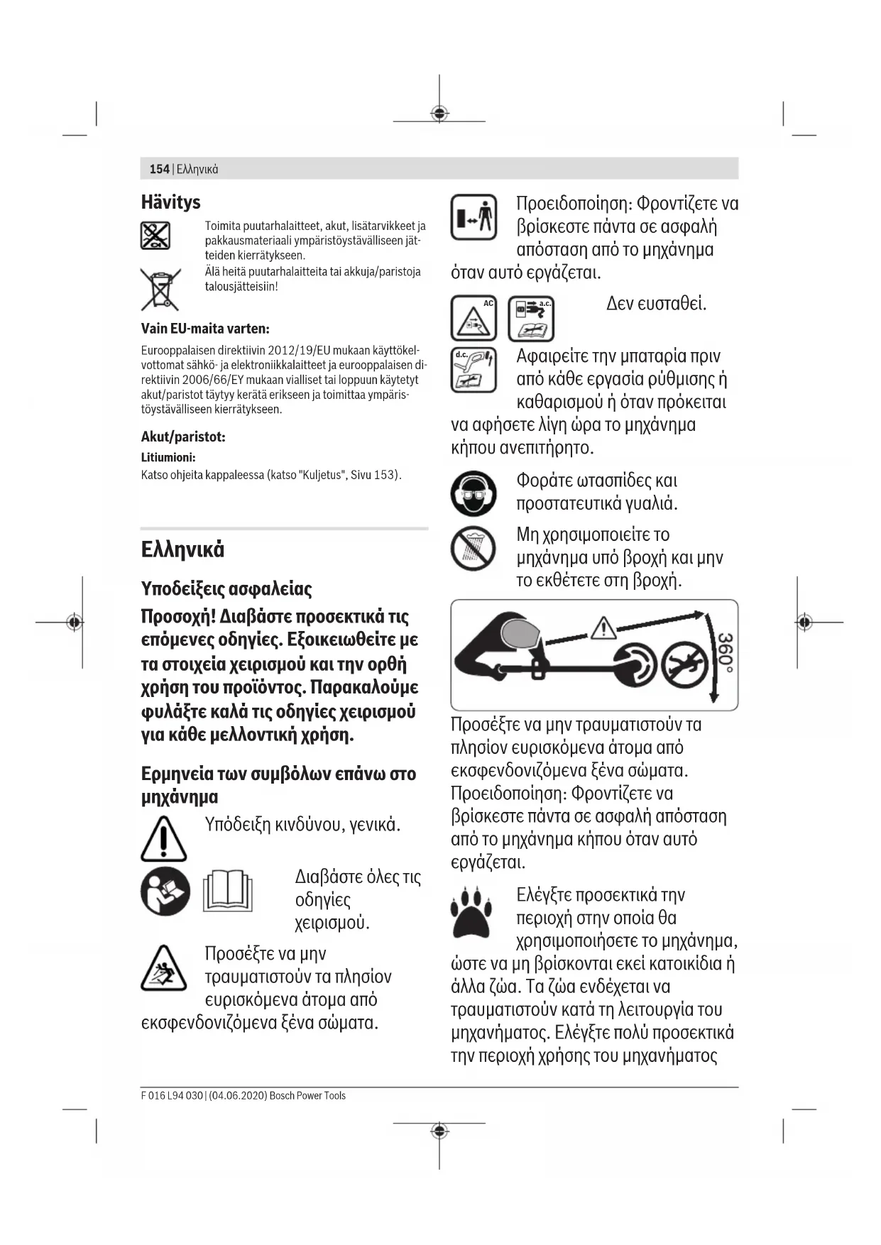 Ελέγξτε προσεκτικά την περιοχή στην οποία θα χρησιμοποιήσετε το μηχάνημα, ώστε να μη βρίσκονται εκεί κατοικίδια ή άλλα ζώα. Τα ζώα ενδέχεται να τραυματιστούν κατά τη λειτουργία του μηχανήματος. Ελέγξτε πολύ προσεκτικά την περιοχή χρήσης του μηχανήματος F 016 L94 030 | (04.06.2020) Bosch Power ToolsΕλληνικά | 155 και αφαιρέστε όλες τις πέτρες, τα ξύλα, τα σύρματα, τα κόκαλα και τα ξένα αντικείμενα. Προσέξτε κατά την χρήση του μηχανήματος μήπως κρύβονται στο πυκνό χορτάρι ζώα ή κούτσουρα. Γενικές υποδείξεις ασφαλείας για ηλεκτρικά εργαλεία u Διαβάστε όλες τις υποδείξεις ασφαλείας, οδηγίες, εικονογραφήσεις και όλα τα τεχνικά στοιχεία, που συνοδεύουν αυτό το ηλεκτρικό εργαλείο. Αμέλειες κατά την τήρηση των ακόλουθων υποδείξεων μπορεί να προκαλέσουν ηλεκτροπληξία, πυρκαγιά και/ή σοβαρούς τραυματισμούς. u Φυλάξτε όλες τις προειδοποιητικές υποδείξεις και οδηγίες για κάθε μελλοντική χρήση. u Ο όρος «ηλεκτρικό εργαλείο» που χρησιμοποιείται στις προειδοποιητικές υποδείξεις αναφέρεται σε ηλεκτρικά εργαλεία που τροφοδοτούνται από το ηλεκτρικό δίκτυο (με ηλεκτρικό καλώδιο) καθώς και σε ηλεκτρικά εργαλεία που τροφοδοτούνται από μπαταρία (χωρίς ηλεκτρικό καλώδιο). Ασφάλεια στο χώρο εργασίας u Διατηρείτε τον χώρο εργασίας καθαρό και καλά φωτισμένο. Ρύπανση ή σκοτεινές περιοχές προκαλούν ατυχήματα. u Μην εργάζεσθε με το ηλεκτρικό εργαλείο σε περιβάλλον, όπου υπάρχει κίνδυνος έκρηξης, όπως με την παρουσία εύφλεκτων υγρών, αερίων ή σκόνης. Τα ηλεκτρικά εργαλεία δημιουργούν σπινθηρισμό ο οποίος μπορεί να αναφλέξει τη σκόνη ή τις αναθυμιάσεις. u Όταν χρησιμοποιείτε το ηλεκτρικό εργαλείο, κρατάτε μακριά τα παιδιά και άλλα τυχόν παρευρισκόμενα άτομα. Σε περίπτωση απόσπασης της προσοχής σας μπορεί να χάσετε τον έλεγχο του εργαλείου. Ηλεκτρική ασφάλεια u Το φις του ηλεκτρικού εργαλείου πρέπει να ταιριάζει στην πρίζα. Μην τροποποιήσετε το φις με κανέναν τρόπο. Μη χρησιμοποιείτε φις προσαρμογής σε συνδυασμό με γειωμένα ηλεκτρικά εργαλεία. Αμεταποίητα φις και κατάλληλες πρίζες μειώνουν τον κίνδυνο ηλεκτροπληξίας. u Αποφεύγετε την επαφή του σώματός σας με γειωμένες επιφάνειες, όπως σωλήνες, θερμαντικά σώματα (καλοριφέρ), κουζίνες ή ψυγεία. Όταν το σώμα σας είναι γειωμένο αυξάνεται ο κίνδυνος ηλεκτροπληξίας. u Μην εκθέτετε τα ηλεκτρικά εργαλεία στη βροχή ή στην υγρασία. Η διείσδυση νερού σ’ ένα ηλεκτρικό εργαλείο αυξάνει τον κίνδυνο ηλεκτροπληξίας. Bosch Power Tools F 016 L94 030 | (04.06.2020)156 | Ελληνικά u Μην τραβάτε το καλώδιο. Μη χρησιμοποιείτε το καλώδιο για τη μεταφορά ή το τράβηγμα για την αποσύνδεση του ηλεκτρικού εργαλείου. Κρατάτε το καλώδιο μακριά από θερμότητα, λάδι, κοφτερές ακμές ή κινούμενα εξαρτήματα. Τυχόν χαλασμένα ή περιπλεγμένα ηλεκτρικά καλώδια αυξάνουν τον κίνδυνο ηλεκτροπληξίας. u Όταν εργάζεσθε μ’ ένα ηλεκτρικό εργαλείο στην ύπαιθρο, χρησιμοποιείτε καλώδιο επέκτασης (μπαλαντέζα) που είναι κατάλληλο και για εξωτερική χρήση. Ηχρήση καλωδίων επιμήκυνσης κατάλληλων για υπαίθριους χώρους ελαττώνει τον κίνδυνο ηλεκτροπληξίας. u Όταν η χρήση του ηλεκτρικού εργαλείου σε υγρό περιβάλλον είναι αναπόφευκτη, τότε χρησιμοποιήστε έναν προστατευτικό διακόπτη διαρροής (διακόπτηςFI/RCD). Ηχρήση ενός προστατευτικού διακόπτη διαρροής ελαττώνει τον κίνδυνο ηλεκτροπληξίας. Ασφάλεια προσώπων u Να είστε σε επαγρύπνηση, δίνετε προσοχή στην εργασία που κάνετε και χρησιμοποιείτε το 