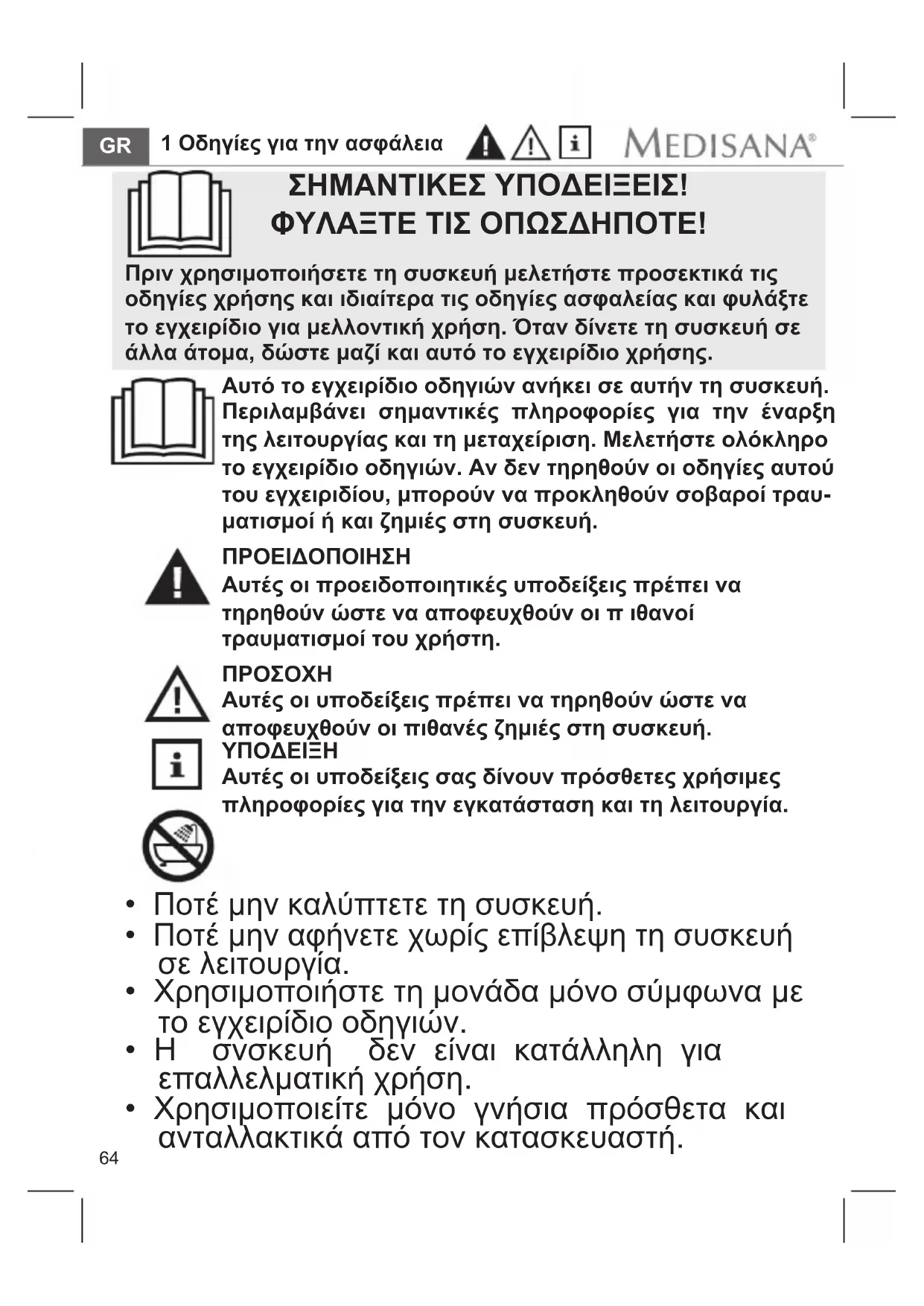 Στα πλαίσια συνεχών βελτιώσεων των προϊόντων διατηρού- με το δικαίωμα τεχνικών ή σχηματικών τροπ οποιήσεων. Εγγύηση και όροι επισκευών Σε περίπτωση εγγυητικής αξίωσης σας παρακαλούμε να απευθυνθείτε στο ειδικό κατάστημα που αγοράσατε τη συσκευή ή κατευθείαν στο κέντρο Σέρβις. Σε περίπτωση όμως που είναι απαραίτητη η αποστολή της συσκευής, σας αρακαλούμε να την στείλετε με αναφορά του ελαττώματος, επισυνάπτοντας και ένα αντίγραφο της απόδειξης αγοράς. Για την εγγυητική αξίωση ισχύουν οι ακόλουθοι όροι εγγύησης: 1. Για τα προϊόντα MEDISANA παρέχεται εγγύη- ση τριών ετών από την ημερομηνία αγοράς. Σε περίπτωση εγγυητικής αξίωσης η ημερομηνία αγοράς θα πρέπει να αποδεικνύεται μέσω απόδειξης ή τιμολογίου αγοράς. 2. Ελαττώματα οφειλόμενα σε σφάλματα υλικού ή κατασκευής επιδιορθώνονται δωρεάν εντός του χρόνου εγγύησης. 3. Σε περίπτωση παροχής εγγύησης δεν παρατείνεται ο χρόνοςεγγύησης, ούτε για τη συσκευη ούτε για εξαρτήματα που αντικαταστάθηκαν. 4. Από την εγγύηση αποκλείονται: α. όλες οι βλάβες, οι οποίες οφείλονται σε ακατάλληλο χειρισμό, η.χ. από παράλειψη τήρησης των οδηγιών χρήσης. β. βλάβες, οι οποίες οφείλονται σε επισκευές ή επεμβάσεις του αγορα- στή ή αναρμόδιων τρίτων. γ. βλάβες μεταφοράς, οι οποίες προέκυψαν κατά τη μεταφορά απο τον κατασκευαστή προς τον καταναλωτή ή κατά την αποστολή στο. δ. ανταλλακτικά , τα οποία υπόκεινται σε φυσιολογική φθορά. 5. Η ευθύνη για άμεσες ή έμμεσες επακόλουθες ζημιές, οι οποίες προκαλούται από τη συσκευή, αποκλείεται ακόμα και σε περίπτωση που η ζημιά στη συσκευή αναγνωριστεί ως εγγυητική αξίωση.71