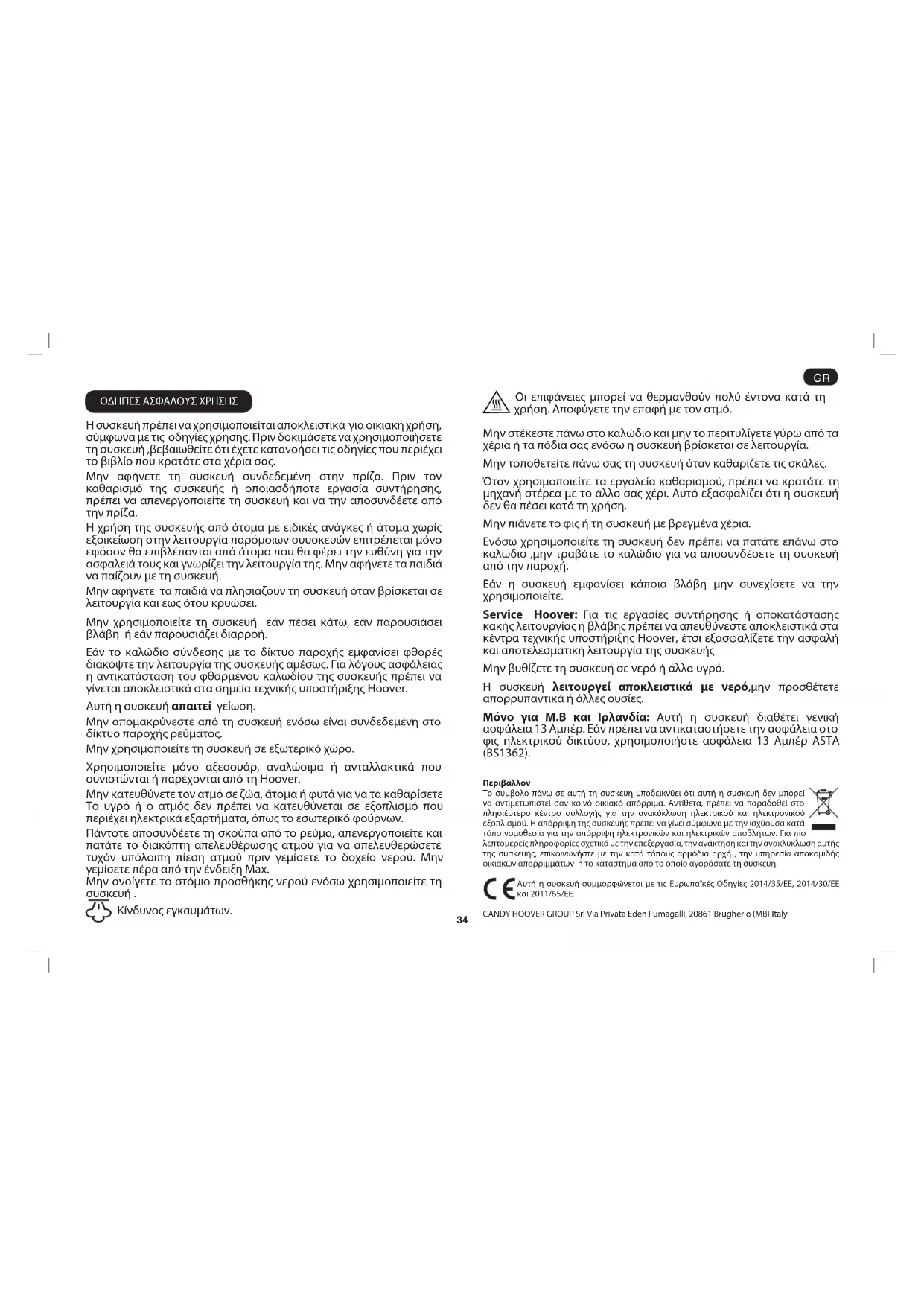 Κίνδυνος εγκαυμάτων. Οι επιφάνειες μπορεί να θερμανθούν πολύ έντονα κατά τη χρήση. Αποφύγετε την επαφή με τον ατμό. Μην στέκεστε πάνω στο καλώδιο και μην το περιτυλίγετε γύρω από τα χέρια ή τα πόδια σας ενόσω η συσκευή βρίσκεται σε λειτουργία. Μην τοποθετείτε πάνω σας τη συσκευή όταν καθαρίζετε τις σκάλες. Όταν χρησιμοποιείτε τα εργαλεία καθαρισμού, πρέπει να κρατάτε τη μηχανή στέρεα με το άλλο σας χέρι. Αυτό εξασφαλίζει ότι η συσκευή δεν θα πέσει κατά τη χρήση. Μην πιάνετε το φις ή τη συσκευή με βρεγμένα χέρια. Ενόσω χρησιμοποιείτε τη συσκευή δεν πρέπει να πατάτε επάνω στο καλώδιο ,μην τραβάτε το καλώδιο για να αποσυνδέσετε τη συσκευή από την παροχή. Εάν η συσκευή εμφανίσει κάποια βλάβη μην συνεχίσετε να την χρησιμοποιείτε. Service Hoover: Για τις εργασίες συντήρησης ή αποκατάστασης κακής λειτουργίας ή βλάβης πρέπει να απευθύνεστε αποκλειστικά στα κέντρα τεχνικής υποστήριξης Hoover, έτσι εξασφαλίζετε την ασφαλή και αποτελεσματική λειτουργία της συσκευής Μην βυθίζετε τη συσκευή σε νερό ή άλλα υγρά. Η συσκευή λειτουργεί αποκλειστικά με νερό,μην προσθέτετε απορρυπαντικά ή άλλες ουσίες. Μόνο για Μ.Β και Ιρλανδία: Αυτή η συσκευή διαθέτει γενική ασφάλεια 13 Αμπέρ. Εάν πρέπει να αντικαταστήσετε την ασφάλεια στο φις ηλεκτρικού δικτύου, χρησιμοποιήστε ασφάλεια 13 Αμπέρ ASTA (BS1362).