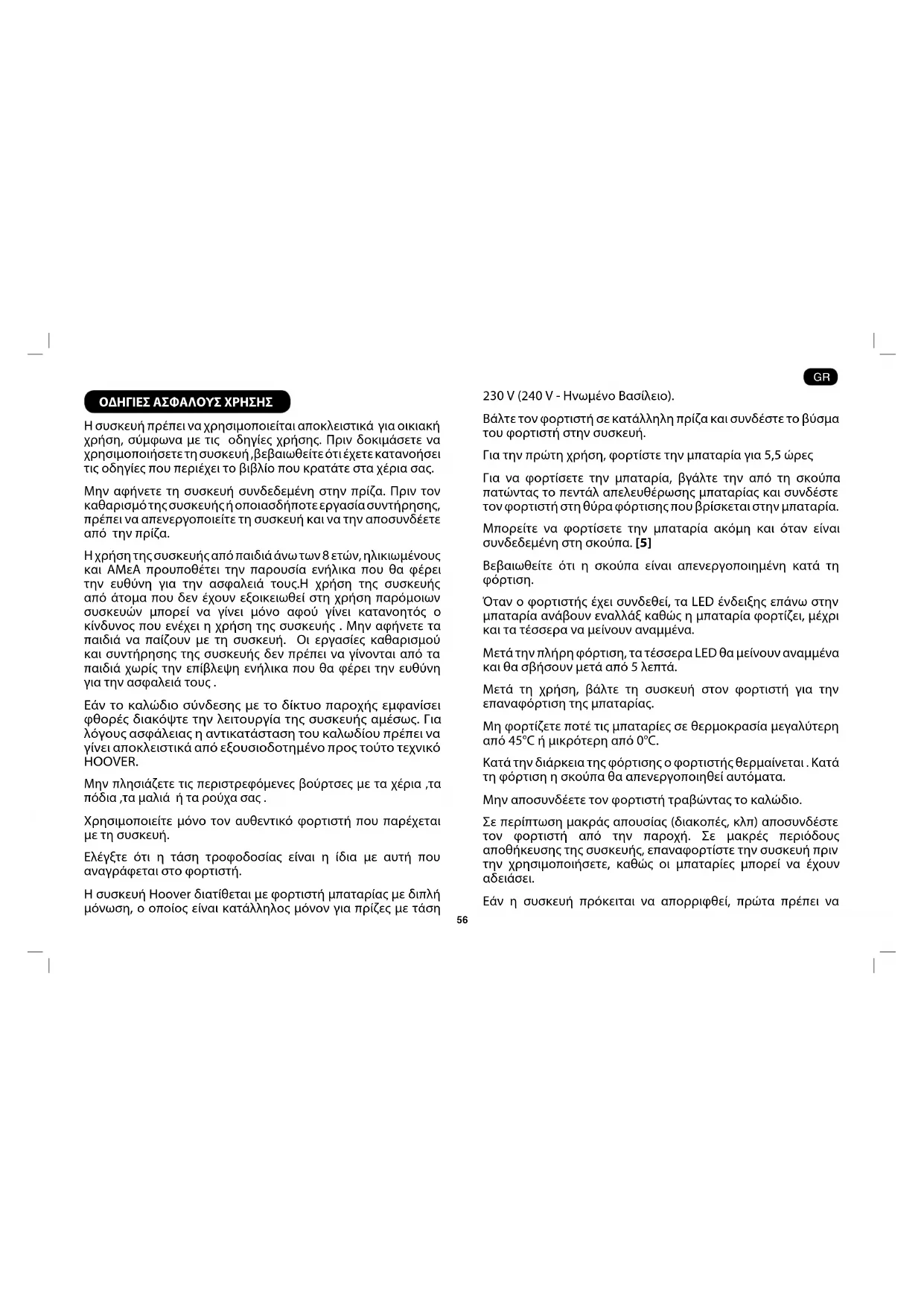 - Parkettisuulake* – Parketin ja muiden arkojen lattiapintojen imurointiin. [W]56 ΟΔΗΓΙΕΣ ΑΣΦΑΛΟΥΣ ΧΡΗΣΗΣ H συσκευή πρέπει να χρησιμοποιείται αποκλειστικά για οικιακή χρήση, σύμφωνα με τις οδηγίες χρήσης. Πριν δοκιμάσετε να χρησιμοποιήσετε τη συσκευή ,βεβαιωθείτε ότι έχετε κατανοήσει τις οδηγίες που περιέχει το βιβλίο που κρατάτε στα χέρια σας. Μην αφήνετε τη συσκευή συνδεδεμένη στην πρίζα. Πριν τον καθαρισμό της συσκευής ή οποιασδήποτε εργασία συντήρησης, πρέπει να απενεργοποιείτε τη συσκευή και να την αποσυνδέετε από την πρίζα. Η χρήση της συσκευής από παιδιά άνω των 8 ετών, ηλικιωμένους και ΑΜεΑ προυποθέτει την παρουσία ενήλικα που θα φέρει την ευθύνη για την ασφαλειά τους.Η χρήση της συσκευής από άτομα που δεν έχουν εξοικειωθεί στη χρήση παρόμοιων συσκευών μπορεί να γίνει μόνο αφού γίνει κατανοητός ο κίνδυνος που ενέχει η χρήση της συσκευής . Μην αφήνετε τα παιδιά να παίζουν με τη συσκευή. Οι εργασίες καθαρισμού και συντήρησης της συσκευής δεν πρέπει να γίνονται από τα παιδιά χωρίς την επίβλεψη ενήλικα που θα φέρει την ευθύνη για την ασφαλειά τους . Εάν το καλώδιο σύνδεσης με το δίκτυο παροχής εμφανίσει φθορές διακόψτε την λειτουργία της συσκευής αμέσως. Για λόγους ασφάλειας η αντικατάσταση του καλωδίου πρέπει να γίνει αποκλειστικά από εξουσιοδοτημένο προς τούτο τεχνικό HOOVER. Μην πλησιάζετε τις περιστρεφόμενες βούρτσες με τα χέρια ,τα πόδια ,τα μαλιά ή τα ρούχα σας . Χρησιμοποιείτε μόνο τον αυθεντικό φορτιστή που παρέχεται με τη συσκευή. Ελέγξτε ότι η τάση τροφοδοσίας είναι η ίδια με αυτή που αναγράφεται στο φορτιστή. Η συσκευή Hoover διατίθεται με φορτιστή μπαταρίας με διπλή μόνωση, ο οποίος είναι κατάλληλος μόνον για πρίζες με τάση 230 V (240 V - Ηνωμένο Βασίλειο). Βάλτε τον φορτιστή σε κατάλληλη πρίζα και συνδέστε το βύσμα του φορτιστή στην συσκευή. Για την πρώτη χρήση, φορτίστε την μπαταρία για 5,5 ώρες Για να φορτίσετε την μπαταρία, βγάλτε την από τη σκούπα πατώντας το πεντάλ απελευθέρωσης μπαταρίας και συνδέστε τον φορτιστή στη θύρα φόρτισης που βρίσκεται στην μπαταρία. Μπορείτε να φορτίσετε την μπαταρία ακόμη και όταν είναι συνδεδεμένη στη σκούπα. [5] Βεβαιωθείτε ότι η σκούπα είναι απενεργοποιημένη κατά τη