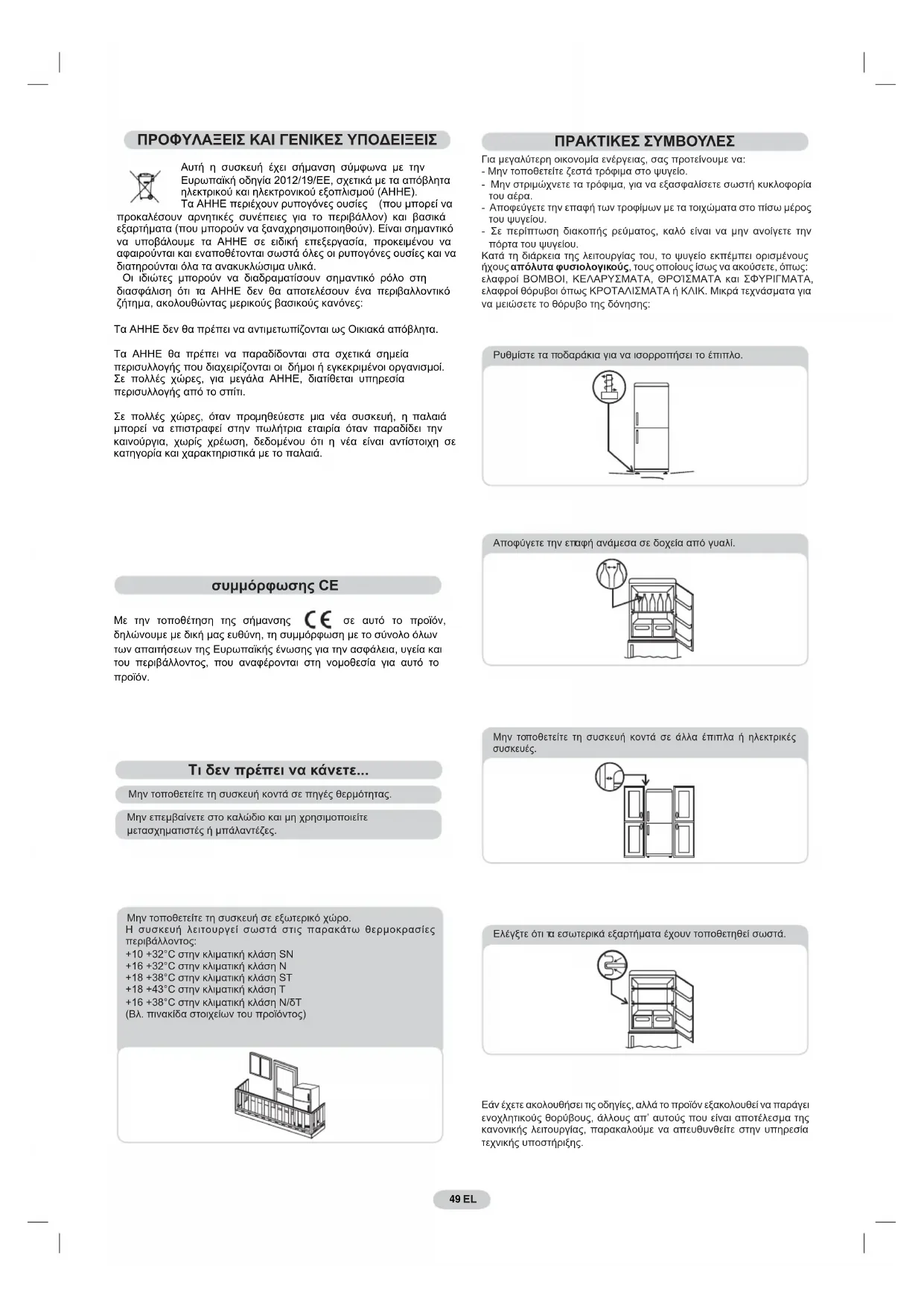 Μην τοποθετείτε τη συσκευή κοντά σε πηγές θερμότητας. Μην επεμβαίνετε στο καλώδιο και μη χρησιμοποιείτε μετασχηματιστές ή μπάλαντέζες.Μην τοποθετείτε τη συσκευή σε εξωτερικό χώρο.Η συσκευή λειτουργεί σωστά στις παρακάτω θερμοκρασίες περιβάλλοντος:+10 +32°C στην κλιματική κλάση SΝ+16 +32°C στην κλιματική κλάση Ν+18 +38°C στην κλιματική κλάση SΤ+18 +43°C στην κλιματική κλάση Τ+16 +38°C στην κλιματική κλάση Ν/δΤ(Βλ. πινακίδα στοιχείων του προϊόντος) ΠΡΑΚΤΙΚΕΣ ΣΥΜΒΟ