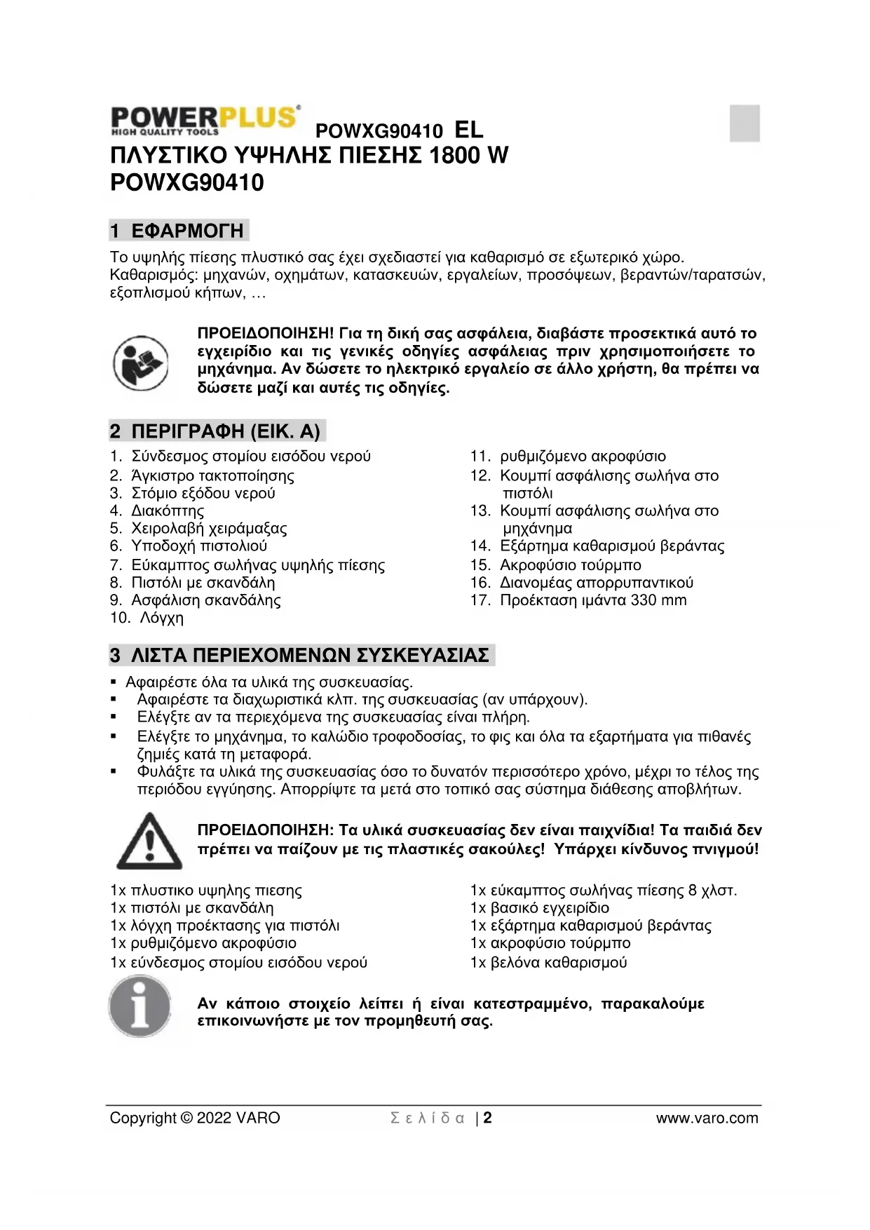 - Φυλάξτε τα υλικά της συσκευασίας όσο το δυνατόν περισσότερο χρόνο, μέχρι το τέλος της περιόδου εγγύησης. Απορρίψτε τα μετά στο τοπικό σας σύστημα διάθεσης αποβλήτων. ΠΡΟΕΙΔΟΠΟΙΗΣΗ: Τα υλικά συσκευασίας δεν είναι παιχνίδια! Τα παιδιά δεν πρέπει να παίζουν με τις πλαστικές σακούλες! Υπάρχει κίνδυνος πνιγμού! 1x πλυστικο υψηλης πιεσης 1x πιστόλι με σκανδάλη 1x λόγχη προέκτασης για πιστόλι 1x ρυθμιζόμενο ακροφύσιο 1x εύνδεσμος στομίου εισόδου νερού 1x εύκαμπτος σωλήνας πίεσης 8 χλστ. 1x βασικό εγχειρίδιο 1x εξάρτημα καθαρισμού βεράντας 1x ακροφύσιο τούρμπο 1x βελόνα καθαρισμού Αν κάποιο στοιχείο λείπει ή είναι κατεστραμμένο, παρακαλούμε επικοινωνήστε με τον προμηθευτή σας.POWXG90410 EL Copyright © 2022 VARO Σ ε λ ί δ α | 3 www.varo.com 4 ΠΡΟΣΘΕΤΕΣ ΟΔΗΓΙΕΣ ΑΣΦΑΛΕΙΑΣ ΓΙΑ ΚΑΘΑΡΙΣΤΙΚΑ ΥΨΗΛΗΣ