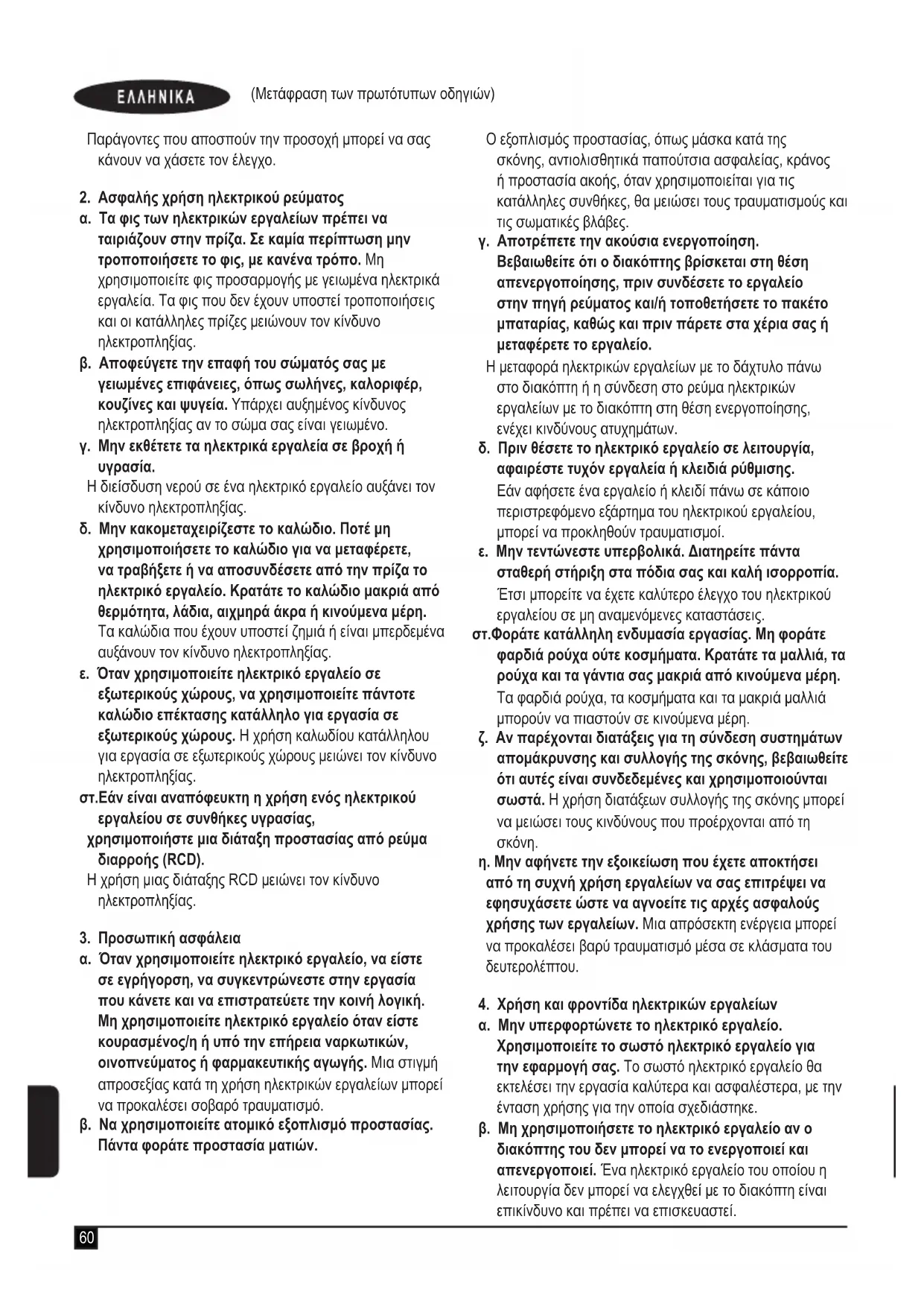 α. Μην υπερφορτώνετε το ηλεκτρικό εργαλείο. Χρησιμοποιείτε το σωστό ηλεκτρικό εργαλείο για την εφαρμογή σας. Το σωστό ηλεκτρικό εργαλείο θα εκτελέσει την εργασία καλύτερα και ασφαλέστερα, με την ένταση χρήσης για την οποία σχεδιάστηκε. β. Μη χρησιμοποιήσετε το ηλεκτρικό εργαλείο αν ο διακόπτης του δεν μπορεί να το ενεργοποιεί και απενεργοποιεί. Ένα ηλεκτρικό εργαλείο του οποίου η λειτουργία δεν μπορεί να ελεγχθεί με το διακόπτη είναι επικίνδυνο και πρέπει να επισκευαστεί.61 (Μετάφραση των πρωτότυπων οδηγιών) γ. Αποσυνδέστε το φις από την πηγή τροφοδοσίας και / ή αφαιρέστε την μπαταρία, εάν αποσπάσετε, από την τροφοδοσία πριν κάνετε οποιεσδήποτε προσαρμογές, αλλάζοντας την πρόσβαση ή αποθήκευση ηλεκτρικών εργαλείων. Αυτή η προληπτική ασφάλεια τα μέτρα μειώνουν τον κίνδυνο εκκίνησης του ηλεκτρικού εργαλείου κατά λάθος. δ. Να φυλάσσετε μακριά από παιδιά τα ηλεκτρικά εργαλεία που δεν χρησιμοποιείτε. Μην αφήνετε να χρησιμοποιήσουν ηλεκτρικό εργαλείο άτομα που δεν είναι εξοικειωμένα με αυτό ή άτομα που δεν έχουν διαβάσει αυτές τις οδηγίες χρήσης. Τα ηλεκτρικά εργαλεία είναι επικίνδυνα στα χέρια μη εκπαιδευμένων χρηστών. ε. Διατηρήστε τα ηλεκτρικά εργαλεία και τα εξαρτήματα. Ελέγχετε για προβλήματα ευθυγράμμισης ή για μάγκωμα των κινούμενων εξαρτημάτων, θραύση εξαρτημάτων, καθώς και για οποιοδήποτε άλλο πρόβλημα μπορεί να επηρεάσει τη λειτουργία των ηλεκτρικών εργαλείων. Αν το ηλεκτρικό εργαλείο έχει υποστεί ζημιά, φροντίστε να επισκευαστεί πριν το χρησιμοποιήσετε. Η ανεπαρκής συντήρηση των ηλεκτρικών εργαλείων αποτελεί αιτία πολλών ατυχημάτων. στ.Διατηρείτε τα κοπτικά εργαλεία κοφτερά και καθαρά. Τα κοπτικά εργαλεία με κοφτερές κοπτικές αιχμές που συντηρούνται σωστά έχουν λιγότερες πιθανότητες να μαγκώσουν και ελέγχονται ευκολότερα. ζ. Να χρησιμοποιείτε το ηλεκτρικό εργαλείο, τα αξεσουάρ και τις μύτες του εργαλείου κλπ. σύμφωνα με τις παρούσες οδηγίες, λαμβάνοντας υπόψη σας τις συνθήκες εργασίας και την εργασία που θέλετε να εκτελέσετε. Η χρήση του ηλεκτρικού εργαλείου για εργασίες διαφορετικές από τις προβλεπόμενες θα μπορούσε να οδηγήσει σε επικίνδυνη κατάσταση. η. Διατηρείτε τις λαβές και τις επιφάνειες κρατήματος στεγνές, καθαρές και απαλλαγμένες από λάδι και γράσο. Οι ολισθηρές λαβές και επιφάνειες κρατήματος. δεν επιτρέπουν τον ασφαλή χειρισμό και έλεγχο του εργαλείου σε μη αναμενόμενες καταστάσεις.