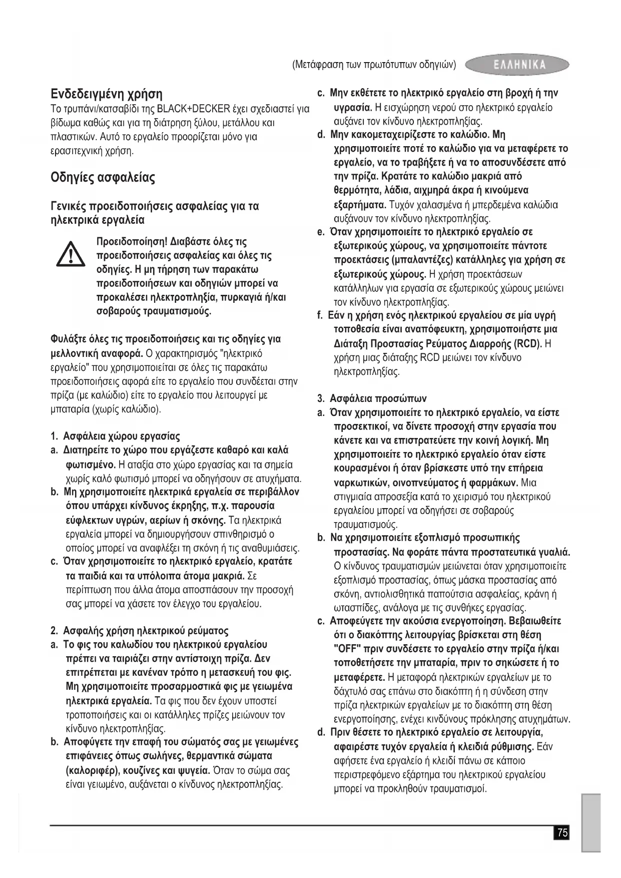 Η Black & Decker είναι σίγουρη για την ποιότητα των προϊόντων της και παρέχει μια εξαιρετική εγγύηση. Η παρούσα γραπτή εγγύηση αποτελεί πρόσθετο δικαίωμά σας και δεν ζημιώνει τα νόμιμα δικαιώματά σας. Η εγγύηση ισχύει εντός της επικράτειας των Κρατών Μελών της Ευρωπαϊκής Ένωσης και της Ευρωπαϊκής Ζώνης Ελευθέρων Συναλλαγών. Σε περίπτωση που κάποιο προϊόν της Black & Decker παρουσιάσει βλάβη εξαιτίας ελαττωματικών υλικών, ποιότητας εργασίας ή έλλειψης συμφωνίας με τις προδιαγραφές εντός 24 μηνών από την ημερομηνία αγοράς, η Black & Decker εγγυάται την αντικατάσταση των ελαττωματικών τμημάτων, την επισκευή προϊόντων που έχουν υποστεί εύλογη φθορά λόγω χρήσης ή την αντικατάσταση των προϊόντων προκειμένου να εξασφαλίσει την ελάχιστη ενόχληση στους πελάτες της, εκτός εάν: u Το προϊόν έχει χρησιμοποιηθεί σε εργασιακό, επαγγελματικό περιβάλλον ή έχει ενοικιαστεί. u Έχει γίνει εσφαλμένη χρήση του προϊόντος ή έχει παραμεληθεί. u Το προϊόν έχει υποστεί βλάβη από άλλα αντικείμενα, από ουσίες ή λόγω ατυχήματος. u Έχει γίνει προσπάθεια επισκευής από μη εξουσιοδοτημένα κέντρα επισκευών ή από προσωπικό που δεν ανήκει στο προσωπικό της Black & Decker. Για να ισχύσει η εγγύηση, πρέπει να υποβάλετε απόδειξη αγοράς στον πωλητή ή το εξουσιοδοτημένο κέντρο επισκευών. Ενημερωθείτε για το πλησιέστερο εξουσιοδοτημένο κέντρο επισκευών της περιοχής σας, επικοινωνώντας με τα γραφεία της Black & Decker στη διεύθυνση που αναγράφεται στο εγχειρίδιο. Επίσης, μια λίστα με τα εξουσιοδοτημένα κέντρα επισκευών της Black & Decker και πλήρεις λεπτομέρειες για τις υπηρεσίες που παρέχονται μετά την πώληση καθώς και στοιχεία επικοινωνίας υπάρχουν στο Διαδίκτυο, στη διεύθυνση: www.2helpU.com Παρακαλούμε επισκεφθείτε την ιστοσελίδα μας www. blackanddecker.eu για να καταχωρήσετε το νέο σας προϊόν BLACK+DECKER και για να ενημερώνεστε για τα νέα προϊόντα και τις ειδικές προσφορές. Περισσότερες πληροφορίες σχετικά με τη μάρκα BLACK+DECKER και τη σειρά των προϊόντων μας θα βρείτε στη διεύθυνση www. blackanddecker.euBelgië/Belgique/Luxembourg Stanley Black & Decker Belgium BVBA Tel. NL +32 15 47 37 65 www.blackanddecker.be Egide Walschaertsstraat 16 Tel. FR +32 15 47 37 66 enduser.be@sbdinc.com 2800 Mechelen Fax. +32 15 47 37 99 Danmark Black & Decker kundeservice.dk@sbdinc.com Roskildevej 22 www.blackanddecker.dk 2620 Albertslund Deutschland Stanley Black & Decker Deutschland Gmbh Tel. 06126 21-0 www.blackanddecker.de Black & Decker Str. 40, D - 65510 Idstein Fax 06126 21-2980 infobfge@sdbinc.com Ελλάδα Stanley Black & Decker (ΕΛΛΑΣ) Ε.Π.Ε Τηλ. 210-8981616 www.blackanddecker.gr ΓΡΑΦΕΙΑ:Στράβωνος 7 & Βουλιαγμένης Φαξ 210-8983570 greece.service@sbdinc.com 166 74 Γλυφάδα - Αθήνα SERVICE: Ημερος Τόπος 2 -Χάνι Αδάμ Τηλ. Service 210-8985208 193 00 Ασπρόπυργος - Αθήνα Φαξ 210-5597598 España Stanley Black & Decker Ibérica, S.C.A. Tel. 934 797 400 www.blackanddecker.es Parc de Negocis “Mas Blau” Fax 934 797 419 respuesta.posventa@sbdinc.co Edicio Muntadas, c/Bergadá, 1, Of. A6 08820 El Prat de Llobregat (Barcelona) France Black & Decker (France) S.A.S. Tel. 04 72 20 39 20 www.blackanddecker.fr 5 allée des Hêtres Fax 04 72 20 39 00 B.P. 30084 69579 Limonest Cédex Helvetia ROFO AG Tel. 026-6749393 www.blackanddecker.ch Gewerbezone Seeblick Fax 026-6749394 service@rofoag.ch 3213 Kleinbösingen Italia Stanley Black & Decker Italia Tel. 039-9590200 www.blackanddecker.it Via Energypark 6 Fax 039-9590313 service.italia@sbdinc.com 20871 Vimercante (MB) Numero verde 800-213935 Nederland Stanley Black & Decker Netherlands BV Tel. +31 164 283 065 www.blackanddecker.nl Holtum Noordweg 35, 6121 RE BORN Fax +31 164 283 200 enduser.nl@sbdinc.com Postbus 83, 6120 AB BORN Norge Black & Decker kundeservice.no@sbdinc.com Postboks 4613, Nydalen www.blackanddecker.no 0405 Oslo Österreich Stanley Black & Decker Austria GmbH Tel. 01 66116-0 www.blackanddecker.at Oberlaaerstraße 248, A-1230 Wien Fax 01 66116-614 service.austria@sbdinc.com Portugal Black & Decker Limited SARL Tel. 214667500 www.blackanddecker.pt Quinta da Fonte - Edifício Q55 D. Diniz Fax 214667580 resposta.posvenda@sbdinc.com Rua dos Malhões, 2 e 2A - Piso 2 Esquerdo 2770 - 071 Paço de Arcos Suomi Black & Decker asiakaspalvelu.@sbdinc.com PL47 www.blackanddecker. 00521, Helsinki Sverige Black & Decker AB kundservice.se@sbdinc.com Box 94, 431 22 Mölndal www.blackanddecker.se Türkiy