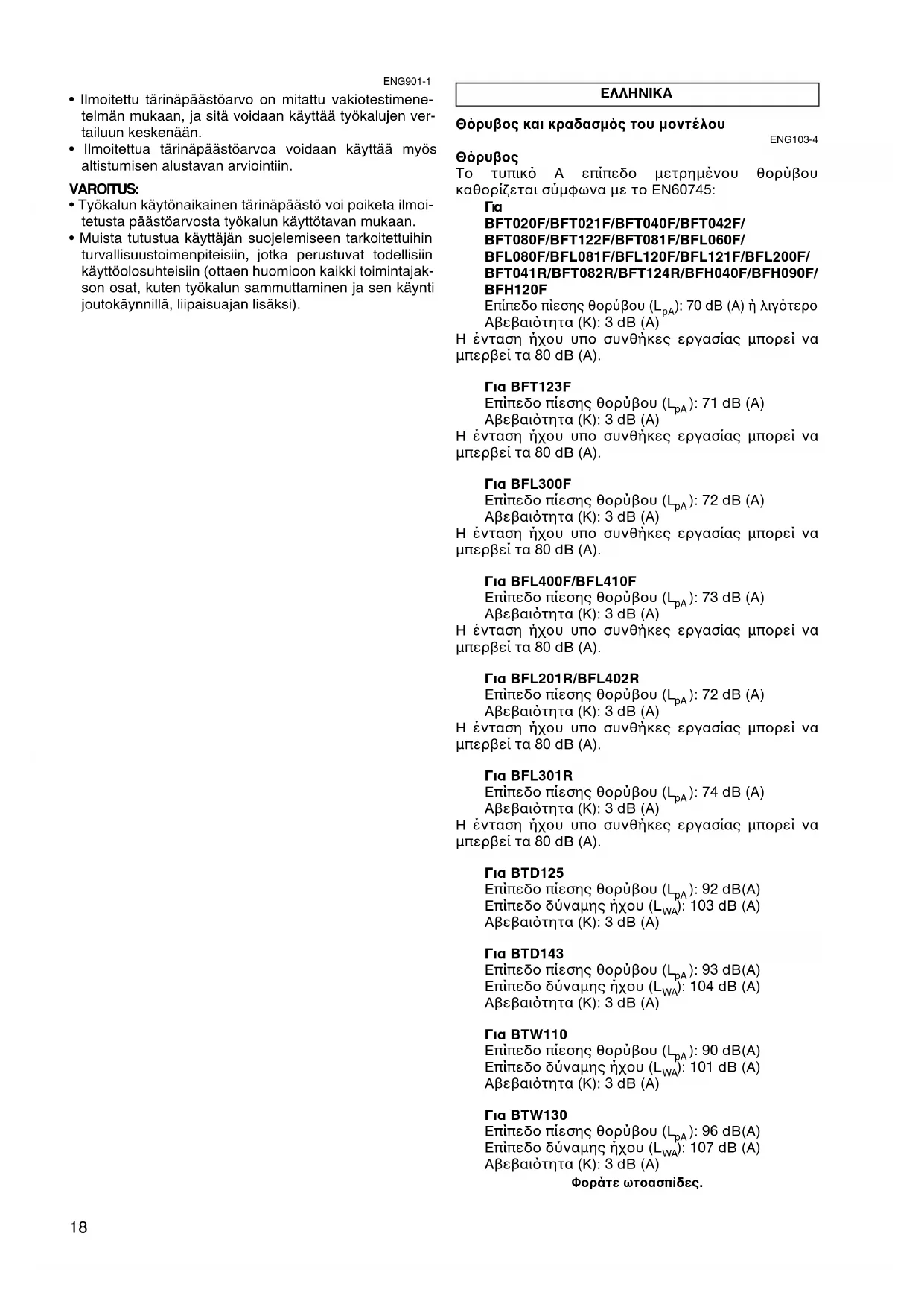 - Φροντίστε να λάβετε τα κατάλληλα μέτρα προστασίας του χειριστή βάσει υπολογισμού της έκθεσης σε πραγματικές συνθήκες χρήσης (λαμβάνοντας υπψη λες τις συνιστώσες του κύκλου λειτουργίας πως τους χρνους που το εργαλείο είναι εκτς λειτουργίας και ταν βρίσκεται σε αδρανή λειτουργία πέραν του χρνου ενεργοποίησης).20 Szumy i drgania ENG103-4 Szumy Typowy A-ważony hałas określony według EN60745: Dla BFT020F/BFT021F/BFT040F/BFT042F/ BFT080F/BFT122F/BFT081F/BFL060F/ BFL080F/BFL081F/BFL120F/BFL121F/BFL200F/ BFT041R/BFT082R/BFT124R/BFH040F/ BFH090F/ BFH120F Poziom ciśnienia dźwięku (L
