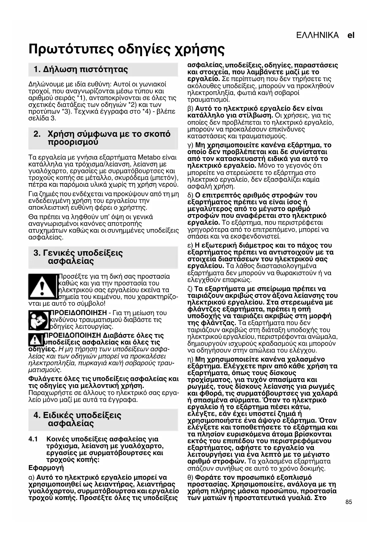 Πρωτότυπες οδηγίες χρήσης Δηλώνουμε με ιδία ευθύνη: Αυτοί οι γωνιακοί τροχοί, που αναγνωρίζονται μέσω τύπου και αριθμού σειράς *1), ανταποκρίνονται σε όλες τις σχετικές διατάξεις των οδηγιών *2) και των προτύπων *3). Τεχνικά έγγραφα στο *4) - βλέπε σελίδα 3. Τα εργαλεία με γνήσια εξαρτήματα Metabo είναι κατάλληλα για τρόχισμα/λείανση, λείανση με γυαλόχαρτο, εργασίες με συρματόβουρτσες και τροχούς κοπής σε μέταλλο, σκυρόδεμα (μπετόν), πέτρα και παρόμοια υλικά χωρίς τη χρήση νερού. Για ζημιές που ενδέχεται να προκύψουν από τη μη ενδεδειγμένη χρήση του εργαλείου την αποκλειστική ευθύνη φέρει ο χρήστης. Θα πρέπει να ληφθούν υπ’ όψη οι γενικά αναγνωρισμένοι κανόνες αποτροπής ατυχημάτων καθώς και οι συνημμένες υποδείξεις