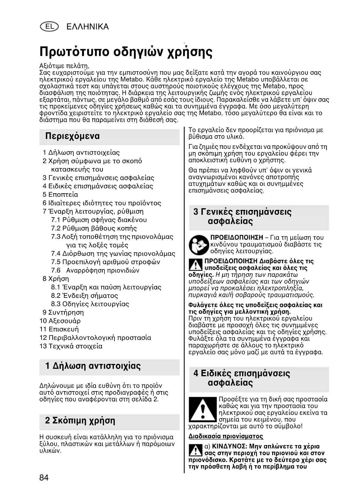 ΚΙΝ∆ΥΝΟΣ: Μην απλώνετε τα χέρια σας στην περιοχή του πριονιού και στον πριονδισκο. Κρατάτε µε το δεύτερο χέρι σας την πρσθετη λαβή ή το περίβληµα του Πρωττυπο οδηγιών χρήσης Αξιτιµε πελάτη, Σας ευχαριστούµε για την εµπιστοσύνη που µας δείξατε κατά την αγορά του καινούργιου σας ηλεκτρικού εργαλείου της Metabo. Κάθε ηλεκτρικ εργαλείο της Metabo υποβάλλεται σε σχολαστικά τεστ και υπάγεται στους αυστηρούς ποιοτικούς ελέγχους της Metabo, προς διασφάλιση της ποιτητας. Η διάρκεια της λειτουργικής ζωµής ενς ηλεκτρικού εργαλείου εξαρτάται, πάντως, σε µεγάλο βαθµ απ εσάς τους ίδιους. Παρακαλείσθε να λάβετε υπ’ ψιν σας τις προκείµενες οδηγίες χρήσεως καθώς και τα συνηµµένα έγγραφα. Με σο µεγαλύτερη φροντίδα χειριστείτε το ηλεκτρικ εργαλείο σας της Metabo, τσο µεγαλύτερο θα είναι και το διάστηµα που θα παραµείνει στη διάθεσή σας.