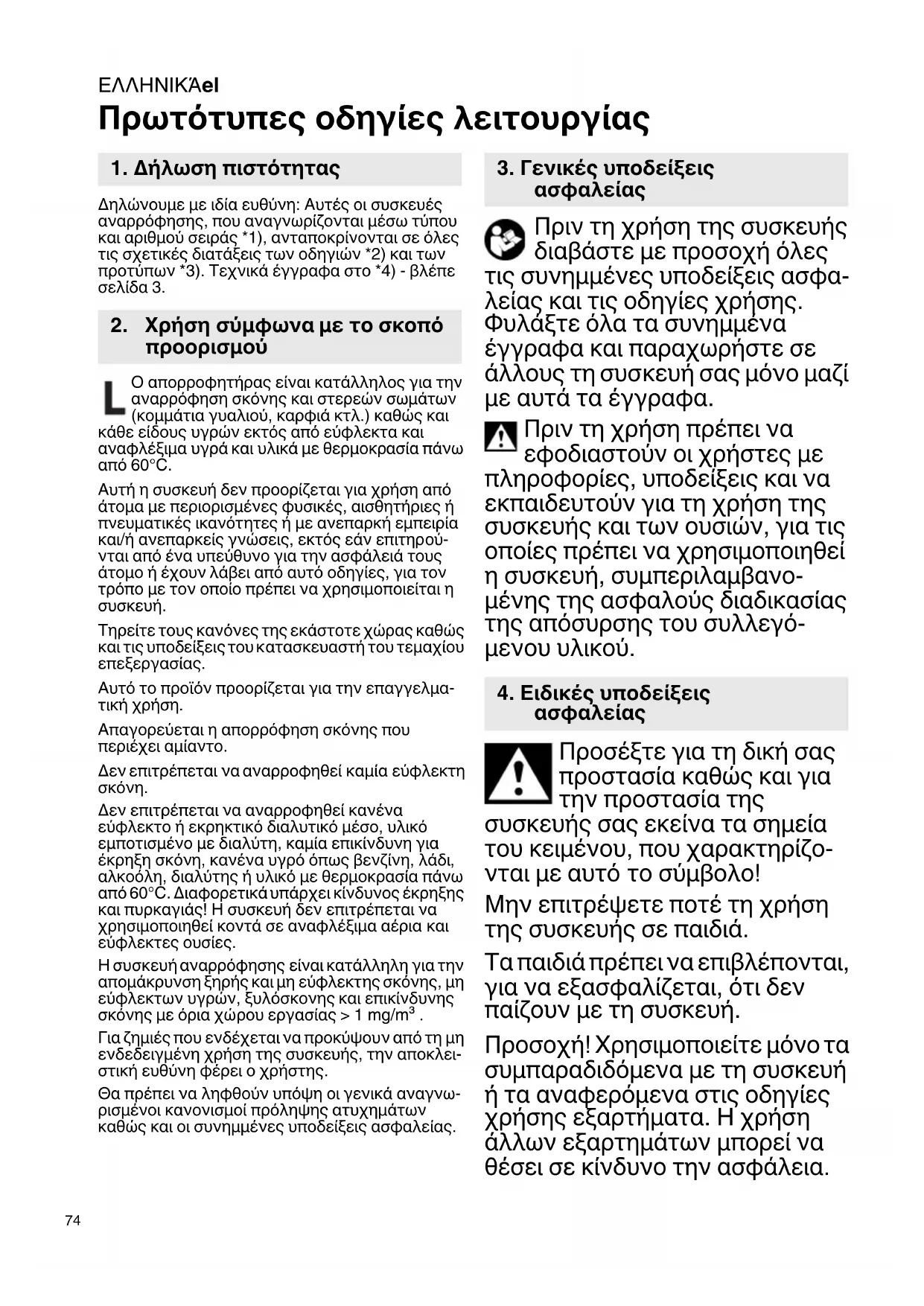 Πρωτότυπες οδηγίες λειτουργίας Δηλώνουμε με ιδία ευθύνη: Αυτές οι συσκευές αναρρόφησης, που αναγνωρίζονται μέσω τύπου και αριθμού σειράς *1), ανταποκρίνονται σε όλες τις σχετικές διατάξεις των οδηγιών *2) και των προτύπων *3). Τεχνικά έγγραφα στο *4) - βλέπε σελίδα 3. Ο απορροφητήρας είναι κατάλληλος για την αναρρόφηση σκόνης και στερεών σωμάτων (κομμάτια γυαλιού, καρφιά κτλ.) καθώς και κάθε είδους υγρών εκτός από εύφλεκτα και αναφλέξιμα υγρά και υλικά με θερμοκρασία πάνω από 60°C. Αυτή η συσκευή δεν προορίζεται για χρήση από άτομα με περιορισμένες φυσικές, αισθητήριες ή πνευματικές ικανότητες ή με ανεπαρκή εμπειρία και/ή ανεπαρκείς γνώσεις, εκτός εάν επιτηρού- νται από ένα υπεύθυνο για την ασφάλειά τους άτομο ή έχουν λάβει από αυτό οδηγίες, για τον τρόπο με τον οποίο πρέπει να χρησιμοποιείται η