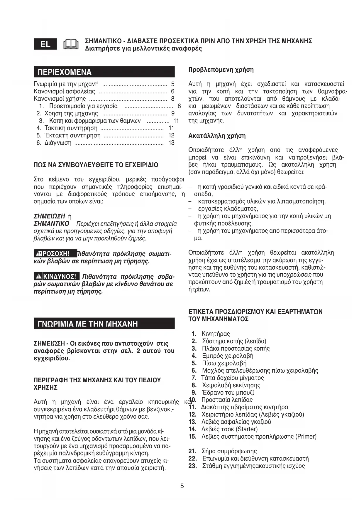 ΣΗΜΑΝΤΙΚΟ - ΔΙΑΒΑΣΤΕ ΠΡΟΣΕΚΤΙΚΑ ΠΡΙΝ ΑΠΟ ΤΗΝ ΧΡΗΣΗ ΤΗΣ ΜΗΧΑΝΗΣ Διατηρήστε για μελλοντικές αναφορές Προβλεπόμενη χρήση Αυτή η μηχανή έχει σχεδιαστεί και κατασκευαστεί για την κοπή και την τακτοποίηση των θαμνοφρα- χτών, που αποτελούνται από θάμνους με κλαδά- κια μειωμένων διαστάσεων και σε κάθε περίπτωση αναλογίας των δυνατοτήτων και χαρακτηριστικών της μηχανής. Ακατάλληλη χρήση Οποιαδήποτε άλλη χρήση από τις αναφερόμενες μπορεί να είναι επικίνδυνη και να προξενήσει βλά- βες ή/και τραυματισμούς. Ως ακατάλληλη χρήση (σαν παράδειγμα, αλλά όχι μόνο) θεωρείται: – η κοπή γρασιδιού γενικά και ειδικά κοντά σε κρά-