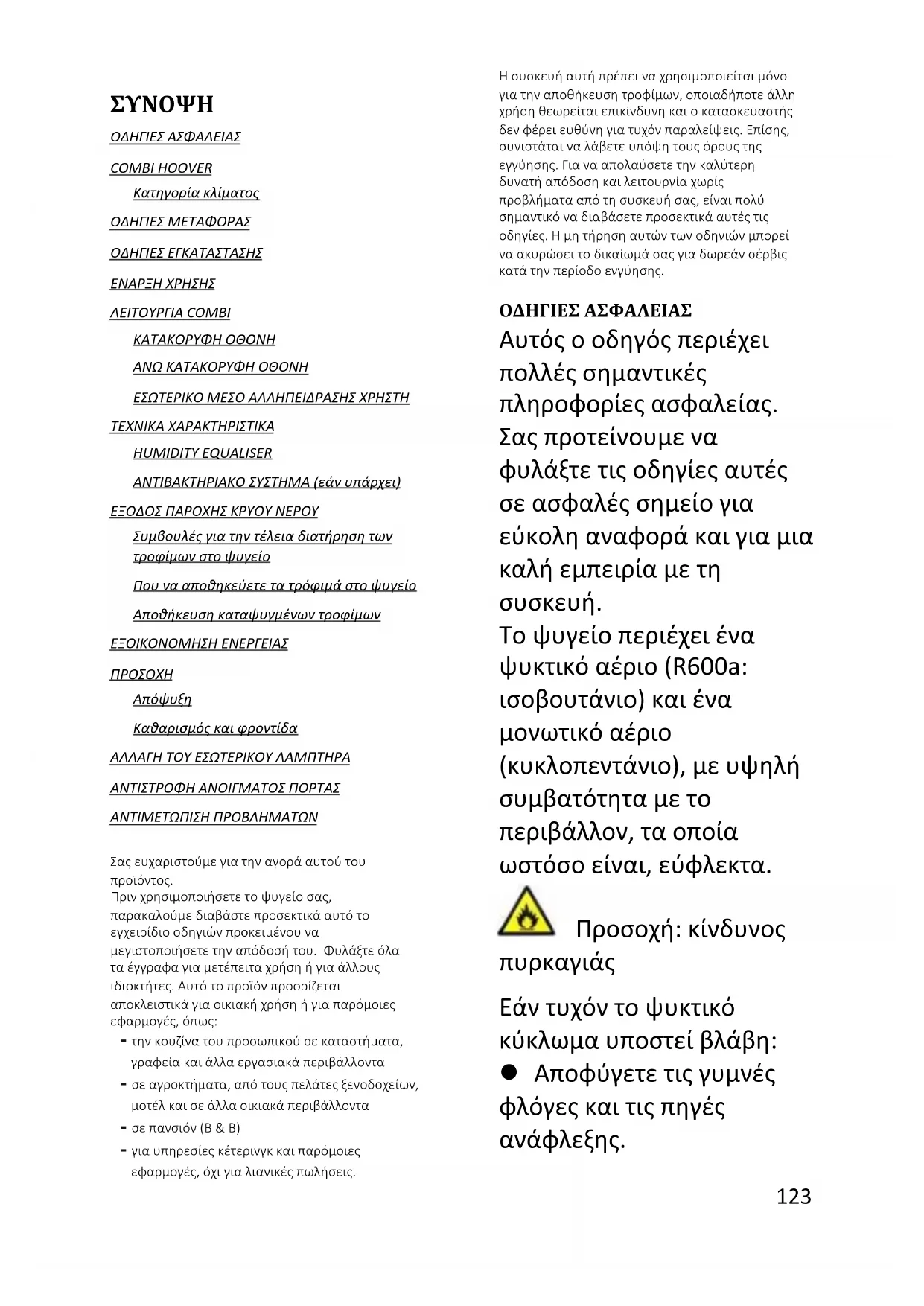 ΟΔΗΓΙΕΣ ΑΣΦΑΛΕΙΑΣ COMBI HOOVER Κατηγορία κλίματος ΟΔΗΓΙΕΣ ΜΕΤΑΦΟΡΑΣ ΟΔΗΓΙΕΣ ΕΓΚΑΤΑΣΤΑΣΗΣ ΕΝΑΡΞΗ ΧΡΗΣΗΣ ΛΕΙΤΟΥΡΓΙΑ COMBI ΚΑΤΑΚΟΡΥΦΗ ΟΘΟΝΗ ΑΝΩ ΚΑΤΑΚΟΡΥΦΗ ΟΘΟΝΗ ΕΣΩΤΕΡΙΚΟ ΜΕΣΟ ΑΛΛΗΠΕΙΔΡΑΣΗΣ ΧΡΗΣΤΗ ΤΕΧΝΙΚΑ ΧΑΡΑΚΤΗΡΙΣΤΙΚΑ HUMIDITY EQUALISER ΑΝΤΙΒΑΚΤΗΡΙΑΚΟ ΣΥΣΤΗΜΑ (εάν υπάρχει) ΕΞΟΔΟΣ ΠΑΡΟΧΗΣ ΚΡΥΟΥ ΝΕΡΟΥ Συμβουλές για την τέλεια διατήρηση των τροφίμων στο ψυγείο Που να αποθηκεύετε τα τρόφιμά στο ψυγείο Αποθήκευση καταψυγμένων τροφίμων ΕΞΟΙΚΟΝΟΜΗΣΗ ΕΝΕΡΓΕΙΑΣ ΠΡΟΣΟΧΗ Απόψυξη Καθαρισμός και φροντίδα ΑΛΛΑΓΗ ΤΟΥ ΕΣΩΤΕΡΙΚΟΥ ΛΑΜΠΤΗΡΑ ΑΝΤΙΣΤΡΟΦΗ ΑΝΟΙΓΜΑΤΟΣ ΠΟΡΤΑΣ ΑΝΤΙΜΕΤΩΠΙΣΗ ΠΡΟΒΛΗΜΑΤΩΝ Σας ευχαριστούμε για την αγορά αυτού του προϊόντος. Πριν χρησιμοποιήσετε το ψυγείο σας, παρακαλούμε διαβάστε προσεκτικά αυτό το εγχειρίδιο οδηγιών προκειμένου να μεγιστοποιήσετε την απόδοσή του. Φυλάξτε όλα τα έγγραφα για μετέπειτα χρήση ή για άλλους ιδιοκτήτες. Αυτό το προϊόν προορίζεται αποκλειστικά για οικιακή χρήση ή για παρόμοιες εφαρμογές, όπως: - την κουζίνα του προσωπικού σε καταστήματα, γραφεία και άλλα εργασιακά περιβάλλοντα - σε αγροκτήματα, από τους πελάτες ξενοδοχείων, μοτέλ και σε άλλα οικιακά περιβάλλοντα - σε πανσιόν (B & B) - για υπηρεσίες κέτερινγκ και παρόμοιες εφαρμογές, όχι για λιανικές πωλήσεις. Η συσκευή αυτή πρέπει να χρησιμοποιείται μόνο για την αποθήκευση τροφίμων, οποιαδήποτε άλλη χρήση θεωρείται επικίνδυνη και ο κατασκευαστής δεν φέρει ευθύνη για τυχόν παραλείψεις. Επίσης, συνιστάται να λάβετε υπόψη τους όρους της εγγύησης. Για να απολαύσετε την καλύτερη δυνατή απόδοση και λειτουργία χωρίς προβλήματα από τη συσκευή σας, είναι πολύ σημαντικό να διαβάσετε προσεκτικά αυτές τις οδηγίες. Η μη τήρηση αυτών των οδηγιών μπορεί να ακυρώσει το δικαίωμά σας για δωρεάν σέρβις κατά την περίοδο εγγύησης. ΟΔΗΓΙΕΣ ΑΣΦΑΛΕΙΑΣ Αυτός ο οδηγός περιέχει πολλές σημαντικές πληροφορίες ασφαλείας. Σας προτείνουμε να φυλάξτε τις οδηγίες αυτές σε ασφαλές σημείο για εύκολη αναφορά και για μια καλή εμπειρία με τη