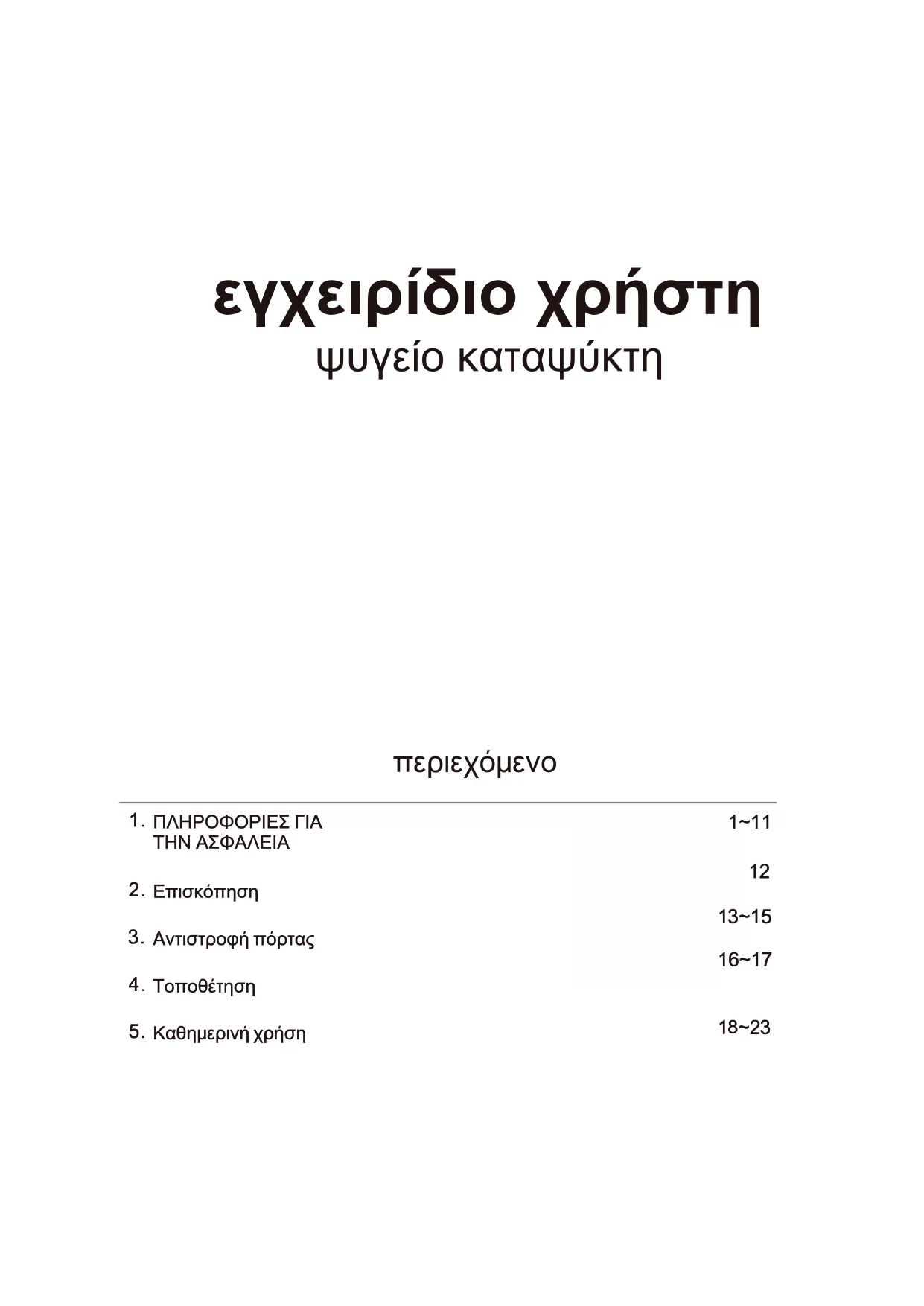 ~23 εγχειρίδιο χρήστη ψυγείο καταψύκτηΣας ευχαριστούμε για την αγορά αυτού του προϊόντος. Πριν χρησιμοποιήσετε το ψυγείο σας, σας παρακαλούμε να διαβάσετε προσεκτικά αυτό το εγχειρίδιο οδηγιών χρήσης έτσι ώστε να μεγιστοποιήσετε την απόδοση του. Φυλάξτε όλα τα έγγραφα για μελλοντική χρήση ή για άλλους ιδιοκτήτες. Αυτό το προϊόν προορίζεται αποκλειστικά για οικιακή χρήση ή παρόμοιες εφαρμογές όπως: - την περιοχή της κουζίνας για προσωπικό καταστημάτων, γραφείων και άλλα περιβάλλοντα εργασίας - σε φάρμες, από πελάτες σε ξενοδοχεία, πανδοχεία και άλλα περιβάλλοντα οικιακού