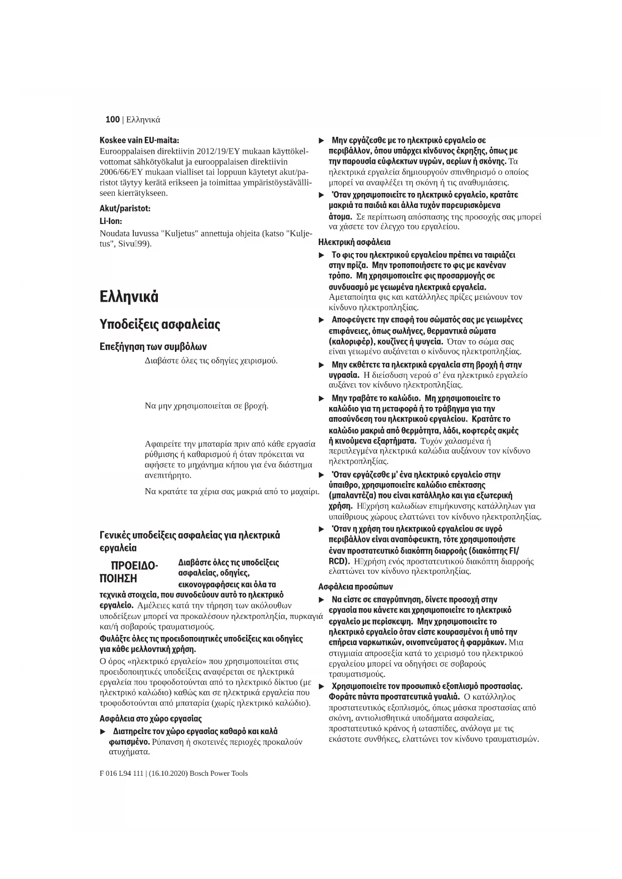 u Εποπτεύετε τα παιδιά. Έτσι εξασφαλίζετε ότι τα παιδιά δεν θα παίξουν με το φορτιστή. u Φορτίζετε μόνο μπαταρίες ιόντων λιθίου Bosch χωρητικότητας από 1,5 Ah (από 5 στοιχεία). Η τάση της Bosch Power Tools F 016 L94 111 | (16.10.2020)104 | Ελληνικά μπαταρίας πρέπει να ταιριάζει με την τάση φόρτισης μπαταρίας του φορτιστή. Μη φορτίσετε μπαταρίες που δεν είναι επαναφορτιζόμενες. Διαφορετικά υπάρχει κίνδυνος έκρηξης και πυρκαγιάς. Μην εκθέτετε τη συσκευή στη βροχή και την υγρασία. Η διείσδυση νερού σ’ ένα φορτιστή αυξάνει τον κίνδυνο ηλεκτροπληξίας. Βγάλτε αμέσως το φις από την πρίζα, αν το καλώδιο έχει φθαρεί ή κοπεί u Διατηρείτε τον φορτιστή καθαρό. Με τη ρύπανση υπάρχει ο κίνδυνος ηλεκτροπληξίας. u Πριν από κάθε χρήση ελέγχετε τον φορτιστή, το καλώδιο και το φις. Μη χρησιμοποιείτε τον φορτιστή, εφόσον διαπιστώσετε ζημιές. Μην ανοίξετε μόνοι σας τον φορτιστή και αναθέστε την επισκευή μόνο σε ειδικευμένο τεχνικό προσωπικό και μόνο με γνήσια ανταλλακτικά. Τυχόν χαλασμένοι φορτιστές, χαλασμένα καλώδια και φις αυξάνουν τον κίνδυνο μιας ηλεκτροπληξίας. u Μη λειτουργείτε τον φορτιστή πάνω σε εύφλεκτο υπόστρωμα (π.χ. χαρτί, υφάσματα κλπ.) ή σε εύφλεκτο περιβάλλον. Λόγω της δημιουργούμενης κατά τη φόρτιση θέρμανσης του φορτιστή υπάρχει κίνδυνος πυρκαγιάς. u Μην καλύπτετε τις σχισμές αερισμού του φορτιστή. Διαφορετικά μπορεί να υπερθερμανθεί ο φορτιστής και να μη λειτουργεί πλέον σωστά. u Για αυξημένη ηλεκτρική ασφάλεια συνιστούμε την χρήση διακόπτη διαφορικής προστασίας διαρροής με διαφορικό ρεύμα ενεργοποίησης 30mA. Ελέγχετε πάντα τον διακόπτη διαφορικής προστασίας πριν από τη χρήση.