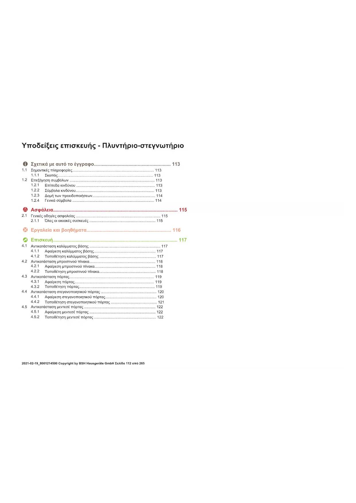 Ταυτοποίηση απαραίτητων εργαλείων Ταυτοποίηση απαραίτητων προϋποθέσεων Ταυτοποίηση μιας συνθήκης (αν ..., κατόπιν ...) Ταυτοποίηση αποτελέσματος Έναρξη Ταυτοποίηση ενός πλήκτρου ή κουμπιού [00123456] Ταυτοποίηση ενός κωδικού ανταλλακτικού Κατάσταση Ταυτοποίηση εμφανιζόμενου κειμένου/ παραθύρου (στην οθόνη της συσκευής) Πίνακας3: Γενικά σύμβολα Σχετικά με αυτό το έγγραφο 2021-02-19_8001214500 Copyright by BSH Hausgeräte GmbH Σελίδα114από265Ασφάλεια