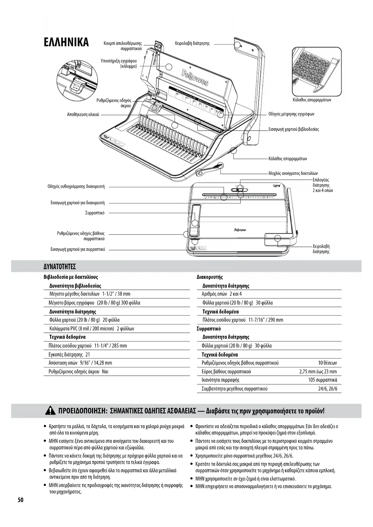 Οδηγός ευθυγράμμισης διακορευτή Ρυθμιζόμενος οδηγός βάθους συρραπτικού Εισαγωγή χαρτιού για συρραπτικό Εισαγωγή χαρτιού για διακορευτή t Κρατήστε τα μαλλιά, τα δάχτυλα, τα κοσμήματα και τα χαλαρά ρούχα μακριά από όλα τα κινούμενα μέρη. t ΜΗΝ εισάγετε ξένα αντικείμενα στα ανοίγματα του διακορευτή και του συρραπτικού πέρα από φύλλα χαρτιού και εξώφυλλα. t Πάντοτε να κάνετε δοκιμή της διάτρησης με πρόχειρα φύλλα χαρτιού και να ρυθμίζετε το μηχάνημα προτού τρυπήσετε τα τελικά έγγραφα. t Βεβαιωθείτε ότι έχουν αφαιρεθεί όλα τα συρραπτικά και άλλα μεταλλικά αντικείμενα πριν από τη διάτρηση. t ΜΗΝ υπερβαίνετε τις προδιαγραφές της ικανότητας διάτρησης ή συρραφής του μηχανήματος. t Φροντίστε να αδειάζεται περιοδικά ο κάλαθος απορριμμάτων. Εάν δεν αδειάζει ο κάλαθος απορριμμάτων, μπορεί να προκύψει ζημιά στον εξοπλισμό. t Πάντοτε να εισάγετε τους δακτυλίους με το περιστροφικό κομμάτι στραμμένο μακριά από εσάς και την ανοιχτή πλευρά στραμμένη προς τα πάνω. t Χρησιμοποιείτε μόνο συρραπτικά μεγέθους 24/6, 26/6. t Κρατάτε τα δάκτυλά σας μακριά από την περιοχή απελευθέρωσης των συρραπτικών όταν χρησιμοποιείτε το μηχάνημα ή καθαρίζετε κάποια εμπλοκή. t ΜΗΝ χρησιμοποιείτε αν έχει ζημιά ή είναι ελαττωματικό. t ΜΗΝ επιχειρήσετε να αποσυναρμολογήσετε ή να επισκευάσετε το μηχάνημα. ΠΡΟΕΙΔΟΠΟΙΗΣΗ: ΣΗΜΑΝΤΙΚΕΣ ΟΔΗΓΙΕΣ ΑΣΦΑΛΕΙΑΣ — Διαβάστε τις πριν χρησιμοποιήσετε το προϊόν!51 ΔΙΑΜΕΤΡΟΣ ΔΑΚΤΥΛΙΟΥ & ΜΕΓΕΘΗ ΕΓΓΡΑΦΩΝ