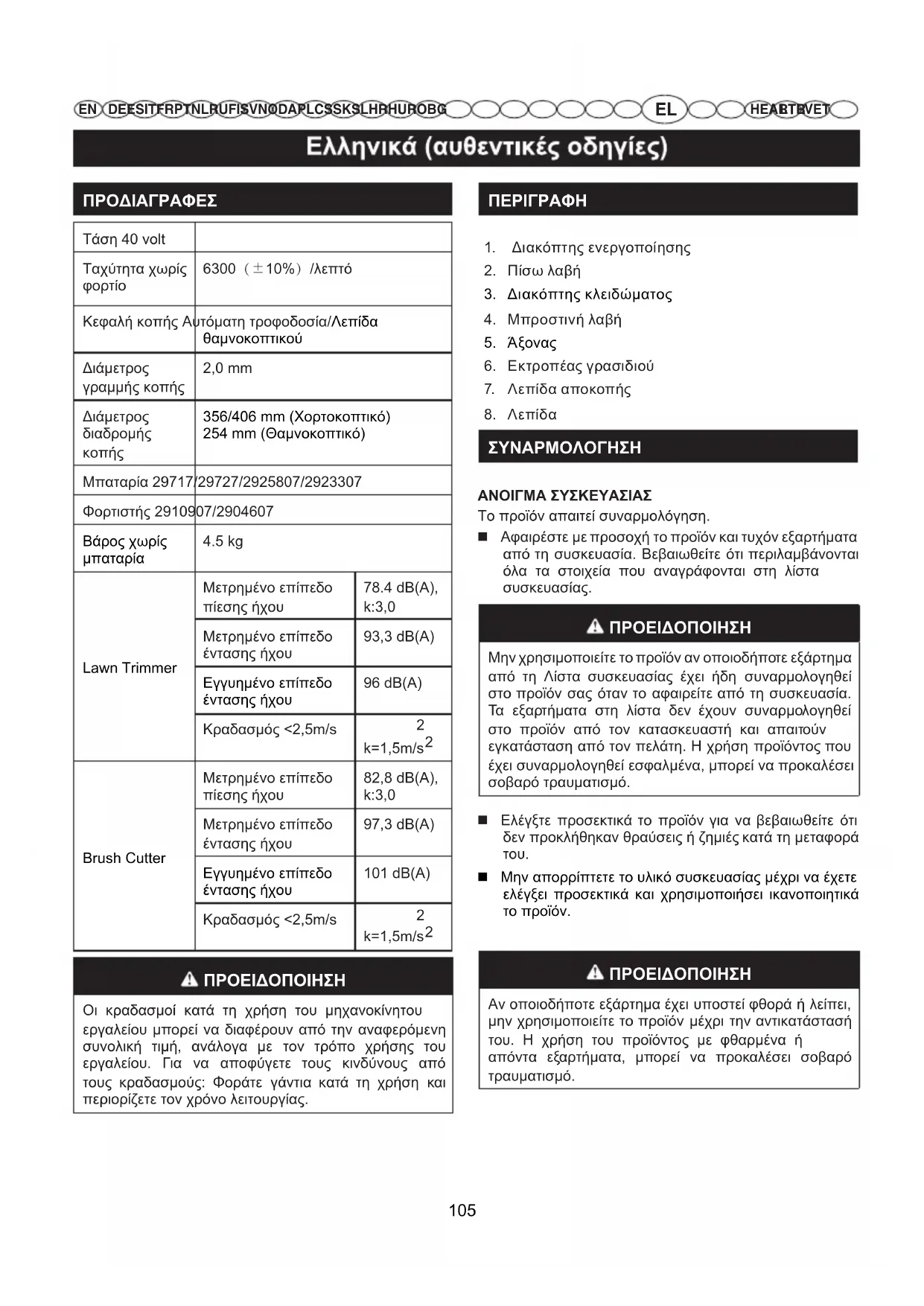 ΠΡΟΕΙΔΟΠΟΙΗΣΗ Αν οποιοδήποτε εξάρτημα έχει υποστεί φθορά ή λείπει, μην χρησιμοποιείτε το προϊόν μέχρι την αντικατάστασή του. Η χρήση του προϊόντος με φθαρμένα ή απόντα εξαρτήματα, μπορεί να προκαλέσει σοβαρό τραυματισμό. 105EL DE ES IT FR PT NL RU FI SV NO DA PL CS SK SL HR HU RO BG HEAR TR