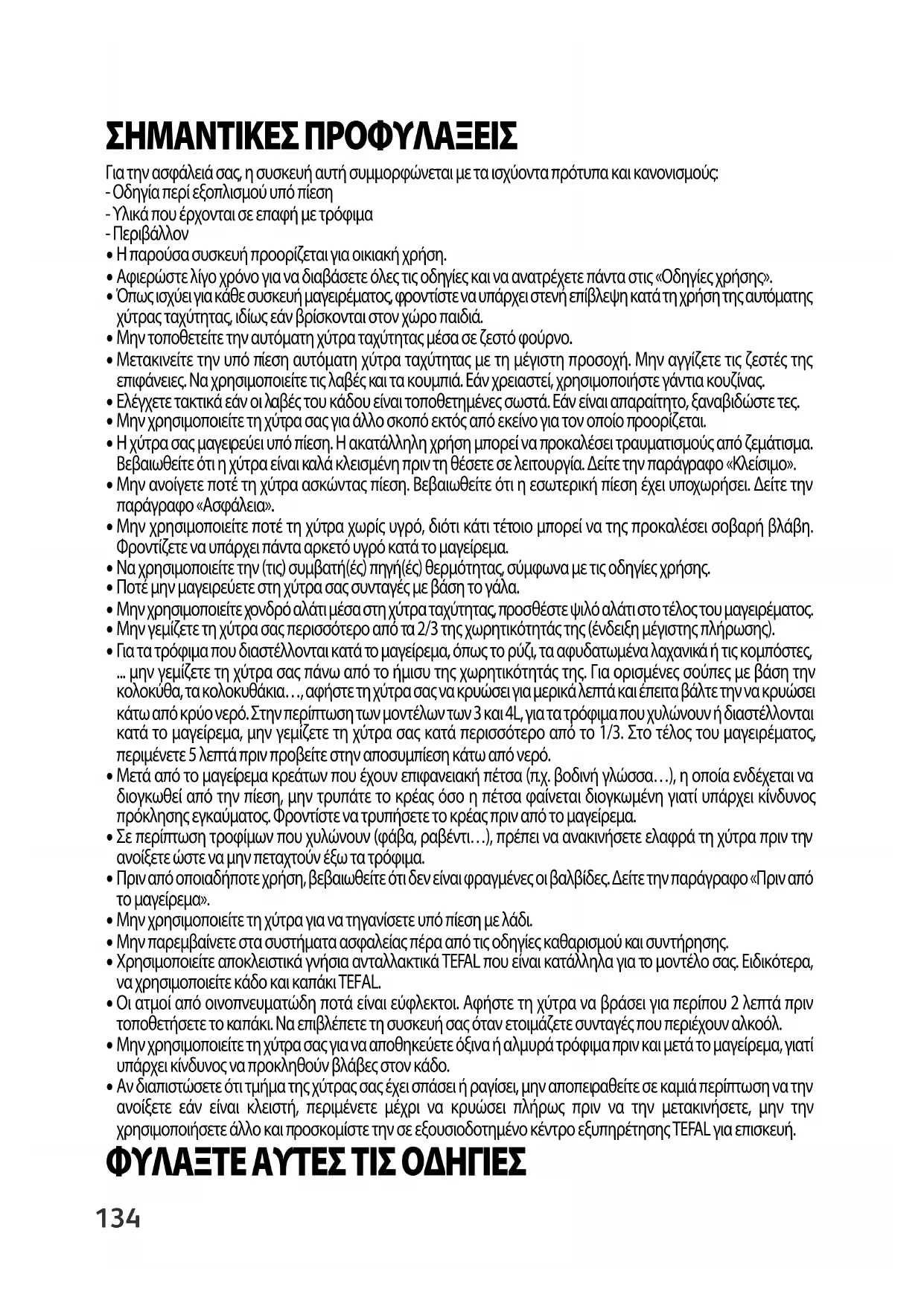 - Αν διαπιστώσετε ότι τμήμα της χύτρας σας έχει σπάσει ή ραγίσει, μην αποπειραθείτε σε καμιά περίπτωση να την ανοίξετε εάν είναι κλειστή, περιμένετε μέχρι να κρυώσει πλήρως πριν να την μετακινήσετε, μην την χρησιμοποιήσετε άλλο και προσκομίστε την σε εξουσιοδοτημένο κέντρο εξυπηρέτησης TEFAL για επισκευή. ΦΥΛΑΞΤΕ ΑΥΤΕΣ ΤΙΣ ΟΔΗΓΙΕΣ TE_SECURE-5_NE2INSA4_Mise en page 1 12/11/2015 16:22 Page134135