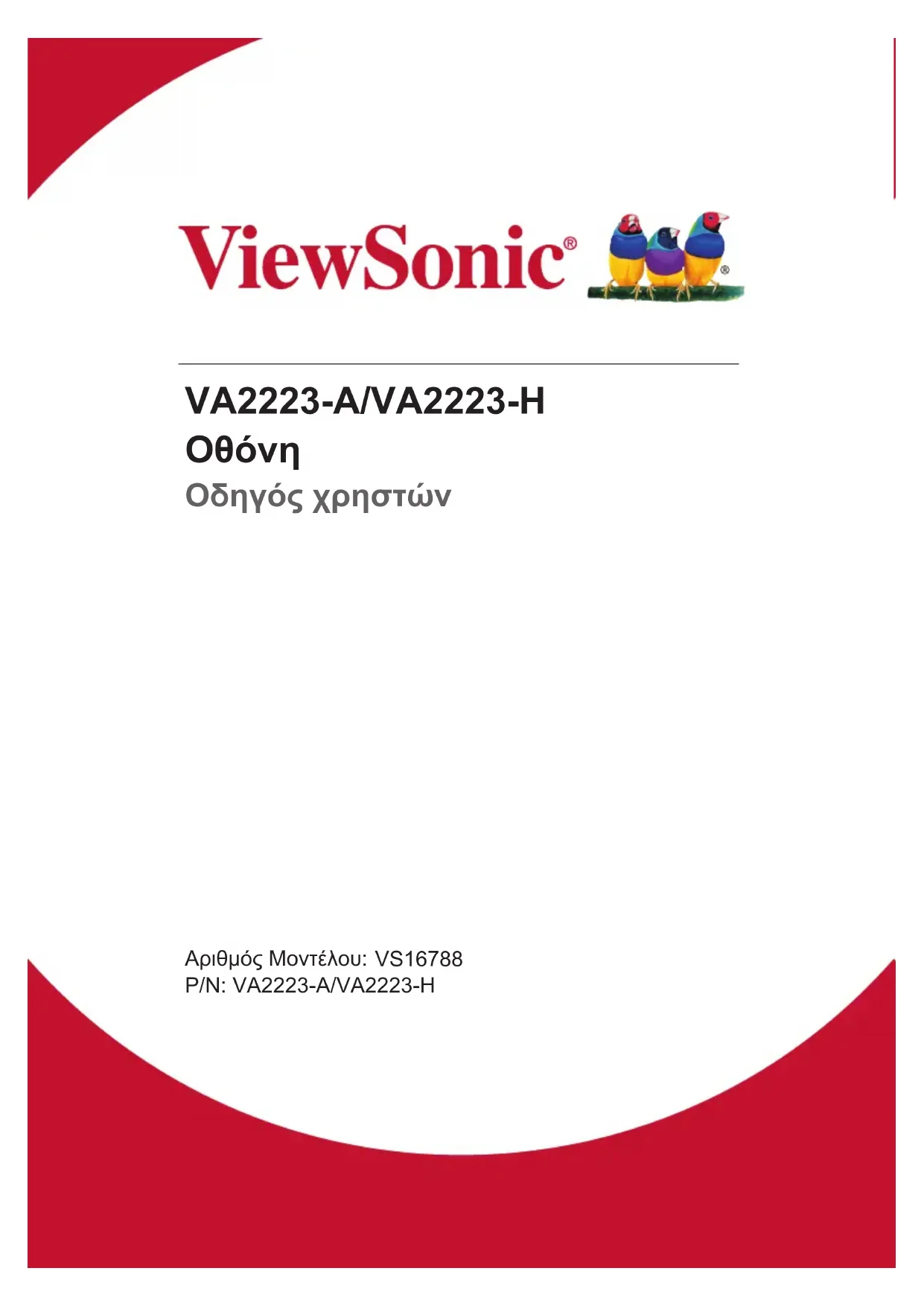 Οδηγός χρηστών Αριθμός Μοντέλου: VS16788 P/N: VA2223-A/VA2223-HΣας ευχαριστούμε που επιλέξατε τη ViewSonic Με περισσότερα από 30 χρόνια στην κορυφή της παγκόσμιας αγοράς στον τομέα της παροχής οπτικών λύσεων, η ViewSonic ξεπερνά διαρκώς τις παγκόσμιες προσδοκίες για τεχνολογική εξέλιξη, καινοτομία και απλότητα. Στη ViewSonic πιστεύουμε ότι τα προϊόντα μας έχουν θετικό αντίκτυπο σε ολόκληρο τον κόσμο και είμαστε βέβαιοι ότι το προϊόν ViewSonic που επιλέξατε θα σας ικανοποιήσει