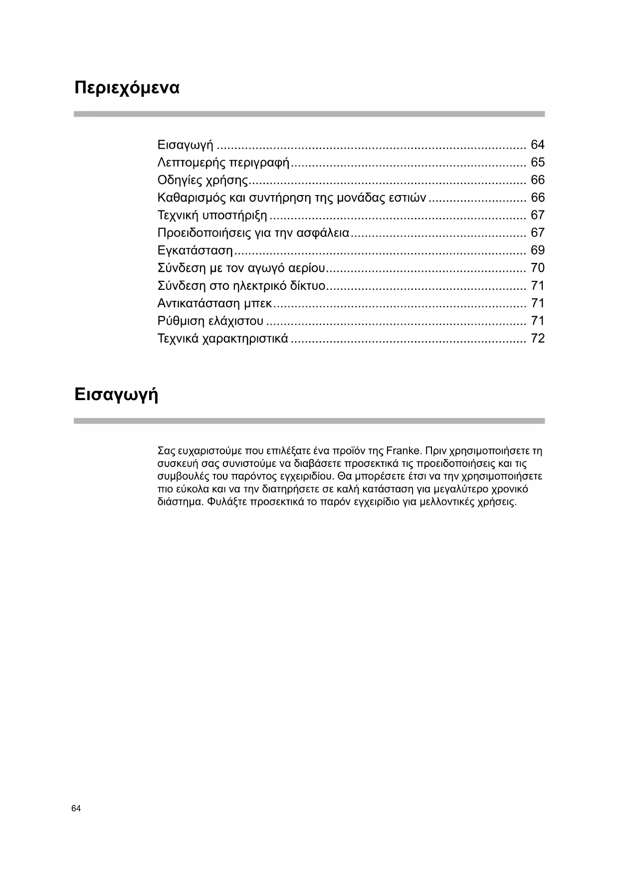 Σας ευχαριστούµε που επιλέξατε ένα προϊόν της Franke. Πριν χρησιµοποιήσετε τη συσκευή σας συνιστούµε να διαβάσετε προσεκτικά τις προειδοποιήσεις και τις συµβουλές του παρόντος εγχειριδίου. Θα µπορέσετε έτσι να την χρησιµοποιήσετε πιο εύκολα και να την διατηρήσετε σε καλή κατάσταση για µεγαλύτερο χρονικό διάστηµα. Φυλάξτε προσεκτικά το παρόν εγχειρίδιο για µελλοντικές χρήσεις.65 Λεπτοµερής περιγραφή Πίνακας χειριστηρίων