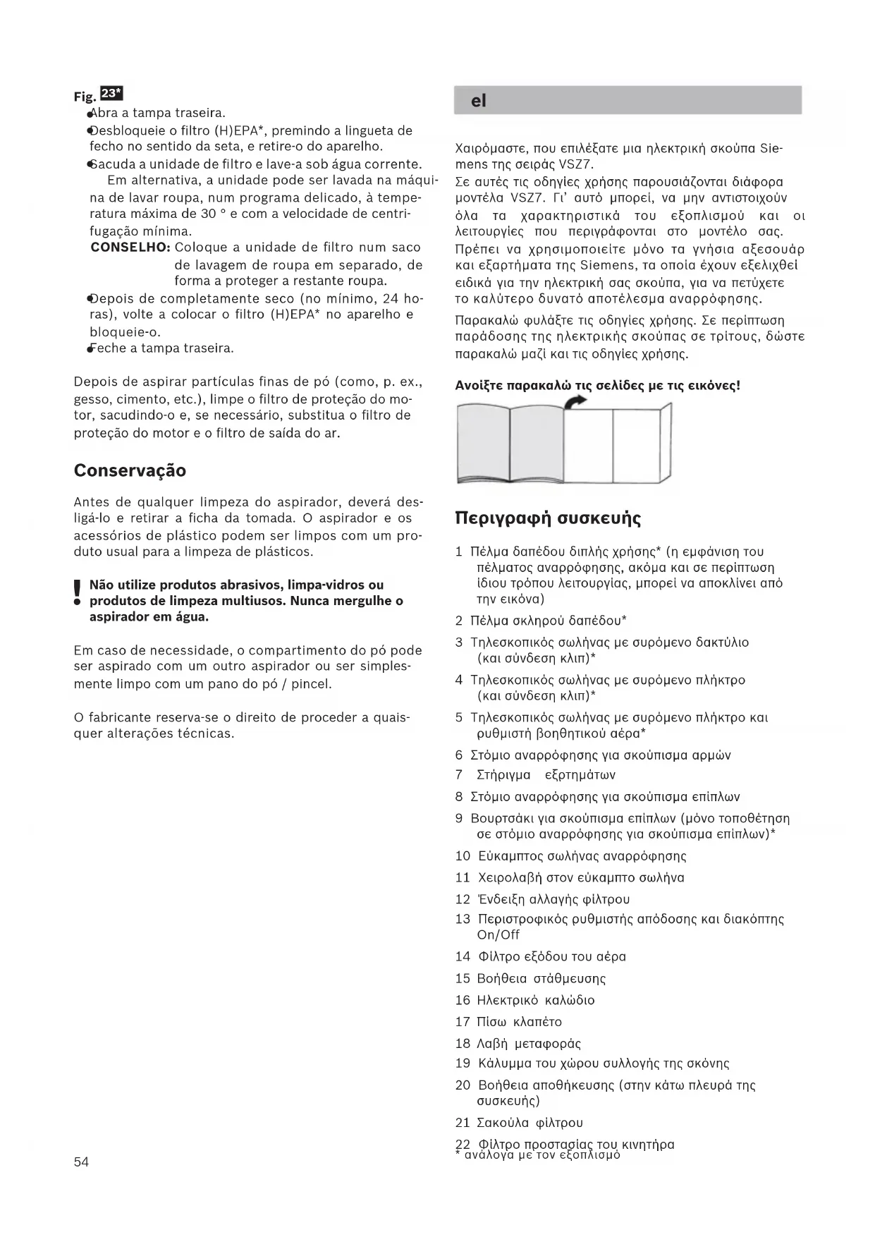 Χαιρόμαστε, που επιλέξατε μια ηλεκτρική σκούπα Sie- mens της σειράς VSZ7. Σε αυτές τις οδηγίες χρήσης παρουσιάζονται διάφορα μοντέλα VSZ7. Γι’ αυτό μπορεί, να μην αντιστοιχούν όλα τα χαρακτηριστικά του εξοπλισμού και οι λειτουργίες που περιγράφονται στο μοντέλο σας. Πρέπει να χρησιμοποιείτε μόνο τα γνήσια αξεσουάρ και εξαρτήματα της Siemens, τα οποία έχουν εξελιχθεί ειδικά για την ηλεκτρική σας σκούπα, για να πετύχετε το καλύτερο δυνατό αποτέλεσμα αναρρόφησης. Παρακαλώ φυλάξτε τις οδηγίες χρήσης. Σε περίπτωση παράδοσης της ηλεκτρικής σκούπας σε τρίτους, δώστε παρακαλώ μαζί και τις οδηγίες χρήσης. Ανοίξτε παρακαλώ τις σελίδες με τις εικόνες! Περιγραφή συσκευής 1 Πέλμα δαπέδου διπλής χρήσης* (η εμφάνιση του πέλματος αναρρόφησης, ακόμα και σε περίπτωση ίδιου τρόπου λειτουργίας, μπορεί να αποκλίνει από την εικόνα) 2 Πέλμα σκληρού δαπέδου* 3 Τηλεσκοπικός σωλήνας με συρόμενο δακτύλιο (και σύνδεση κλιπ)* 4 Τηλεσκοπικός σωλήνας με συρόμενο πλήκτρο (και σύνδεση κλιπ)* 5 Τηλεσκοπικός σωλήνας με συρόμενο πλήκτρο και ρυθμιστή βοηθητικού αέρα* 6 Στόμιο αναρρόφησης για σκούπισμα αρμών 7 Στήριγμα εξρτημάτων 8 Στόμιο αναρρόφησης για σκούπισμα επίπλων 9 Βουρτσάκι για σκούπισμα επίπλων (μόνο τοποθέτηση σε στόμιο αναρρόφησης για σκούπισμα επίπλων)* 10 Εύκαμπτος σωλήνας αναρρόφησης 11 Χειρολαβή στον εύκαμπτο σωλήνα 12 Ένδειξη αλλαγής φίλτρου 13 Περιστροφικός ρυθμιστής απόδοσης και διακόπτης On/Off 14 Φίλτρο εξόδου του αέρα 15 Βοήθεια στάθμευσης 16 Ηλεκτρικό καλώδιο 17 Πίσω κλαπέτο 18 Λαβή μεταφοράς 19 Κάλυμμα του χώρου συλλογής της σκόνης 20 Βοήθεια αποθήκευσης (στην κάτω πλευρά της