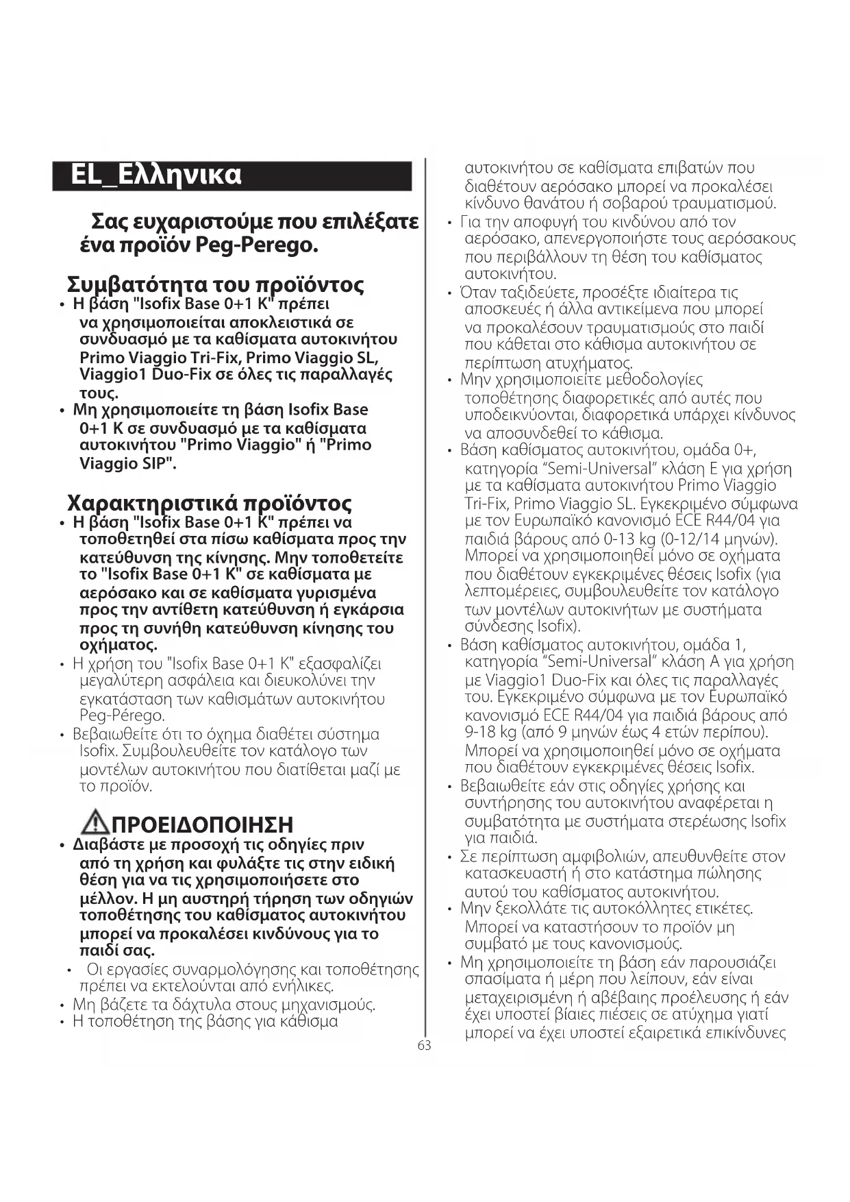- Η χρήση του "Isofix Base 0+1 K" εξασφαλίζει μεγαλύτερη ασφάλεια και διευκολύνει την εγκατάσταση των καθισμάτων αυτοκινήτου Peg-Pérego.