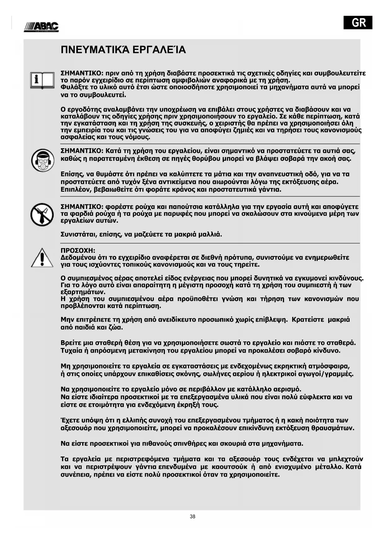 ΠΝΕΥΜΑΤΙΚΆ ΕΡΓΑΛΕΊΑ ΣΗΜΑΝΤΙΚΟ: πριν από τη χρήση διαβάστε προσεκτικά τις σχετικές οδηγίες και συμβουλευτείτε το παρόν εγχειρίδιο σε περίπτωση αμφιβολιών αναφορικά με τη χρήση. Φυλάξτε το υλικό αυτό έτσι ώστε οποιοσδήποτε χρησιμοποιεί τα μηχανήματα αυτά να μπορεί να το συμβουλευτεί. Ο εργοδότης αναλαμβάνει την υποχρέωση να επιβάλει στους χρήστες να διαβάσουν και να καταλάβουν τις οδηγίες χρήσης πριν χρησιμοποιήσουν το εργαλείο. Σε κάθε περίπτωση, κατά την εγκατάσταση και τη χρήση της συσκευής, ο χειριστής θα πρέπει να χρησιμοποιήσει όλη την εμπειρία του και τις γνώσεις του για να αποφύγει ζημιές και να τηρήσει τους κανονισμούς ασφαλείας και τους νόμους. ΣΗΜΑΝΤΙΚΟ: Κατά τη χρήση του εργαλείου, είναι σημαντικό να προστατεύετε τα αυτιά σας, καθώς η παρατεταμένη έκθεση σε πηγές θορύβου μπορεί να βλάψει σοβαρά την ακοή σας. Επίσης, να θυμάστε ότι πρέπει να καλύπτετε τα μάτια και την αναπνευστική οδό, για να τα προστατεύετε από τυχόν ξένα αντικείμενα που αιωρούνται λόγω της εκτόξευσης αέρα. Επιπλέον, βεβαιωθείτε ότι φοράτε κράνος και προστατευτικά γάντια. ΣΗΜΑΝΤΙΚΟ: φορέστε ρούχα και παπούτσια κατάλληλα για την εργασία αυτή και αποφύγετε τα φαρδιά ρούχα ή τα ρούχα με παρυφές που μπορεί να σκαλώσουν στα κινούμενα μέρη των εργαλείων αυτών. Συνιστάται, επίσης, να μαζεύετε τα μακριά μαλλιά.