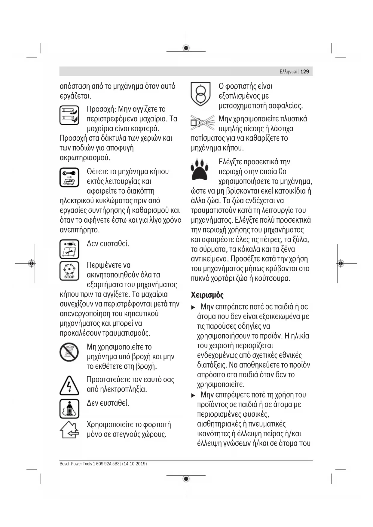 Προσέξτε να μην τραυματιστούν τα πλησίον ευρισκόμενα άτομα από εκσφενδονιζόμενα ξένα σώματα. Προειδοποίηση: Φροντίζετε να βρίσκεστε πάντα σε ασφαλή 1 609 92A 5BS | (14.10.2019) Bosch Power ToolsΕλληνικά | 129 απόσταση από το μηχάνημα όταν αυτό