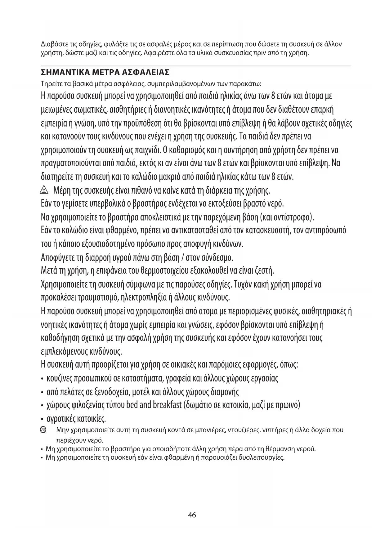 Τηρείτε τα βασικά μέτρα ασφάλειας, συμπεριλαμβανομένων των παρακάτω: Η παρούσα συσκευή μπορεί να χρησιμοποιηθεί από παιδιά ηλικίας άνω των 8 ετών και άτομα με μειωμένες σωματικές, αισθητήριες ή διανοητικές ικανότητες ή άτομα που δεν διαθέτουν επαρκή εμπειρία ή γνώση, υπό την προϋπόθεση ότι θα βρίσκονται υπό επίβλεψη ή θα λάβουν σχετικές οδηγίες και κατανοούν τους κινδύνους που ενέχει η χρήση της συσκευής. Τα παιδιά δεν πρέπει να χρησιμοποιούν τη συσκευή ως παιχνίδι. Ο καθαρισμός και η συντήρηση από χρήστη δεν πρέπει να πραγματοποιούνται από παιδιά, εκτός κι αν είναι άνω των 8 ετών και βρίσκονται υπό επίβλεψη. Να διατηρείτε τη συσκευή και το καλώδιο μακριά από παιδιά ηλικίας κάτω των 8 ετών. h Μέρη της συσκευής είναι πιθανό να καίνε κατά τη διάρκεια της χρήσης. Εάν το γεμίσετε υπερβολικά ο βραστήρας ενδέχεται να εκτοξεύσει βραστό νερό. Να χρησιμοποιείτε το βραστήρα αποκλειστικά με την παρεχόμενη βάση (και αντίστροφα). Εάν το καλώδιο είναι φθαρμένο, πρέπει να αντικατασταθεί από τον κατασκευαστή, τον αντιπρόσωπό του ή κάποιο εξουσιοδοτημένο πρόσωπο προς αποφυγή κινδύνων. Αποφύγετε τη διαρροή υγρού πάνω στη βάση / στον σύνδεσμο. Μετά τη χρήση, η επιφάνεια του θερμοστοιχείου εξακολουθεί να είναι ζεστή. Χρησιμοποιείτε τη συσκευή σύμφωνα με τις παρούσες οδηγίες. Τυχόν κακή χρήση μπορεί να προκαλέσει τραυματισμό, ηλεκτροπληξία ή άλλους κινδύνους. Η παρούσα συσκευή μπορεί να χρησιμοποιηθεί από άτομα με περιορισμένες φυσικές, αισθητηριακές ή νοητικές ικανότητες ή άτομα χωρίς εμπειρία και γνώσεις, εφόσον βρίσκονται υπό επίβλεψη ή καθοδήγηση σχετικά με την ασφαλή χρήση της συσκευής και εφόσον έχουν κατανοήσει τους εμπλεκόμενους κινδύνους. Η συσκευή αυτή προορίζεται για χρήση σε οικιακές και παρόμοιες εφαρμογές, όπως: