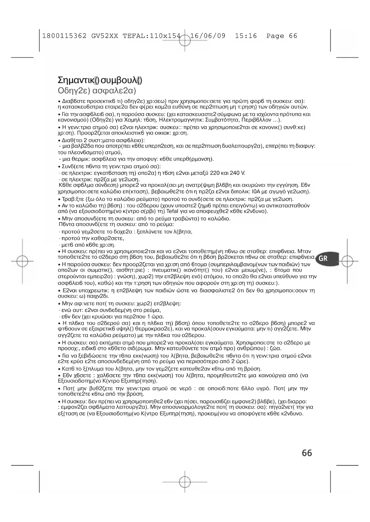 - Η συσκευ: δεν πρ(πει να χρησιµοποιηθε2 ε6ν (χει π(σει, παρουσι6ζει εµφανε2) βλ6βε), (χει διαρρο: : εµφαν2ζει σφ6λµατα λειτουργ2α). Μην αποσυναρµολογε2τε ποτ( τη συσκευ: σα): πηγα2νετ( την για εξ(ταση σε (να Εξουσιοδοτηµ(νο Κ(ντρο Εξυπηρ(τηση), προκειµ(νου να αποφ>γετε κ6θε κ2νδυνο. 1800115362 GV52XX TEFAL:110x154 16/06/09 15:16 Page 6667 Lock system Quelle eau Mettez centrale en route