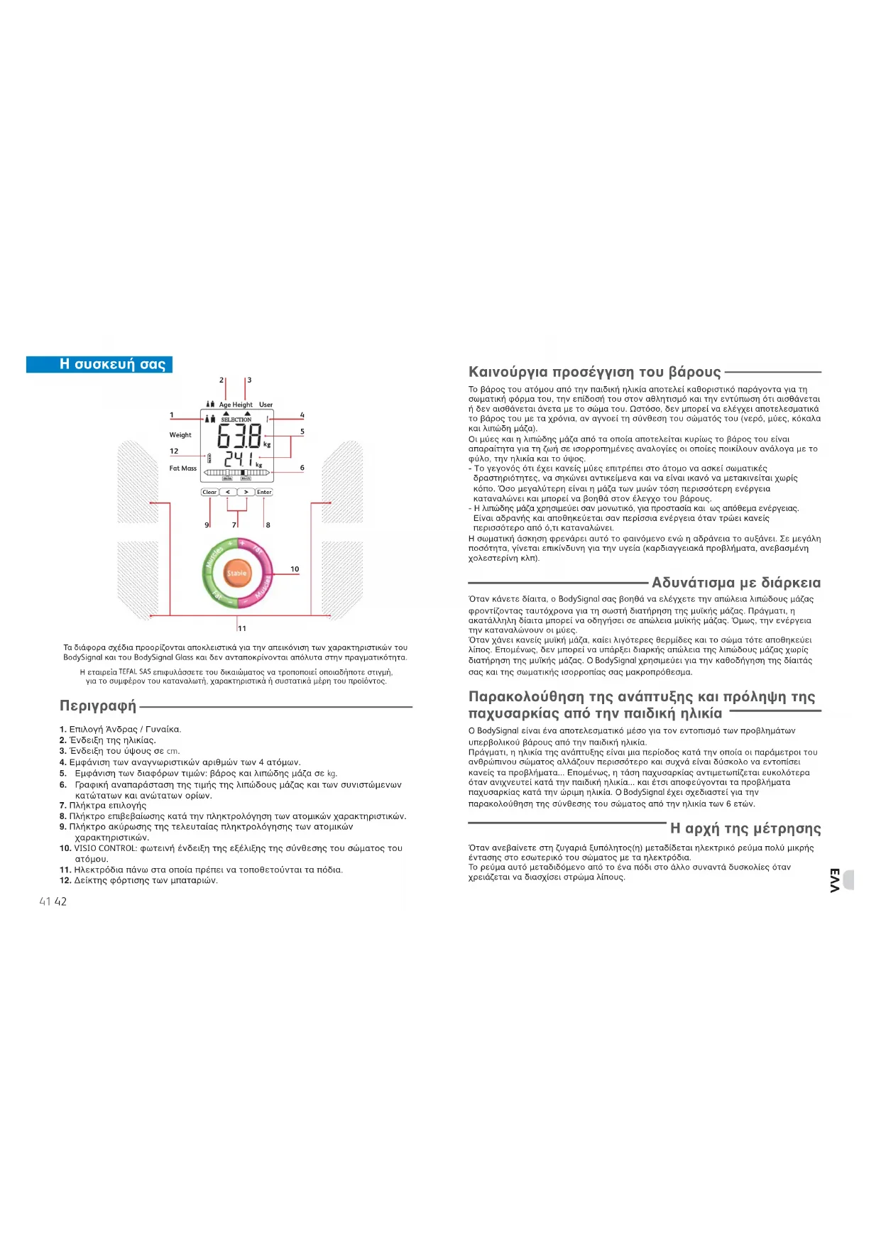 Τα διφορα σχ%δια προορζονται αποκλειστικ για την απεικνιση των χαρακτηριστικν του BodySignal και του BodySignal Glass και δεν ανταποκρνονται απλυτα στην πραγµατικτητα. Η εταιρεία TEFAL SASεπιφυλάσσετε του δικαιώµατος να τροποποιεί οποιαδήποτε στιγµή,για το συµφέρον του καταναλωτή, χαρακτηριστικά ή συστατικά µέρη του προϊντος. Καινοργια προσγγιση του βρους Το βρος του ατµου απ την παιδικ ηλικα αποτελε καθοριστικ παργοντα για τη σωµατικ φρµα του, την επδοσ του στον αθλητισµ και την εντπωση τι αισθνεται δεν αισθνεται νετα µε το σµα του. Ωστσο, δεν µπορε να ελ%γχει αποτελεσµατικ το βρος του µε τα χρνια, αν αγνοε τη σνθεση του σµατς του (νερ, µες, κκαλα και λιπδη µζα). Οι µες και η λιπδης µζα απ τα οποα αποτελεται κυρως το βρος του εναι απαρατητα για τη ζω σε ισορροπηµ%νες αναλογες οι οποες ποικλουν ανλογα µε το φλο, την ηλικα και το ψος. - Το γεγονς τι %χει κανες µες επιτρ%πει στο τοµο να ασκε σωµατικ%ς δραστηριτητες, να σηκνει αντικεµενα και να εναι ικαν να µετακινεται χωρς κπο. 1σο µεγαλτερη εναι η µζα των µυν τση περισστερη εν%ργεια καταναλνει και µπορε να βοηθ στον %λεγχο του βρους. - Η λιπδης µζα χρησιµεει σαν µονωτικ, για προστασα και ως απθεµα εν%ργειας. Εναι αδρανς και αποθηκεεται σαν περσσια εν%ργεια ταν τρει κανες περισστερο απ ,τι καταναλνει. Η σωµατικ σκηση φρενρει αυτ το φαινµενο εν η αδρνεια το αυξνει. Σε µεγλη ποστητα, γνεται επικνδυνη για την υγεα (καρδιαγγειακ προβλµατα, ανεβασµ%νη χολεστερνη κλπ). Αδυντισµα µε διρκεια 1ταν κνετε δαιτα, ο BodySignal σας βοηθ να ελ%γχετε την απλεια λιπδους µζας φροντζοντας ταυτχρονα για τη σωστ διατρηση της µυϊκς µζας. Πργµατι, η ακατλληλη δαιτα µπορε να οδηγσει σε απλεια µυϊκς µζας. 1µως, την εν%ργεια την καταναλνουν οι µες. 1ταν χνει κανες µυϊκ µζα, καει λιγτερες θερµδες και το σµα ττε αποθηκεει λπος. Εποµ%νως, δεν µπορε να υπρξει διαρκς απλεια της λιπδους µζας χωρς διατρηση της µυϊκς µζας. Ο BodySignal χρησιµεει για την καθοδγηση της δαιτς σας και της σωµατικς ισορροπας σας µακροπρθεσµα. Παρακολοθηση της ανπτυξης και πρληψη της παχυσαρκ!ας απ την παιδικ ηλικ!α Ο BodySignal εναι %να αποτελεσµατικ µ%σο για τον εντοπισµ των προβληµτων υπερβολικο βρους απ την παιδικ ηλικα. Πργµατι, η ηλικα της ανπτυξης εναι µια περοδος κατ την οποα οι παρµετροι του ανθρπινου σµατος αλλζουν περισστερο και συχν εναι δσκολο να εντοπσει κανες τα προβλµατα... Εποµ%νως, η τση παχυσαρκας αντιµετωπζεται ευκολτερα ταν ανιχνευτε κατ την παιδικ ηλικα... και %τσι αποφεγονται τα προβλµατα παχυσαρκας κατ την ριµη ηλικα. Ο BodySignal %χει σχεδιαστε για την παρακολοθηση της σνθεσης του σµατος απ την ηλικα των 6 ετν. Η αρχ της µτρησης 1ταν ανεβανετε στη ζυγαρι ξυπλητος(η) µεταδδεται ηλεκτρικ ρεµα πολ µικρς %ντασης στο εσωτερικ του σµατος µε τα ηλεκτρδια. Το ρεµα αυτ µεταδιδµενο απ το %να πδι στο λλο συναντ δυσκολες ταν χρειζεται να διασχσει στρµα λπους. 41 42EVV Οι λειτουργ!ες του BODYSIGNAL Το BodySignal παρχει εξατοµικευµνη παρακολοθηση: