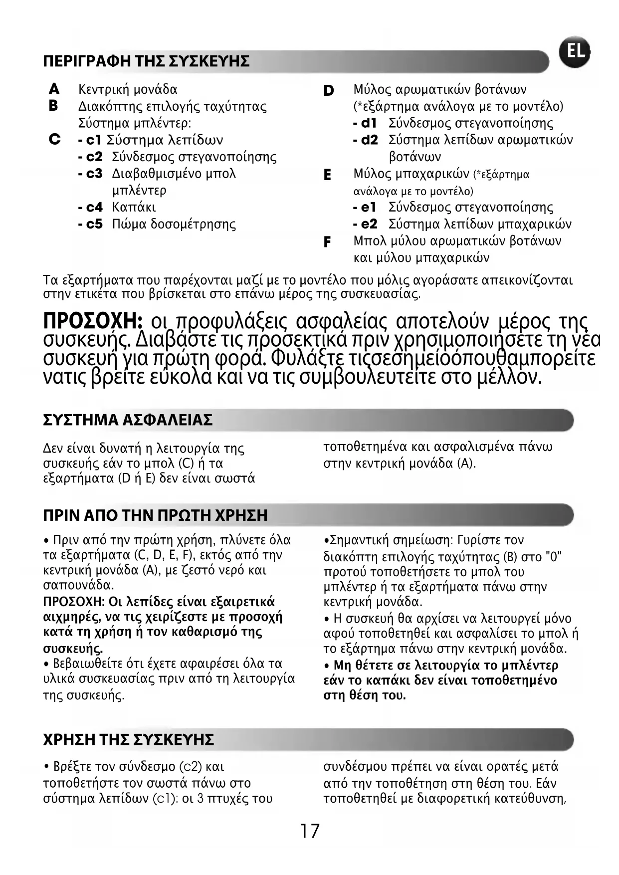 Μύλος αρωματικών βοτάνων(*εξάρτημα ανάλογα με το μοντέλο) - d1 Σύνδεσμος στεγανοποίησης - d2 Σύστημα λεπίδων αρωματικώνβοτάνωνΜύλος μπαχαρικών (*εξάρτημαανάλογα με το μοντέλο) - e1 Σύνδεσμος στεγανοποίησης - e2 Σύστημα λεπίδων μπαχαρικώνΜπολ μύλου αρωματικών βοτάνωνκαι μύλου μπαχαρικών Τα εξαρτήματα που παρέχονται μαζί με το μοντέλο που μόλις αγοράσατε απεικονίζονται στην ετικέτα που βρίσκεται στο επάνω μέρος της συσκευασίας. ΠΡΟΣΟΧΗ: οι προφυλάξεις ασφαλείας αποτελούν μέρος της συσκευής. Διαβάστε τις προσεκτικά πριν χρησιμοποιήσετε τη νέα σας συσκευή για πρώτη φορά. Φυλάξτε τιςσεσημείοόπουθαμπορείτε νατις βρείτε εύκολα και να τις συμβουλευτείτε στο μέλλον. ΣΥΣΤΗΜΑ ΑΣΦΑΛΕΙΑΣ ΠΡΙΝ ΑΠΟ ΤΗΝ ΠΡΩΤΗ ΧΡΗΣΗ Δεν είναι δυνατή η λειτουργία τηςσυσκευής εάν το μπολ (C) ή ταεξαρτήματα (D ή E) δεν είναι σωστάτοποθετημένα και ασφαλισμένα πάνωστην κεντρική μονάδα (A). ΧΡΗΣΗ ΤΗΣ ΣΥΣΚΕΥΗΣ