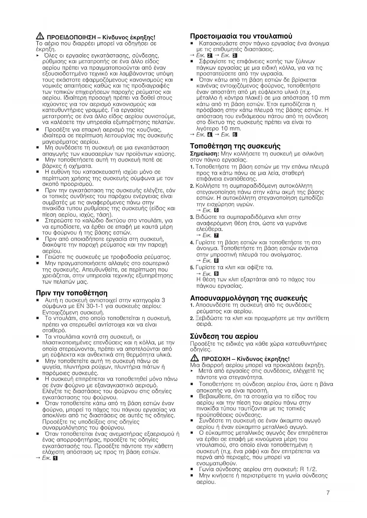 Ασφαλής συναρμολόγηση Προσέξτε αυτές τις υποδείξεις ασφαλείας, όταν συναρμολογείτε τη συσκευή. ¡ Διαβάστε προσεκτικά αυτές τις οδηγίες. ¡ Οι εικόνες που υπάρχουν σ'αυτές τις οδηγίες είναι μόνο ενδεικτικές. ¡ Μόνο με τη σωστή τοποθέτηση σύμφωνα με τις οδηγίες τοποθέτησης διασφαλίζεται η ασφάλεια κατά τη χρήση. Ο εγκαταστάτης είναι υπεύθυνος για την άψογη λειτουργία στη θέση τοποθέτησης.7 ΠΡΟΕΙΔΟΠΟΙΗΣΗ‒Κίνδυνος έκρηξης! Το αέριο που διαρρέει μπορεί να οδηγήσει σε