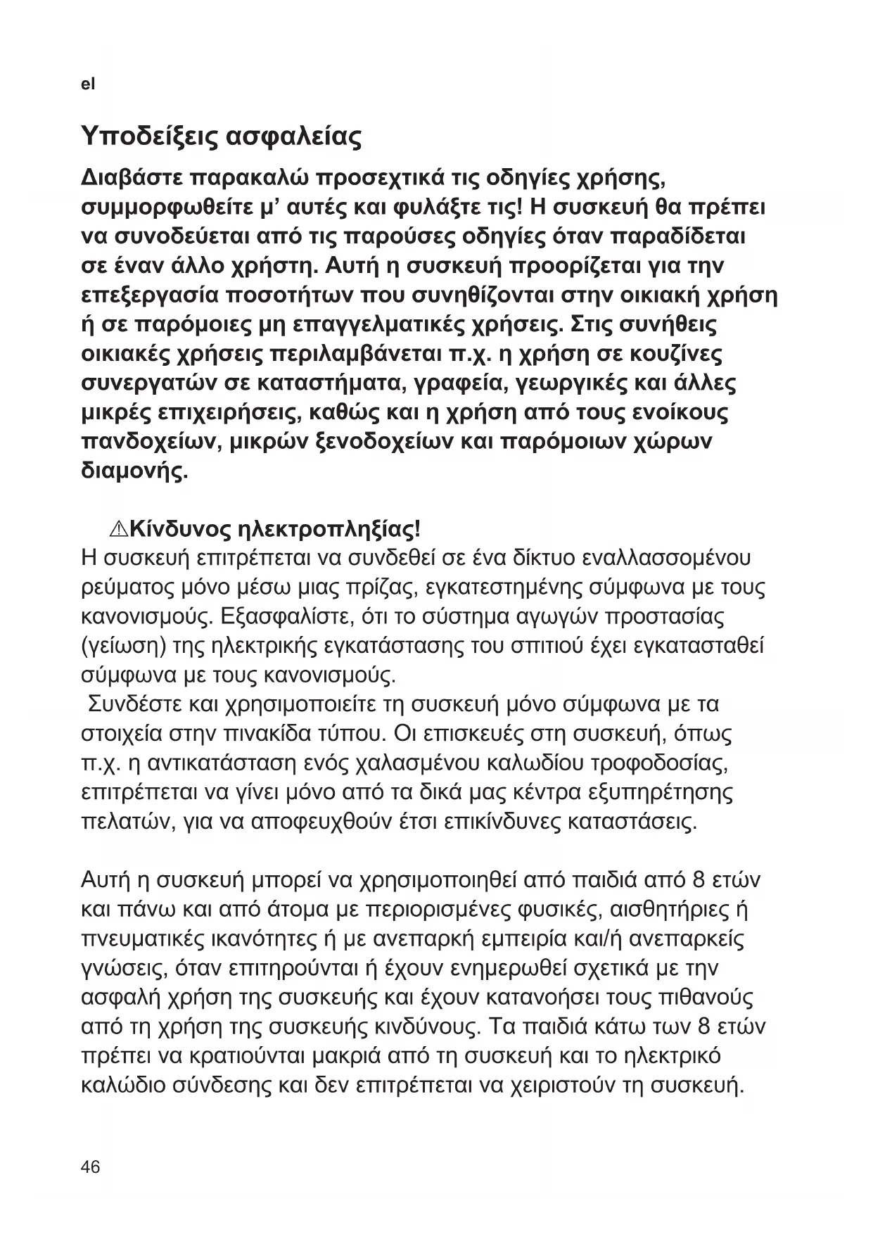 ¡ Κίνδυνοςηλεκτροπληξίας! Η συσκευή επιτρέπεται να συνδεθεί σε ένα δίκτυο εναλλασσομένου ρεύματος μόνο μέσω μιας πρίζας, εγκατεστημένης σύμφωνα με τους κανονισμούς. Εξασφαλίστε, ότι το σύστημα αγωγών προστασίας (γείωση) της ηλεκτρικής εγκατάστασης του σπιτιού έχει εγκατασταθεί σύμφωνα με τους κανονισμούς. Συνδέστε και χρησιμοποιείτε τη συσκευή μόνο σύμφωνα με τα στοιχεία στην πινακίδα τύπου. Οι επισκευές στη συσκευή, όπως π.χ. η αντικατάσταση ενός χαλασμένου καλωδίου τροφοδοσίας, επιτρέπεται να γίνει μόνο από τα δικά μας κέντρα εξυπηρέτησης πελατών, για να αποφευχθούν έτσι επικίνδυνες καταστάσεις. Αυτή η συσκευή μπορεί να χρησιμοποιηθεί από παιδιά από 8 ετών και πάνω και από άτομα με περιορισμένες φυσικές, αισθητήριες ή πνευματικές ικανότητες ή με ανεπαρκή εμπειρία και/ή ανεπαρκείς γνώσεις, όταν επιτηρούνται ή έχουν ενημερωθεί σχετικά με την ασφαλή χρήση της συσκευής και έχουν κατανοήσει τους πιθανούς από τη χρήση της συσκευής κινδύνους. Τα παιδιά κάτω των 8 ετών πρέπει να κρατιούνται μακριά από τη συσκευή και το ηλεκτρικό καλώδιο σύνδεσης και δεν επιτρέπεται να χειριστούν τη συσκευή.47